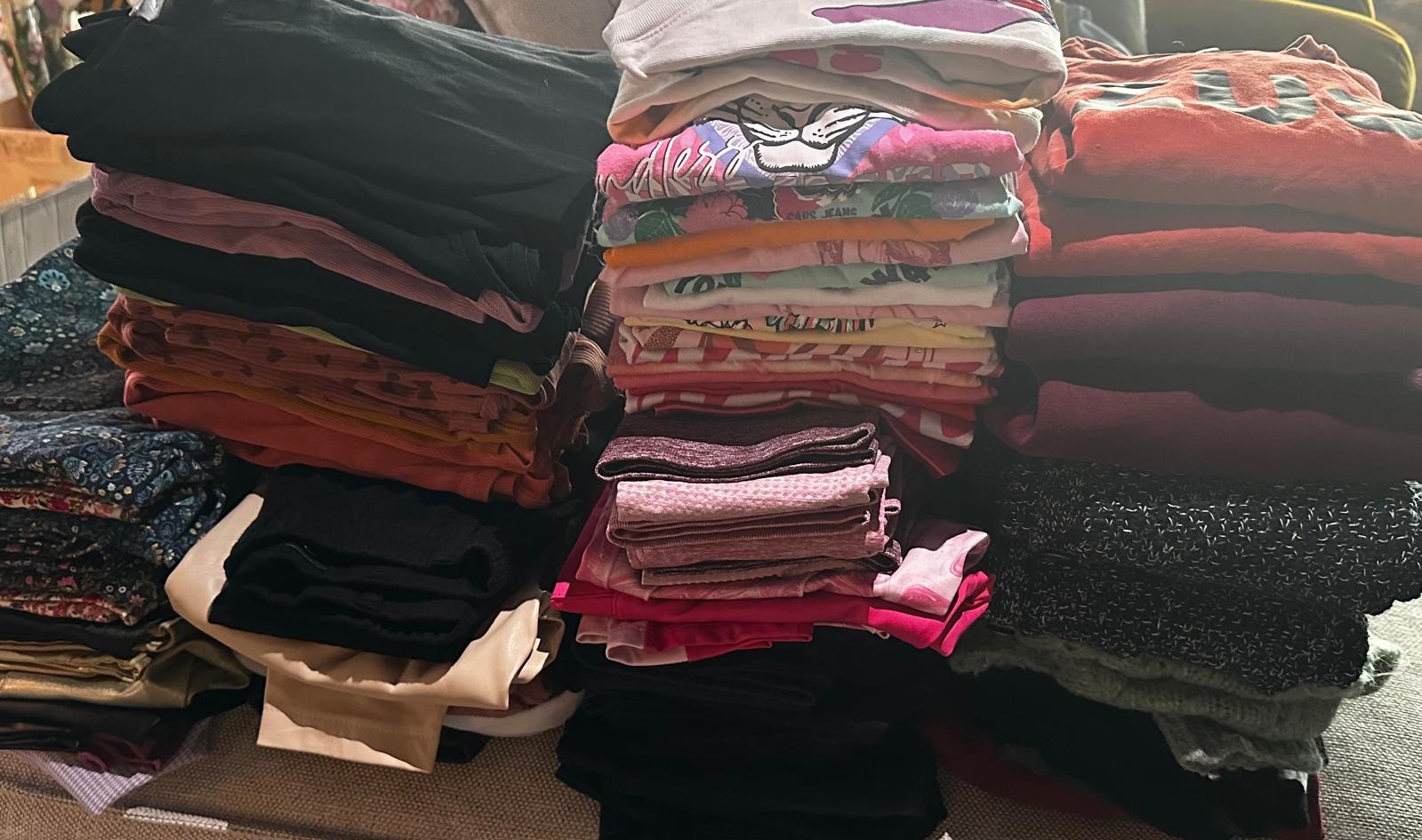 كومة كبيرة من الملابس للبنات من سن 7 إلى 10 سنوات. مستعملة ولكنها في حالة جيدة. غير مخصصة للبيع.