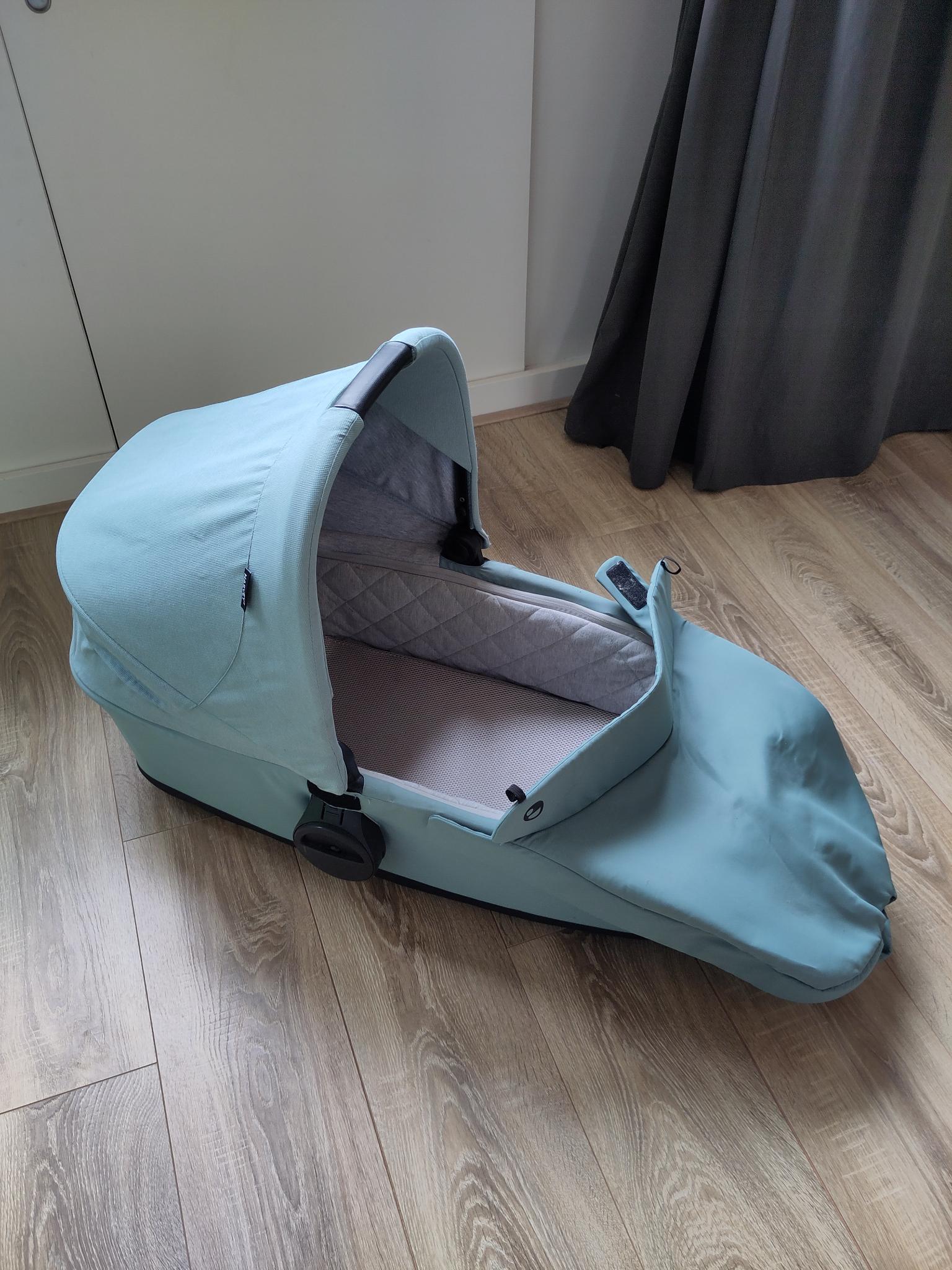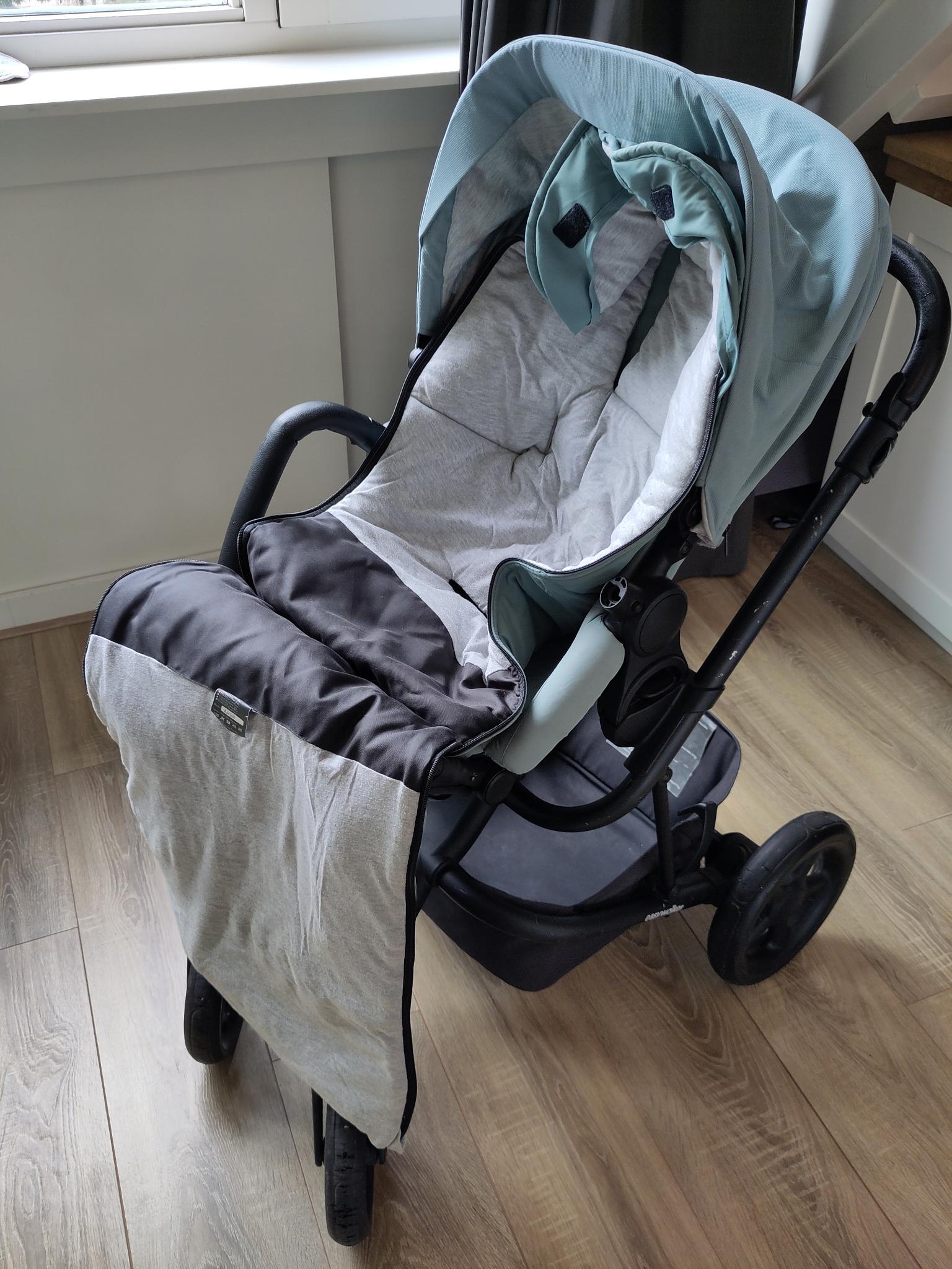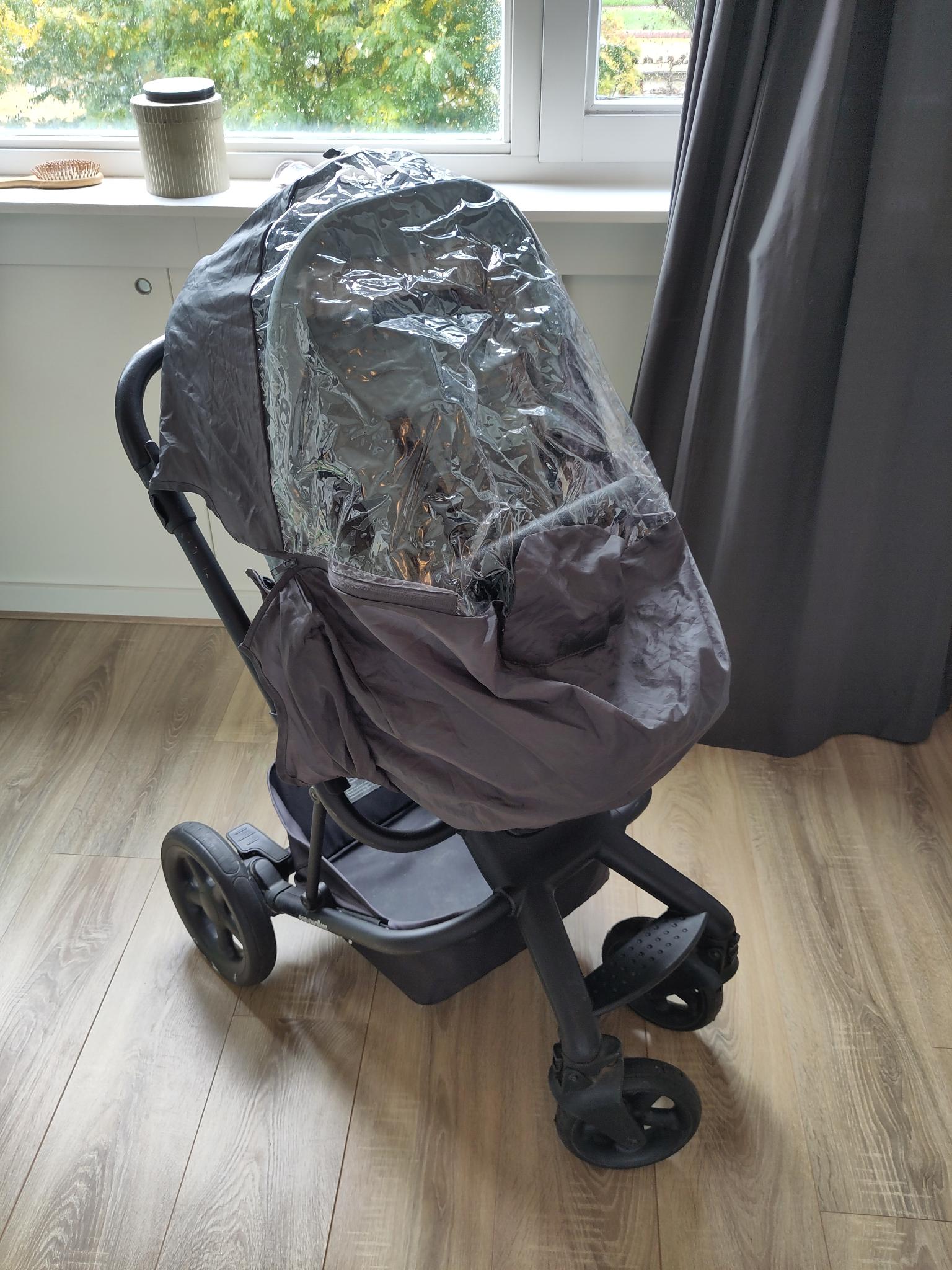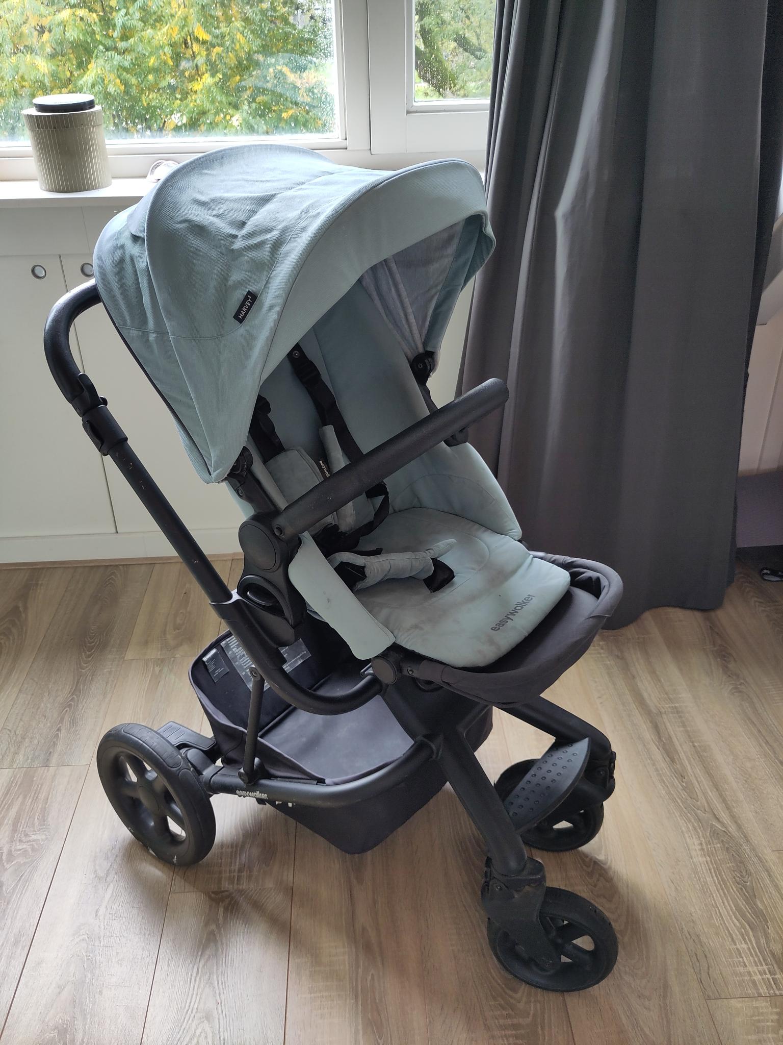 عربة أطفال إيزي ووكر مع سرير محمول وعربة أطفال، يمكن وضع العربة للأمام أو الخلف. كلاهما مزود بغطاء مطر وكيس نوم دافئ. بها بعض التلف، لكنها صالحة للاستخدام لاحقًا.