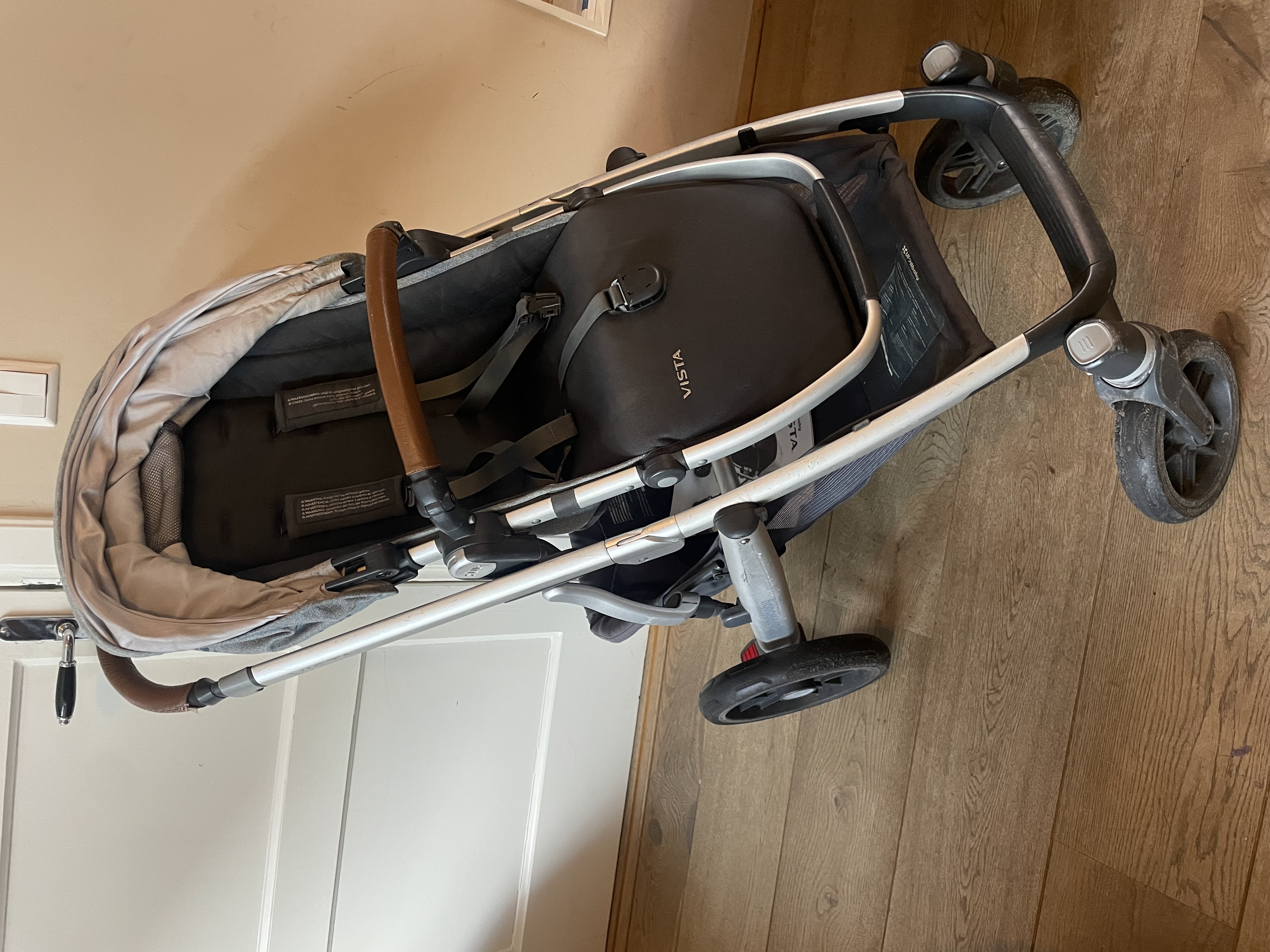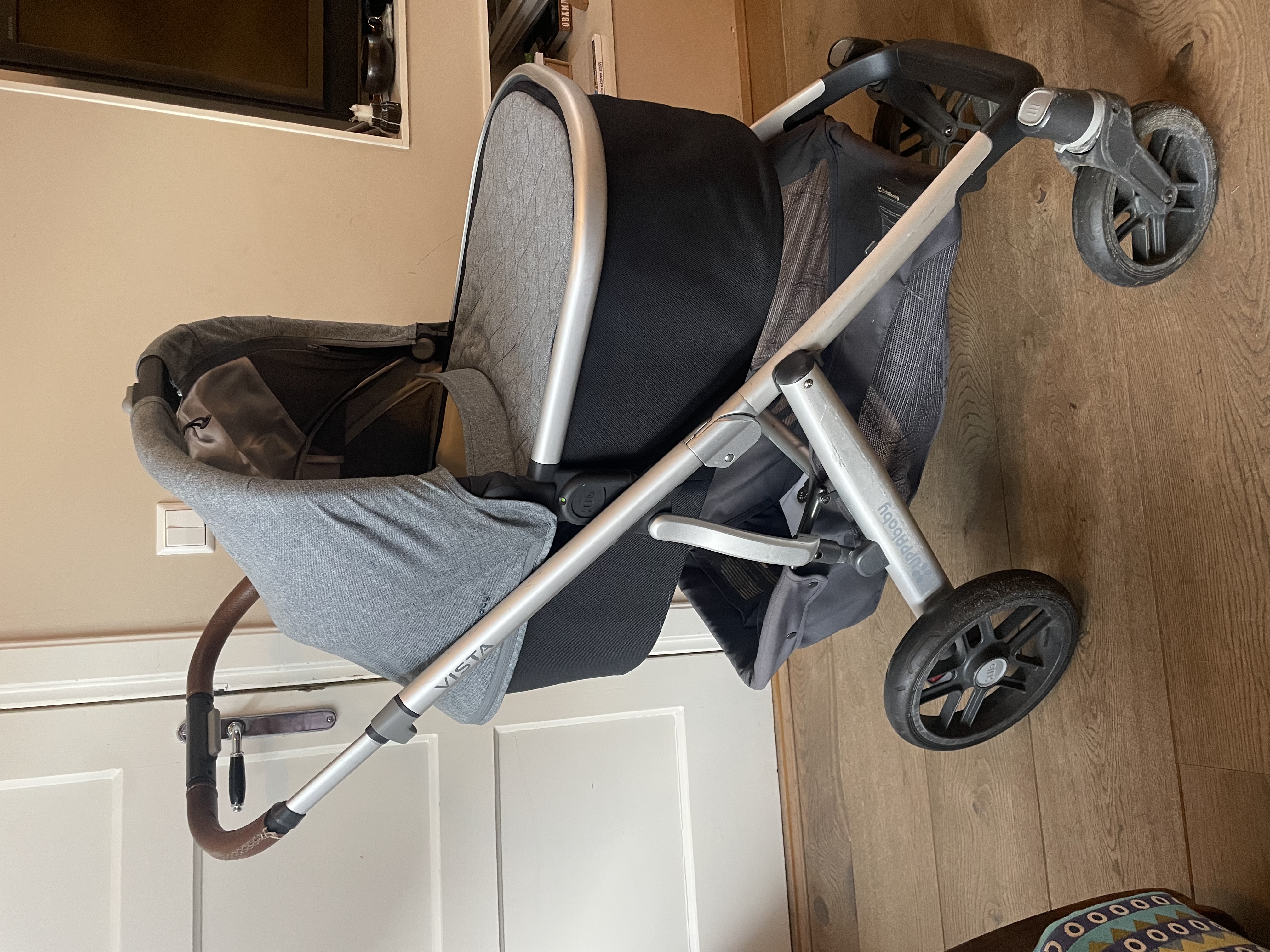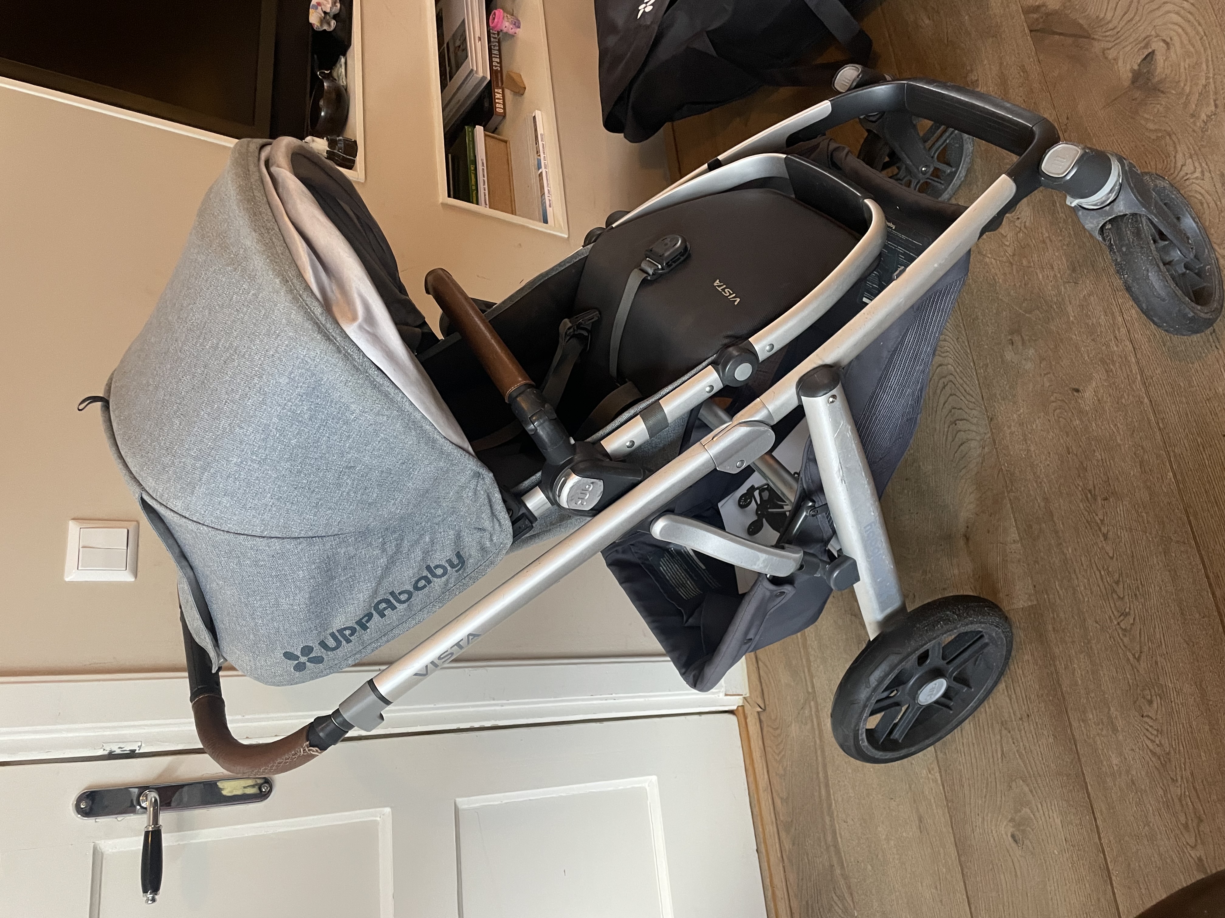 عربة أطفال Uppababy Vista مستعملة بحالة ممتازة. استمتعتُ باستخدامها لطفلين. هيكلها كبير نوعًا ما، لكنه مثالي للأشخاص طوال القامة لعدم وجود قضيب منخفض. كما أن المقبض قابل للتمديد، مما يُسهّل الأمر على الأشخاص طوال القامة. من مزايا هذه العربة أيضًا سلة التسوق الكبيرة وإمكانية إضافة مقعد لطفل ثانٍ. هذا يسمح بنقل رضيع وطفل صغير في نفس الوقت، أو توأمين. لا يشمل العرض وصلة التوصيل اللازمة. تتضمن المجموعة غطاءً واقيًا من المطر لقسم الرضيع، وناموسيتين للقسمين، وغطاءً للقدمين لمقعد الطفل الصغير. استُخدمت العربة كثيرًا لكنها لا تزال بحالة جيدة. يظهر على المقبض آثار الاستخدام، لكنه لا يزال سليمًا. تتوفر صور إضافية عند الطلب؛ كما أن العربة معروضة للبيع على موقع Marktplaats، حيث الشحن مجاني.