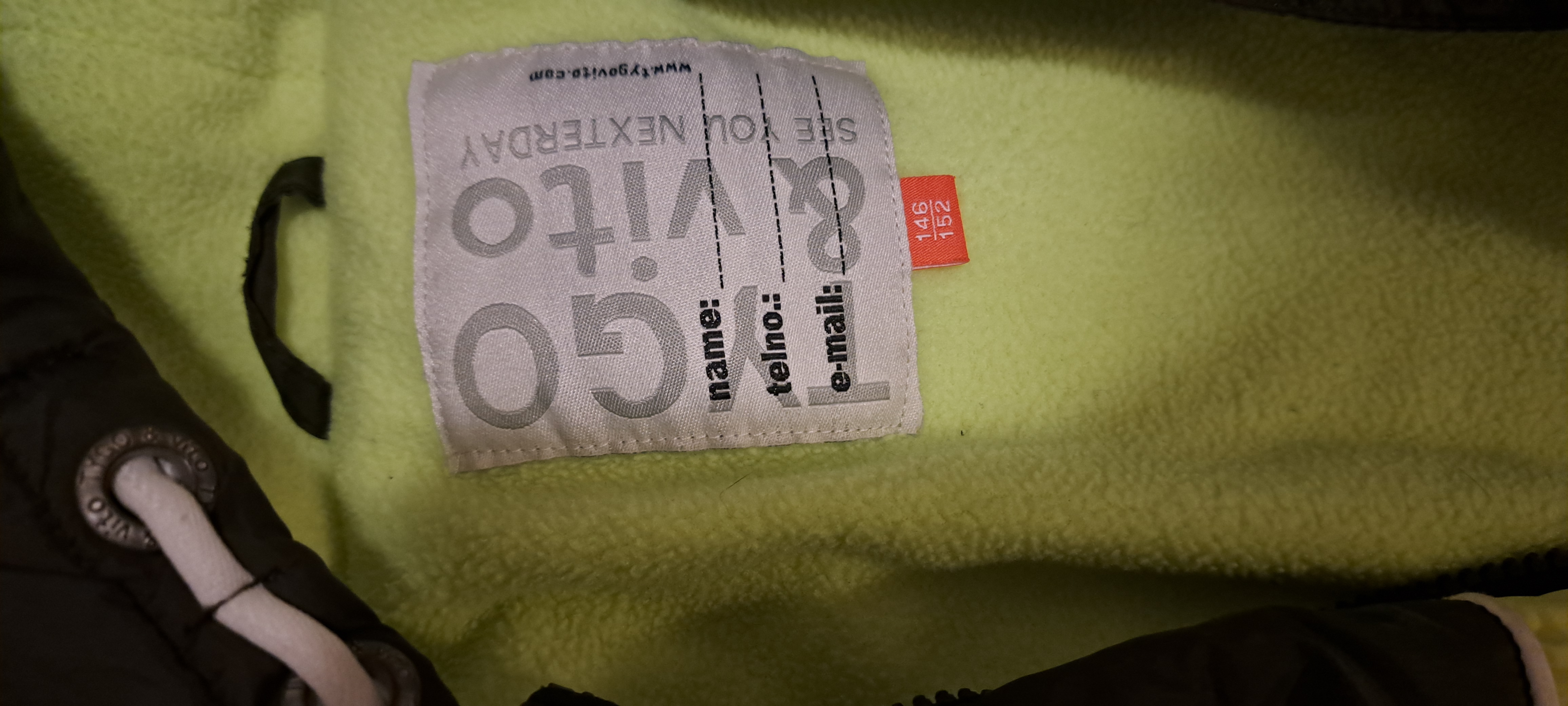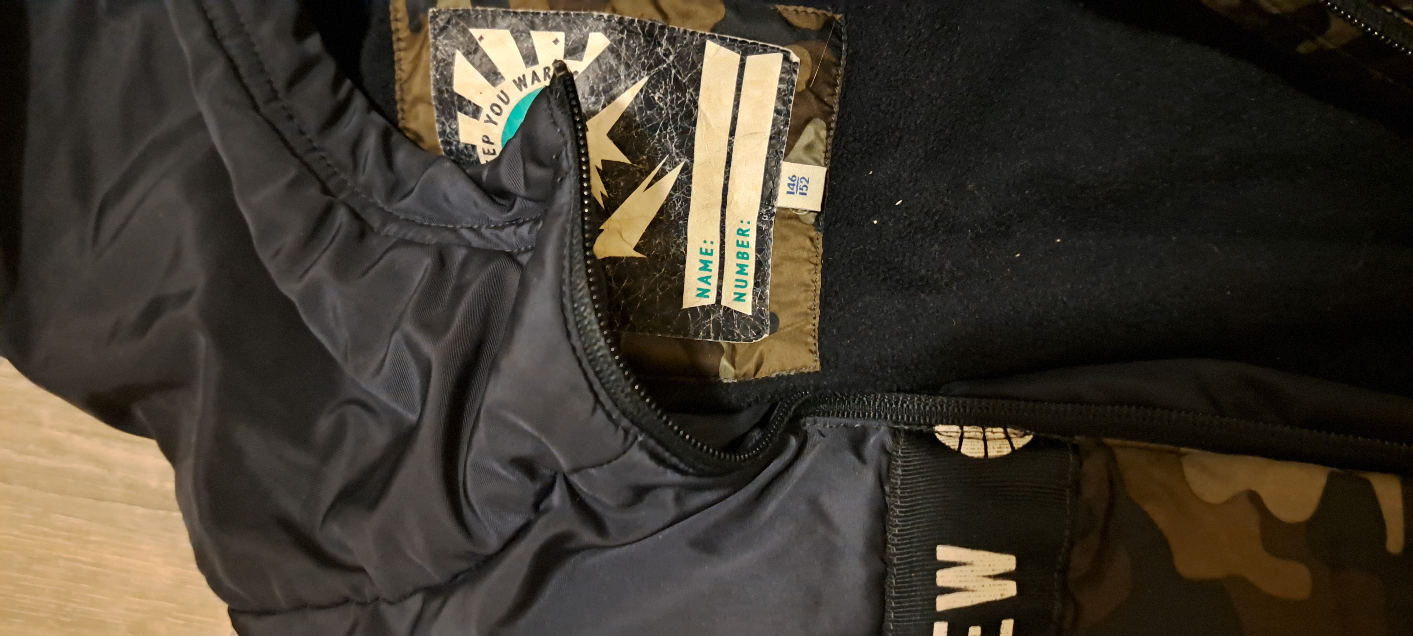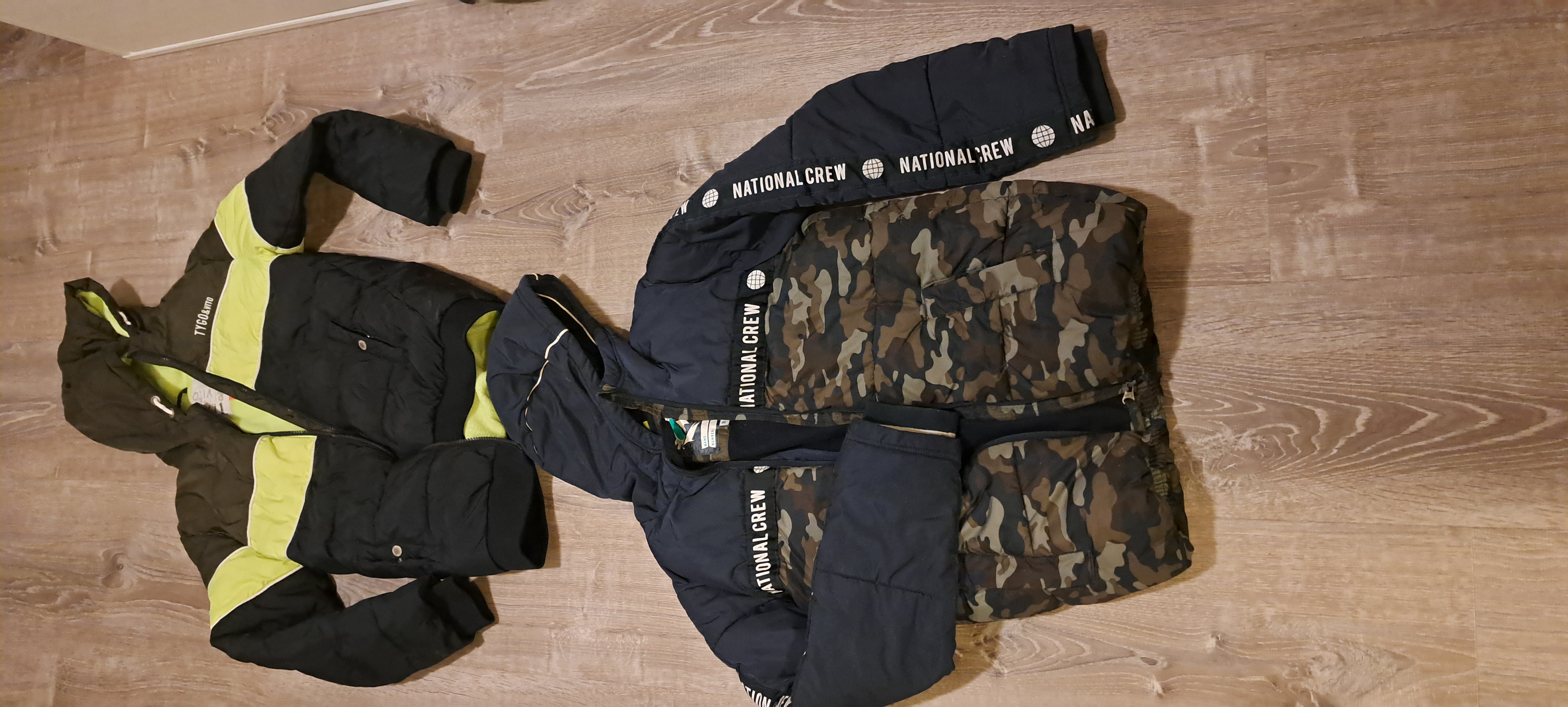 Two barely worn, reasonably rainproof winter jackets with hoods. One jacket by Tygo & Vito: greenish hues and a somewhat reflective yellow-green stripe; one jacket by National Crew: blue with a partial combat pattern.