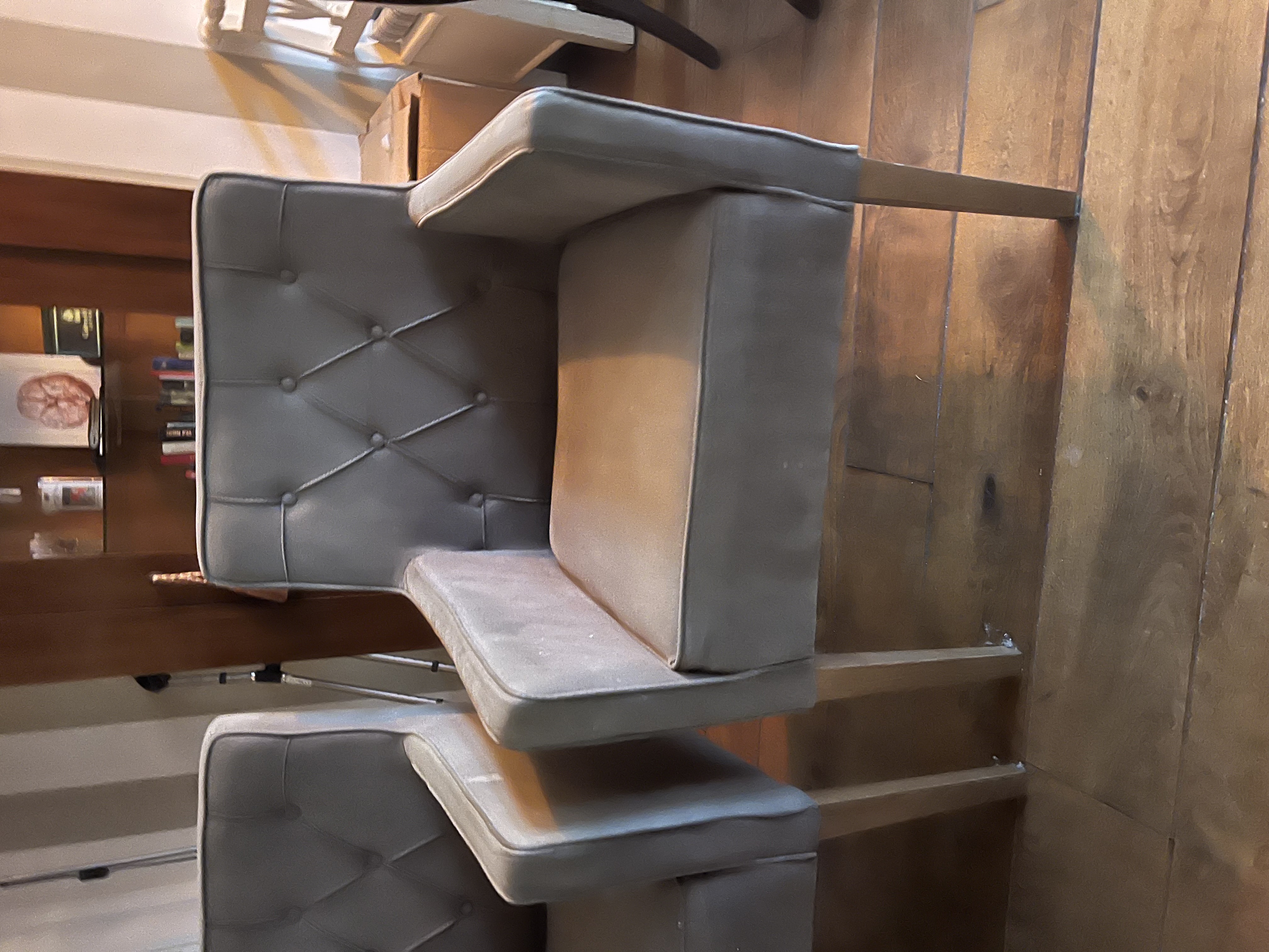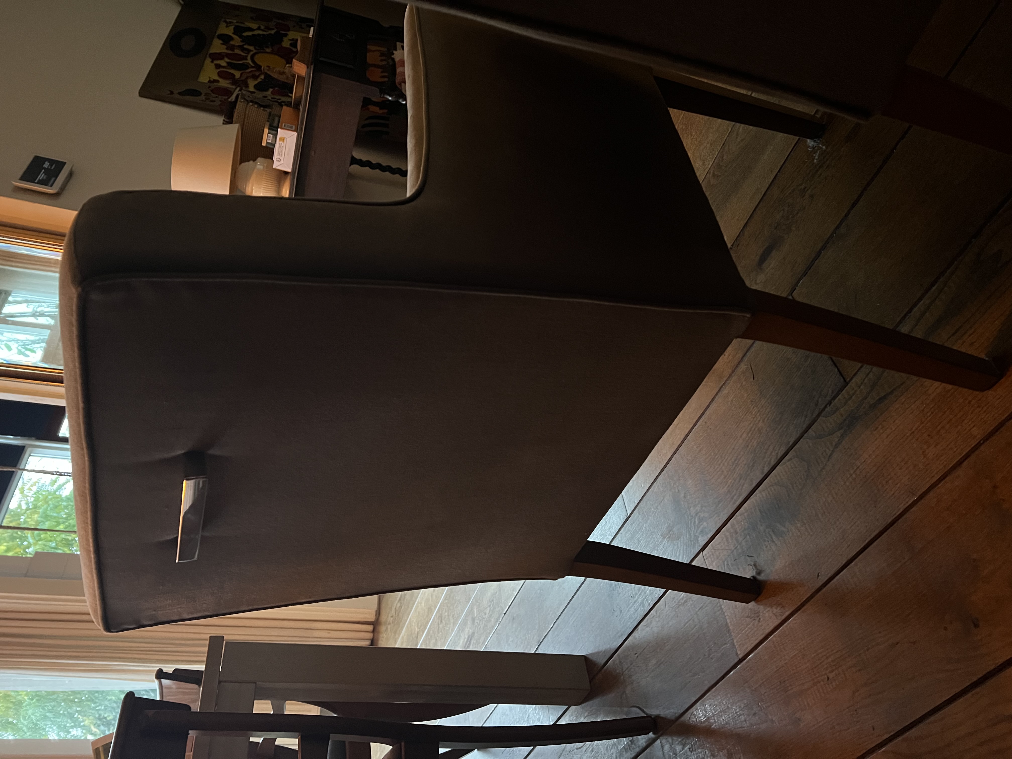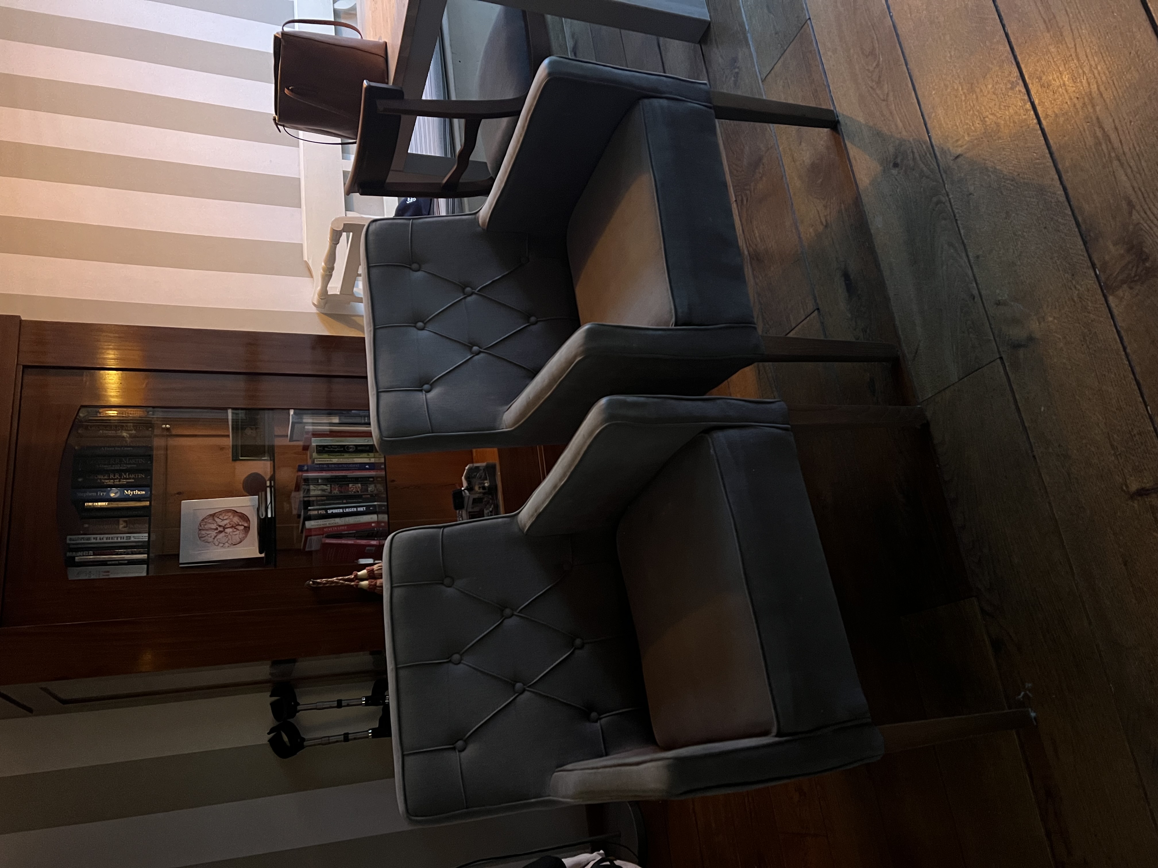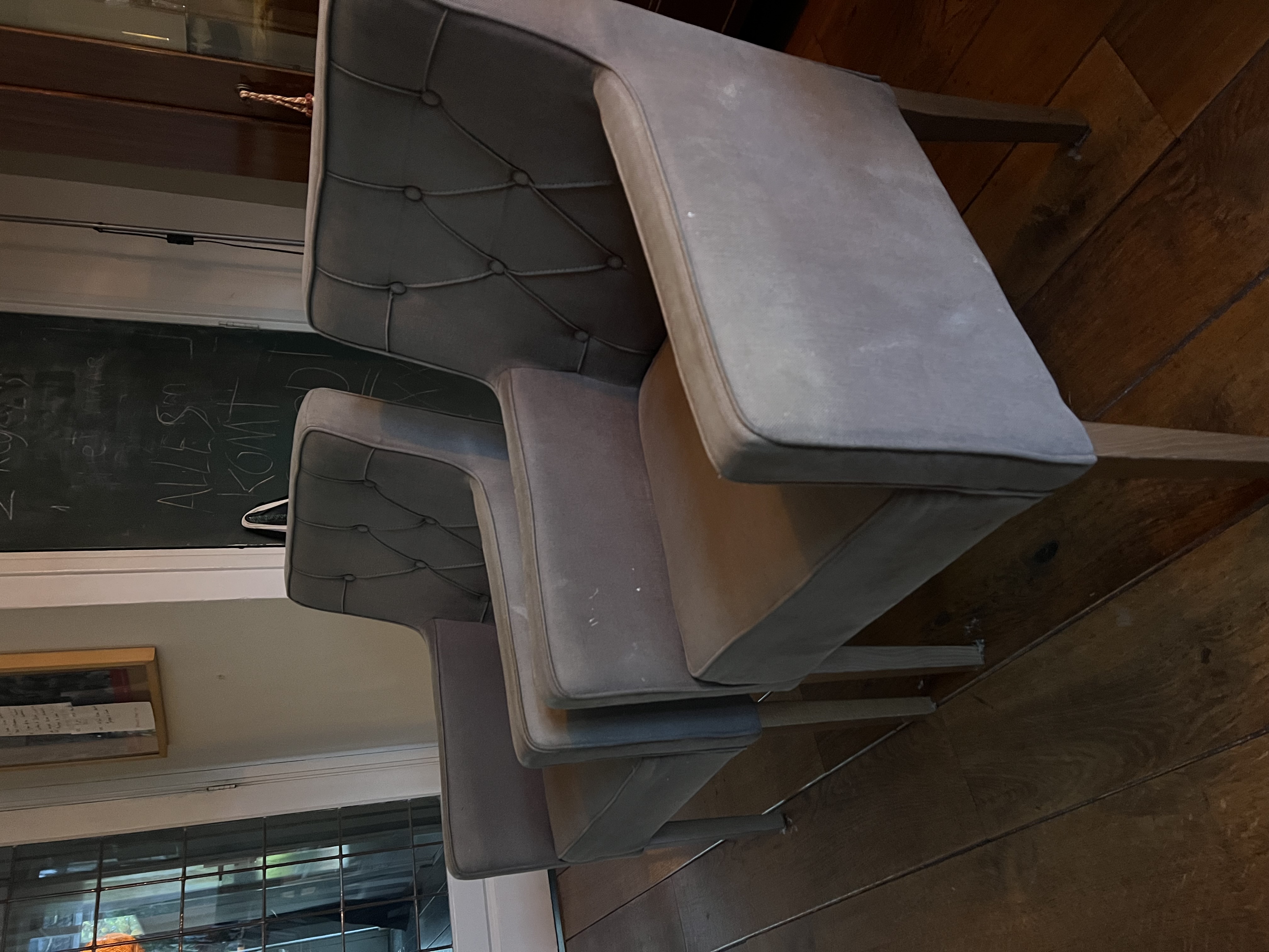 Set of four comfortable dining chairs. The chairs have soft upholstery and a sturdy frame. They are ideal for long dinners and cozy evenings. The chairs are in good condition, with minor signs of wear and some discoloration. Dimensions: (approximately) 50cm wide, 55cm deep, 85cm high. Armrests 65cm high. Pick-up only.
