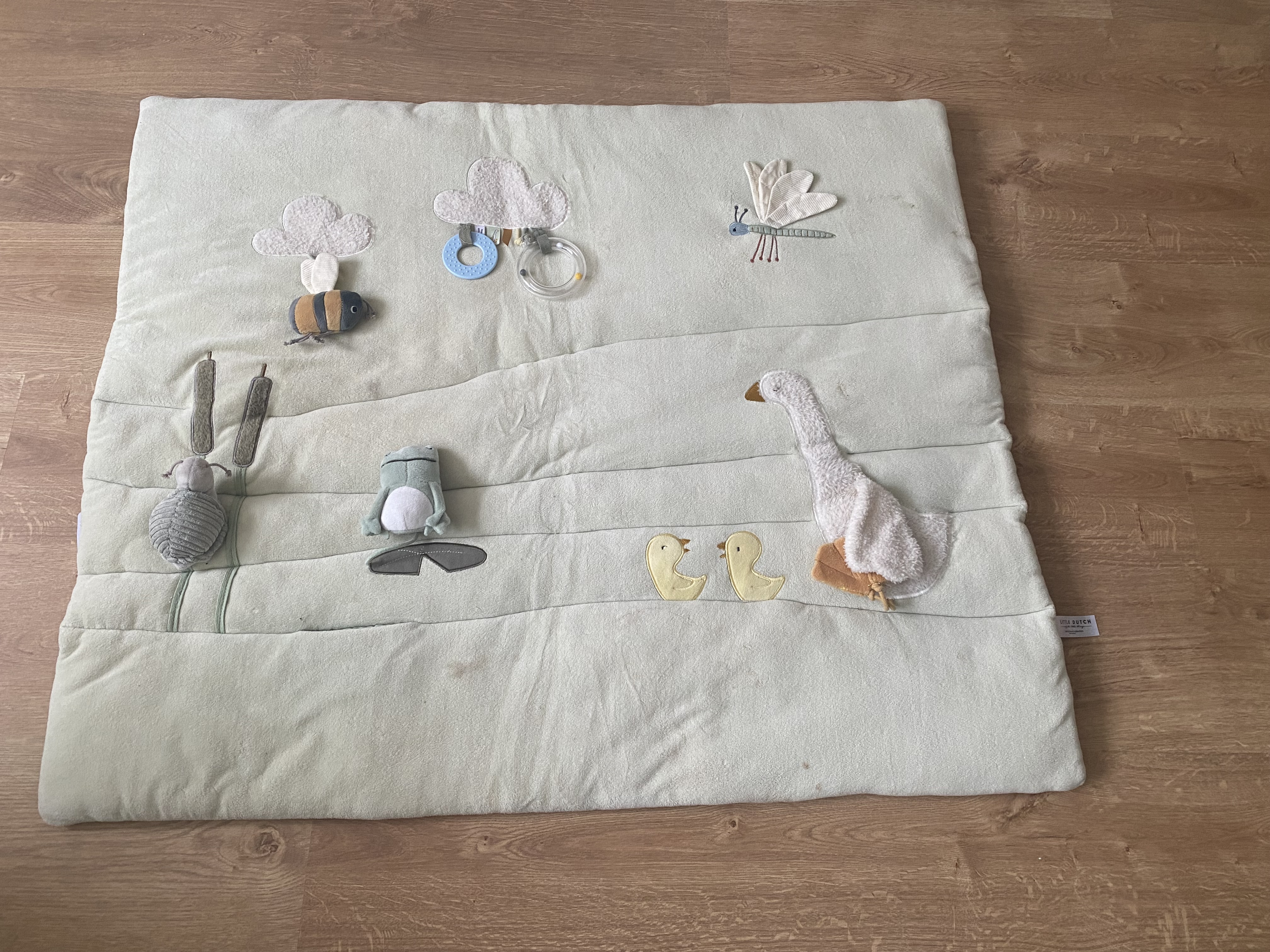 Soft, padded playpen mat from Little Dutch's Little Farm collection in mint green. The mat features various textures and activities to stimulate your little one. Dimensions: 80x100 cm. Ideal for use in the playpen or for playing.