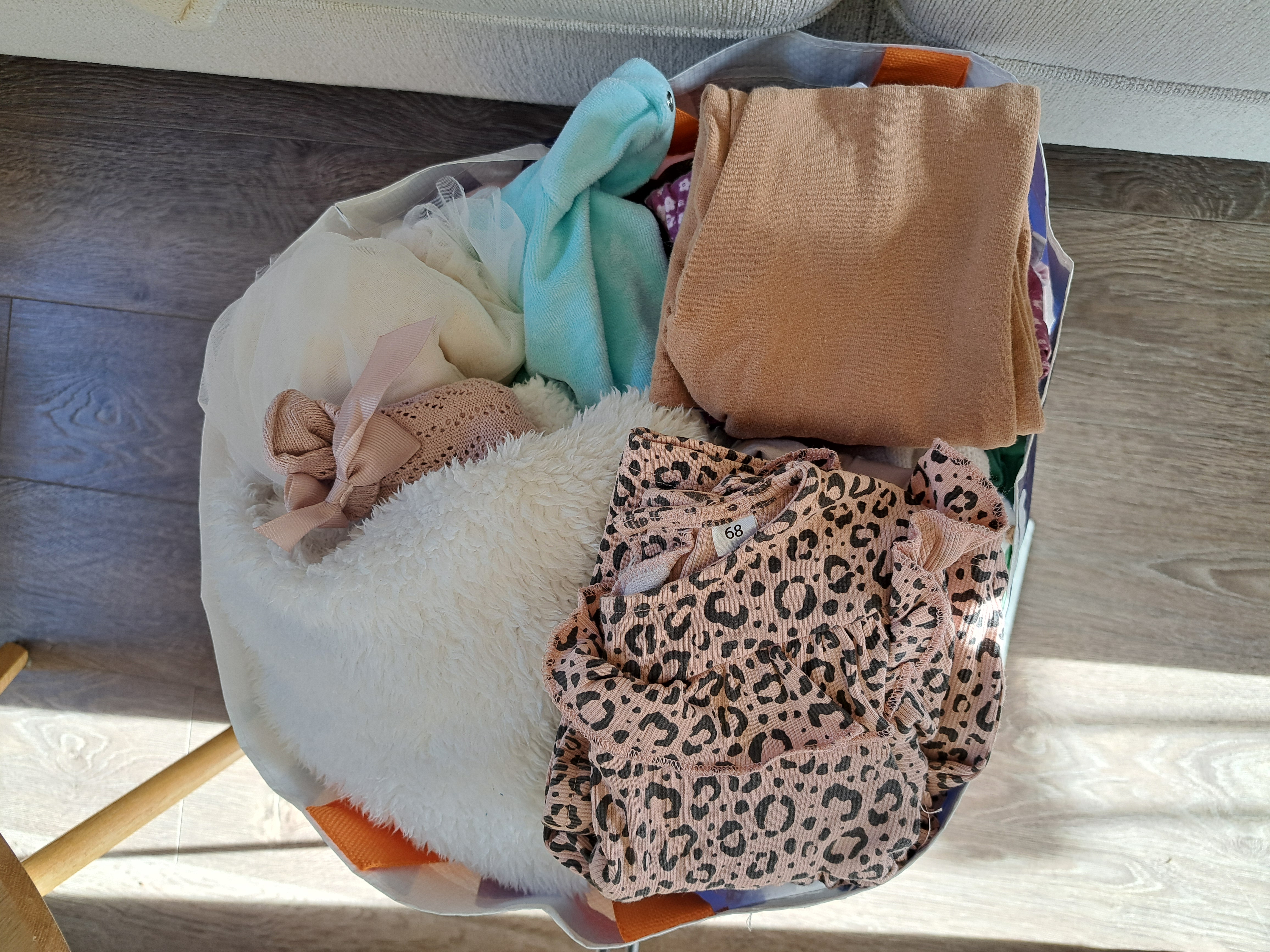 Baby clothes for girls. Sizes 62-86. Pants, shirts, rompers, hats, shoes, bibs, socks. Lots of pink, but also some other colors. Some clothes have a few stains. You can pick up the whole bag so you can pick out what you want to keep. I also have a playpen mat in yellow, green, and taupe.