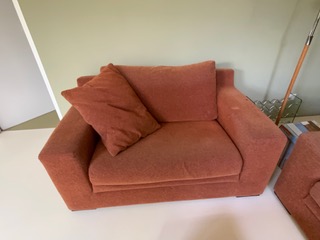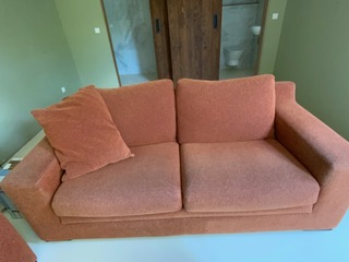 Two-person sofa and a love seat (sleeps 1.5). Color: rust brown. Sofa: love seat: 145x73cm high and two-person sofa: 195x73cm high; depth of both sofas: 70 cm.
