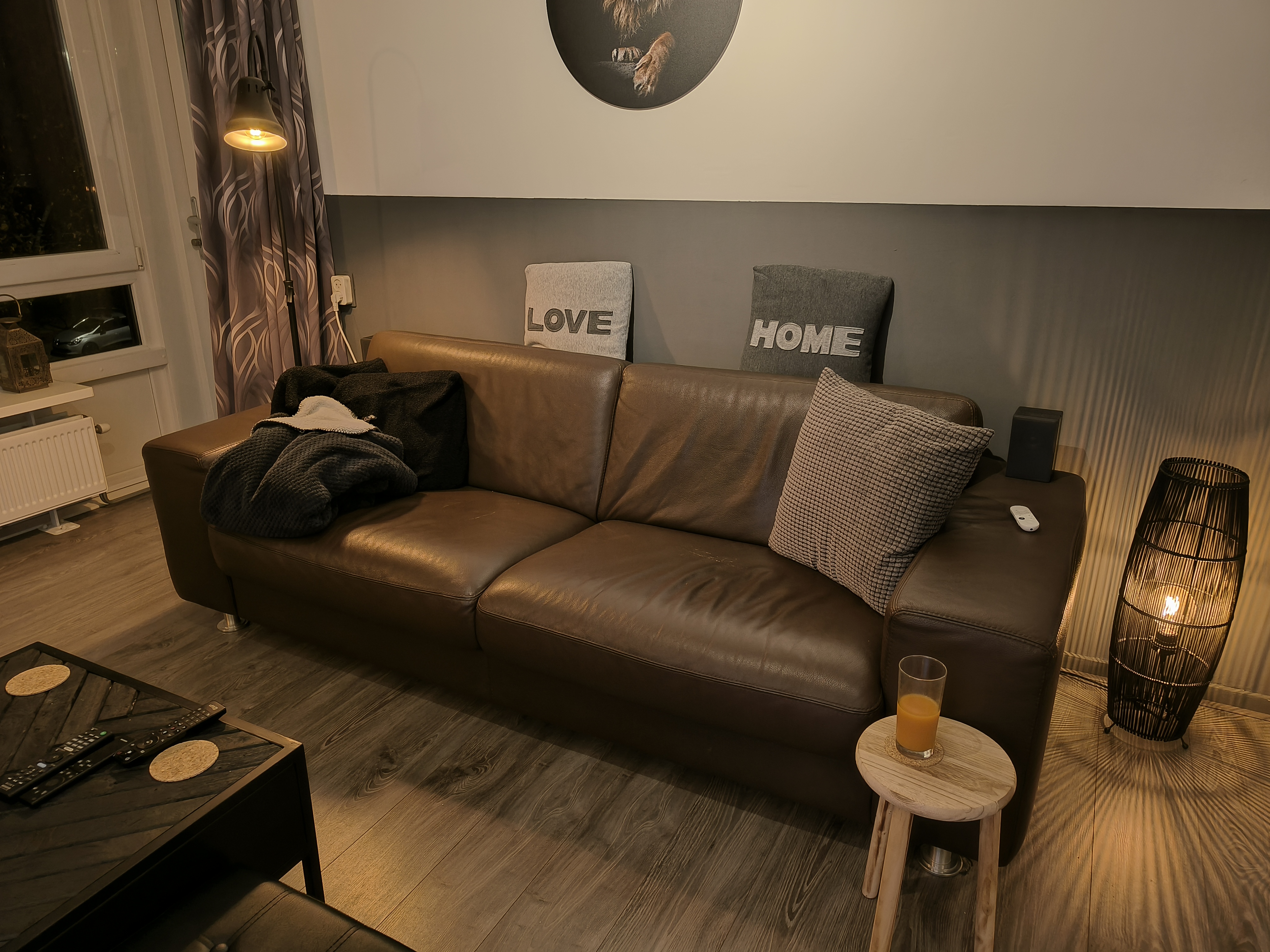 A brown three-seater sofa, 230 cm long and approximately 90 cm deep, measured including the backrest. Available for collection this month.