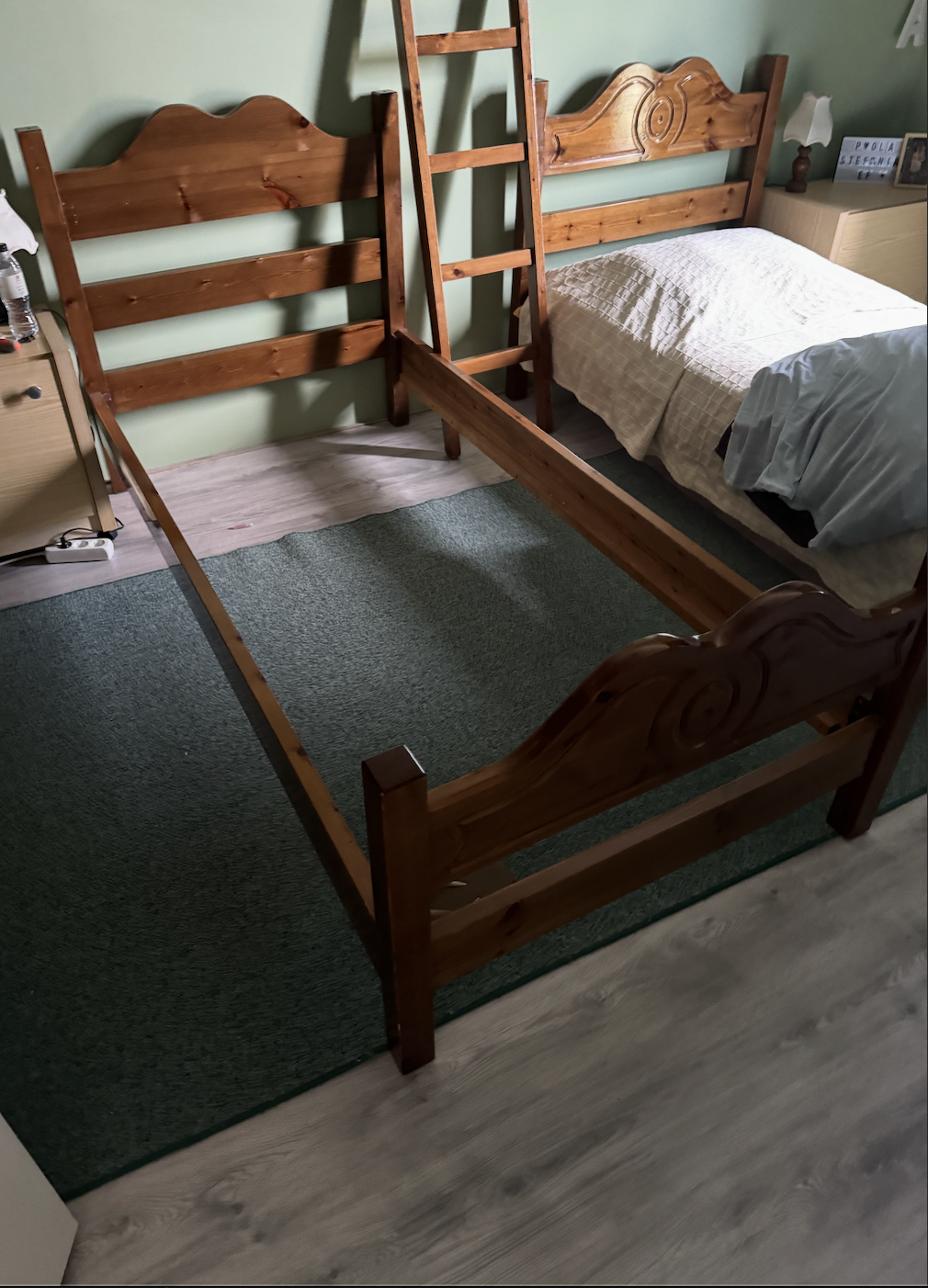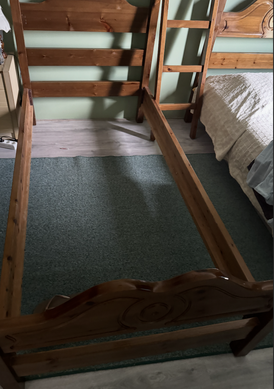 Description: For sale: two sturdy, solid wood single beds in a dark wood color. The beds have a classic, country look with beautiful curves at the headboards and footboards. They are sold with matching mattresses. Ideal for a shared children's room, guest room, or holiday home. Because the beds are identical, they look great next to each other. (Optional: There is also a step ladder included, so they can be used as bunk beds). Quantity: 2 beds available. Includes: 2 mattresses. Material: Solid wood (dark pine/varnished). Condition: Used, sturdy quality.