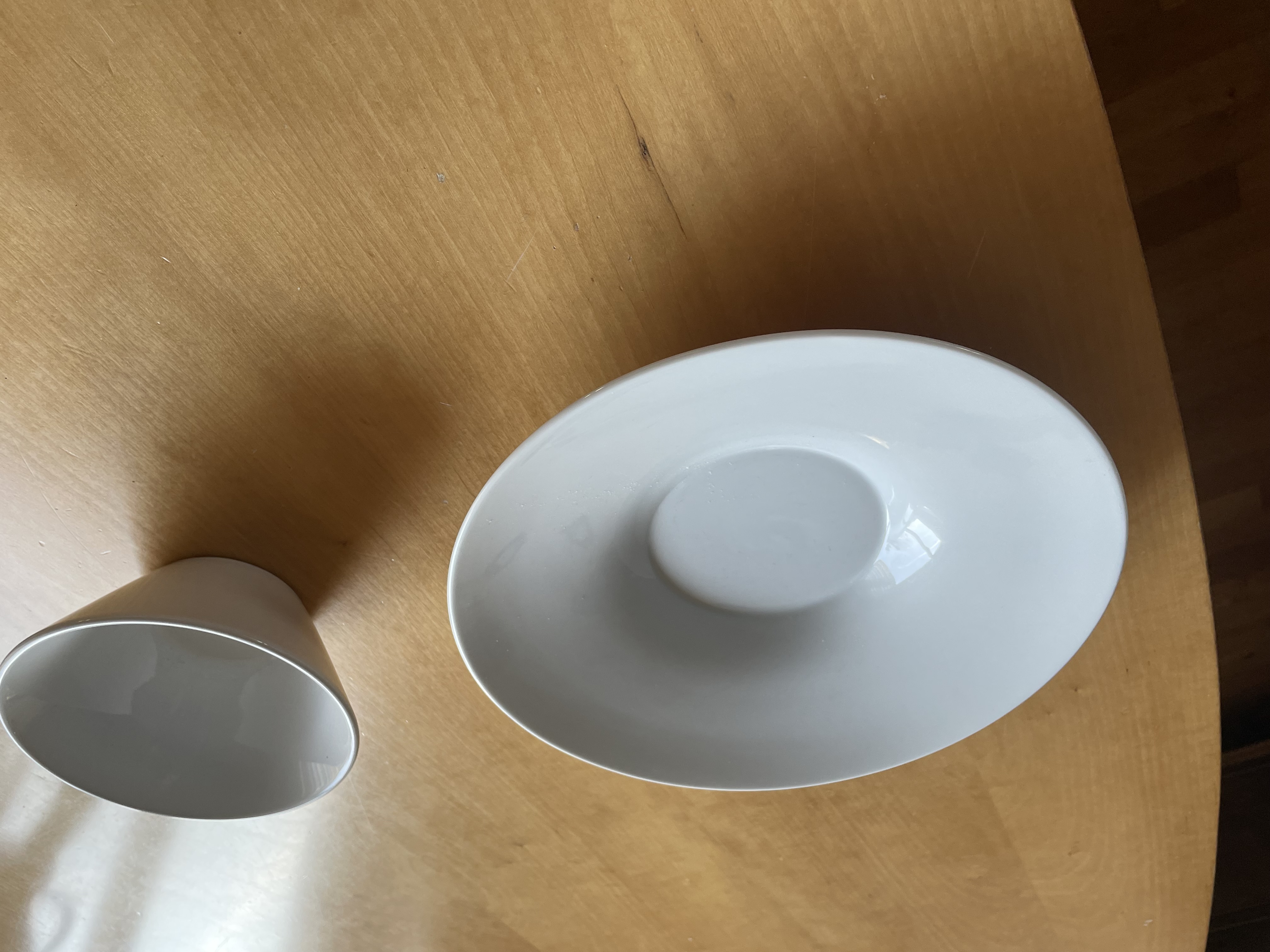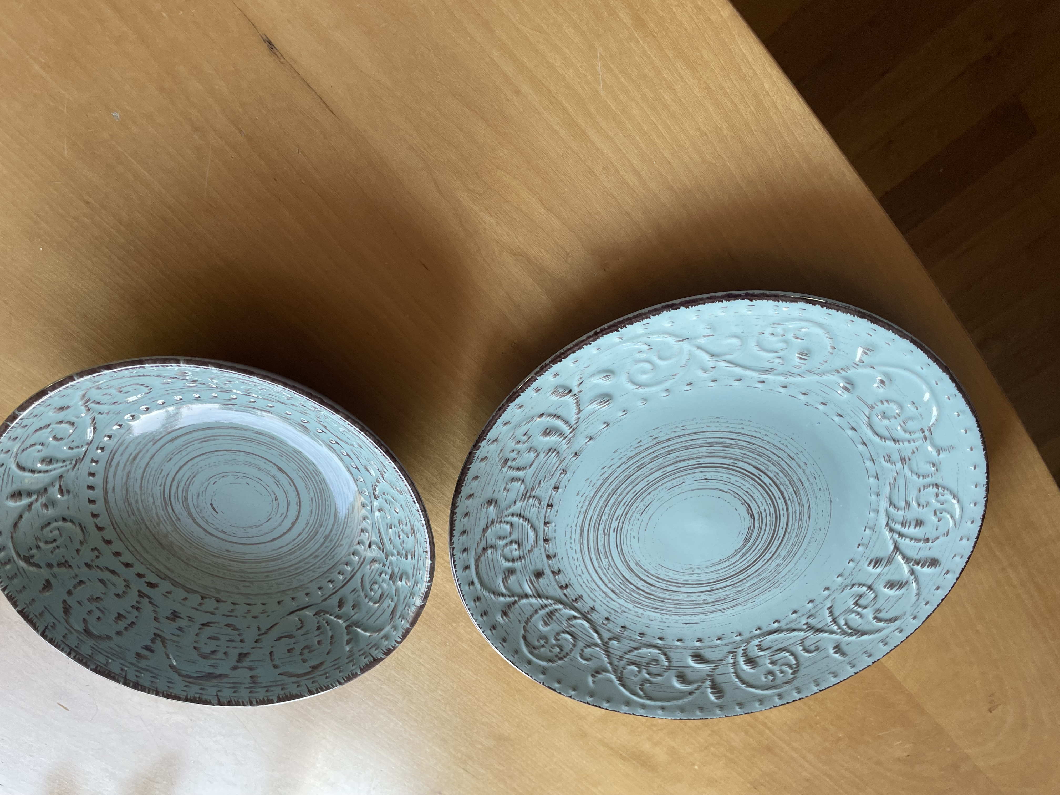 Various dinner plates, both deep and flat. Various cutlery such as spoons, knives, and forks.
