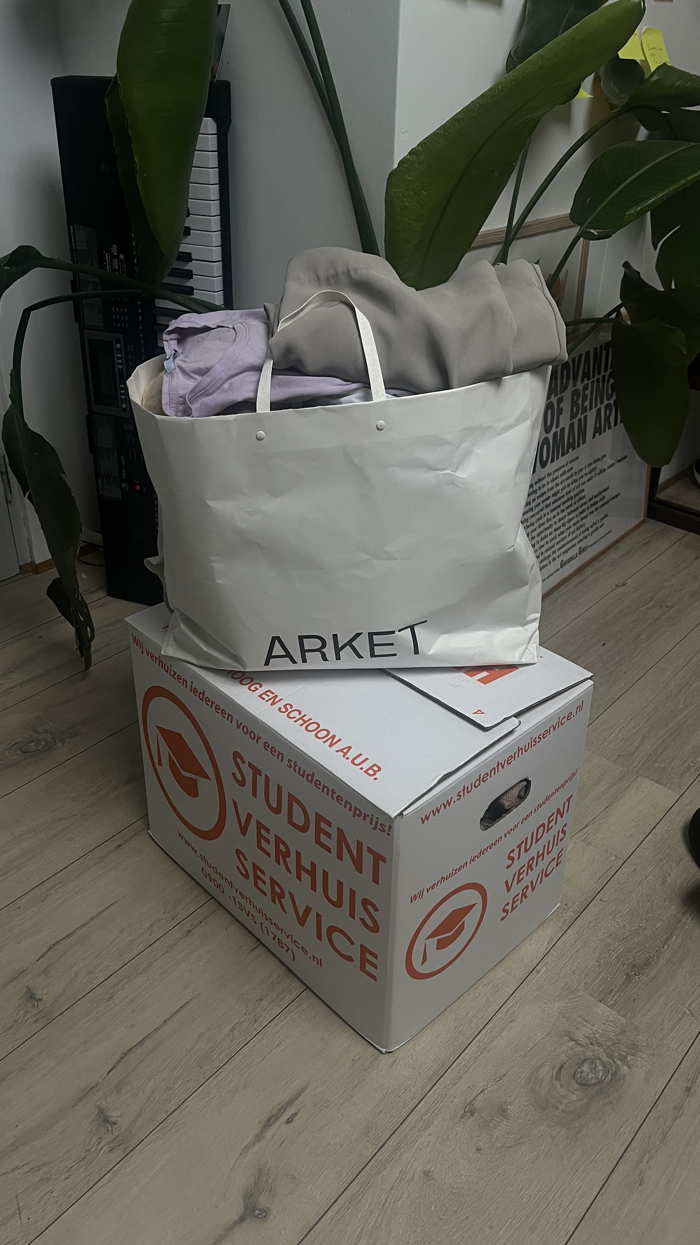 Box and bag filled with clothes (dresses, sweaters, shoes etc. + big red winter coat). Mostly size S/M.