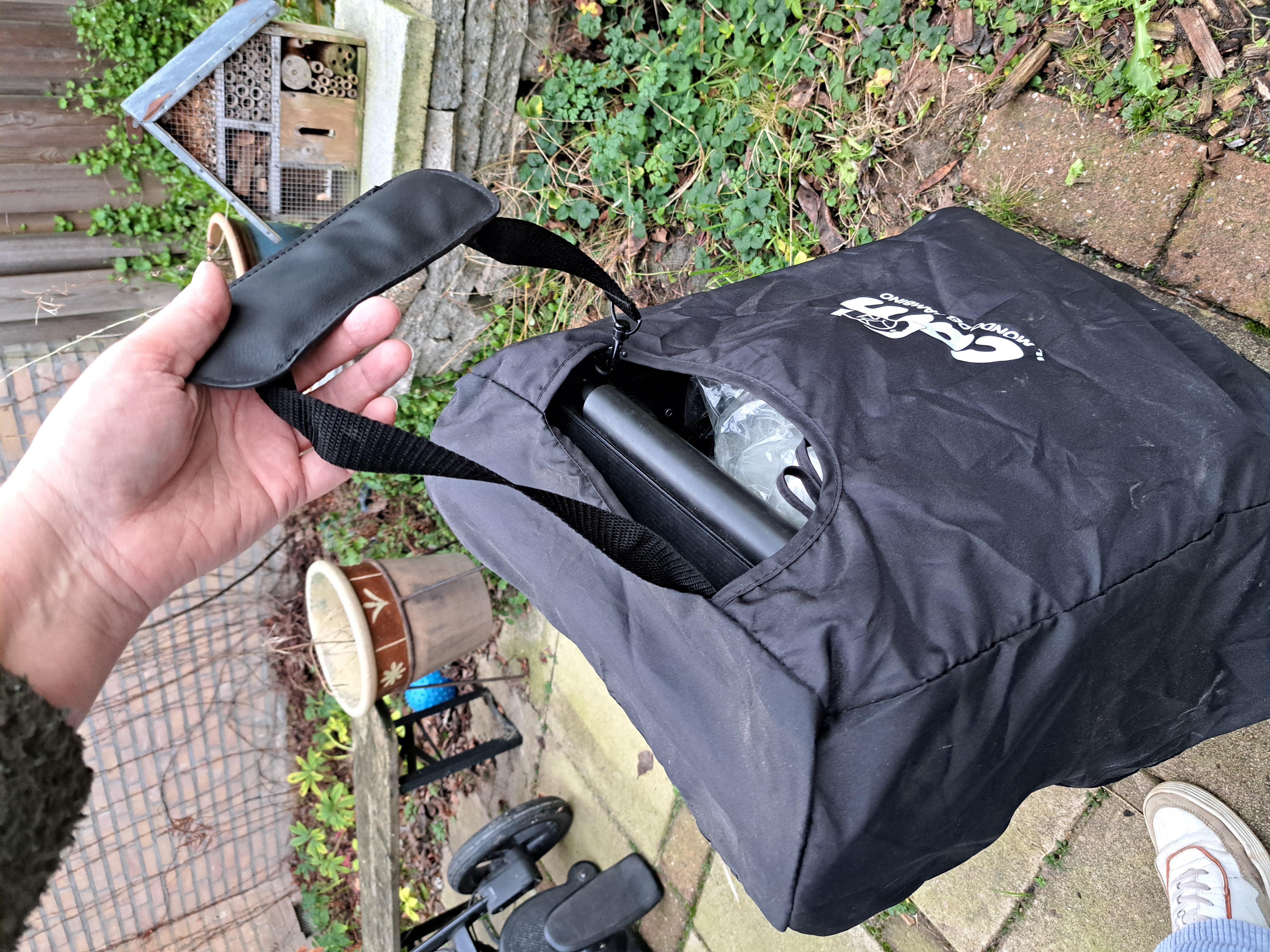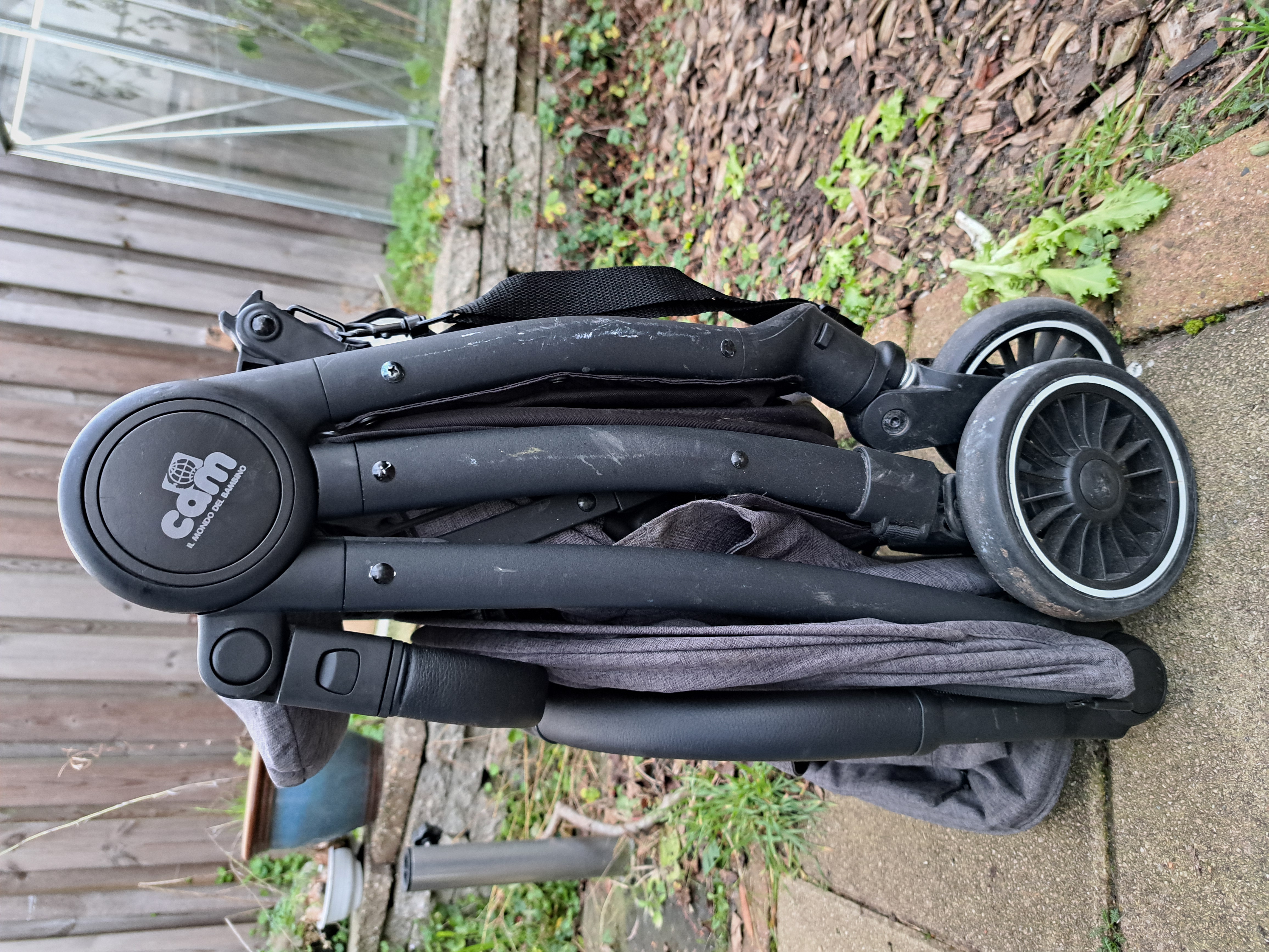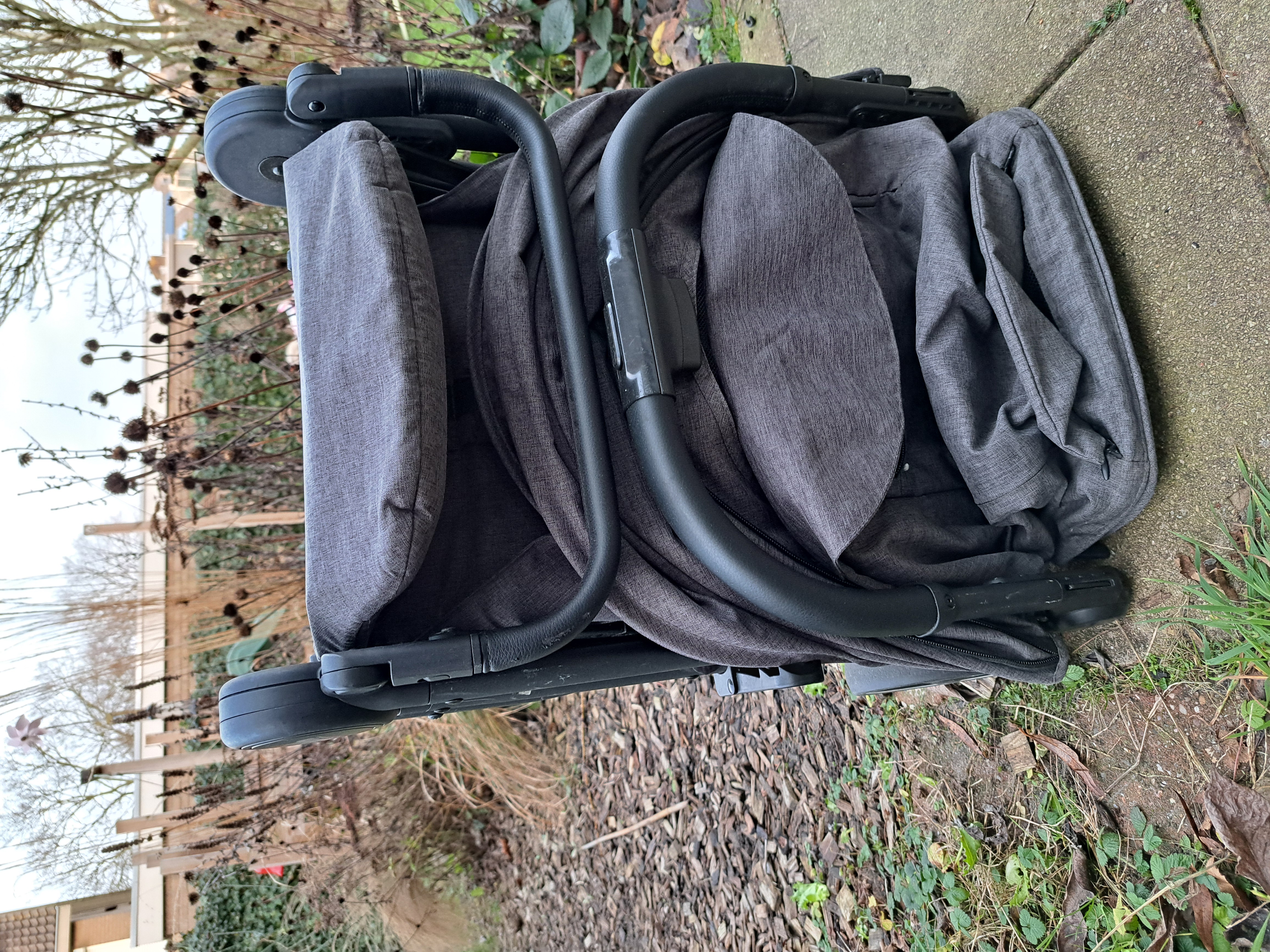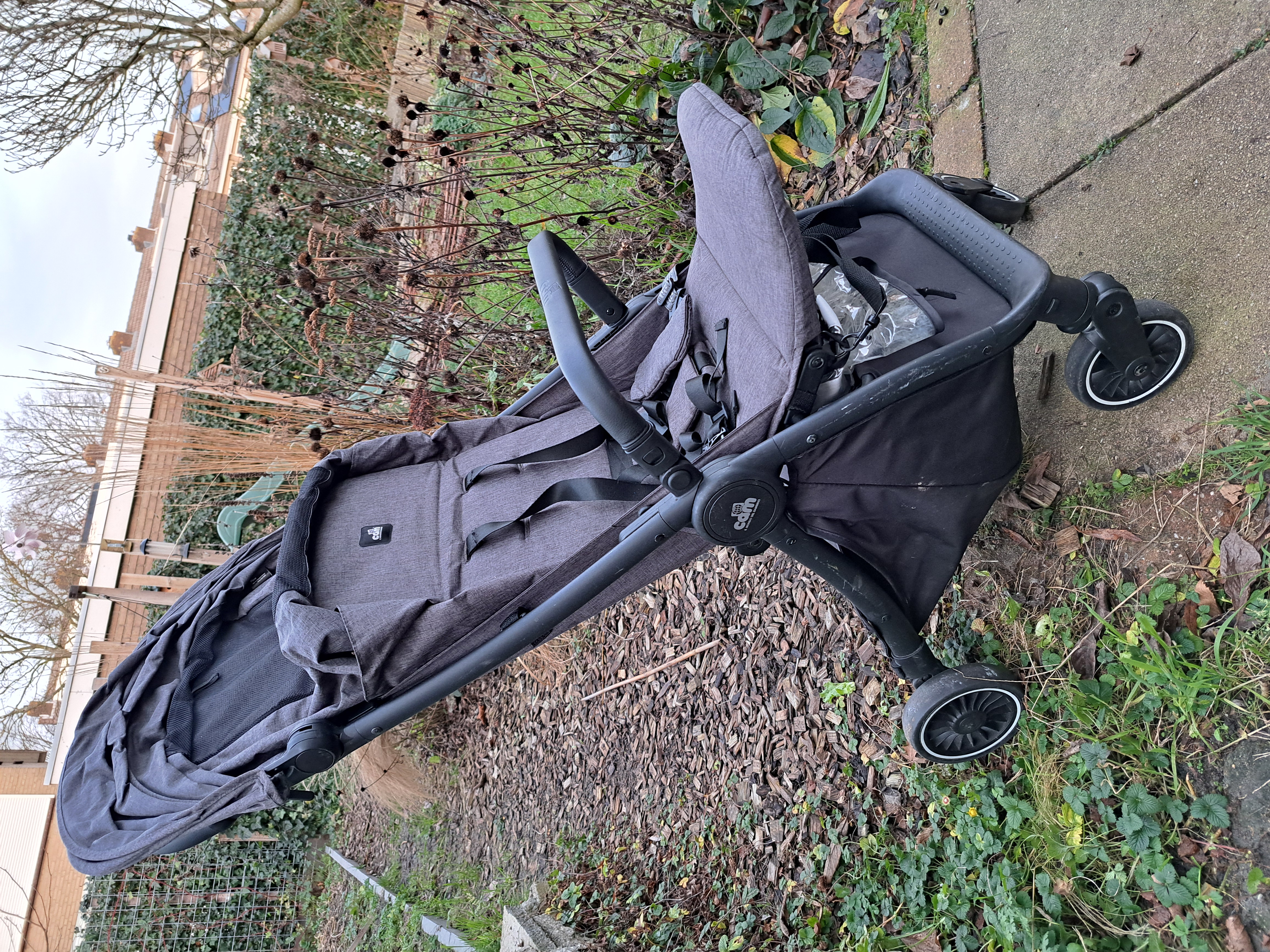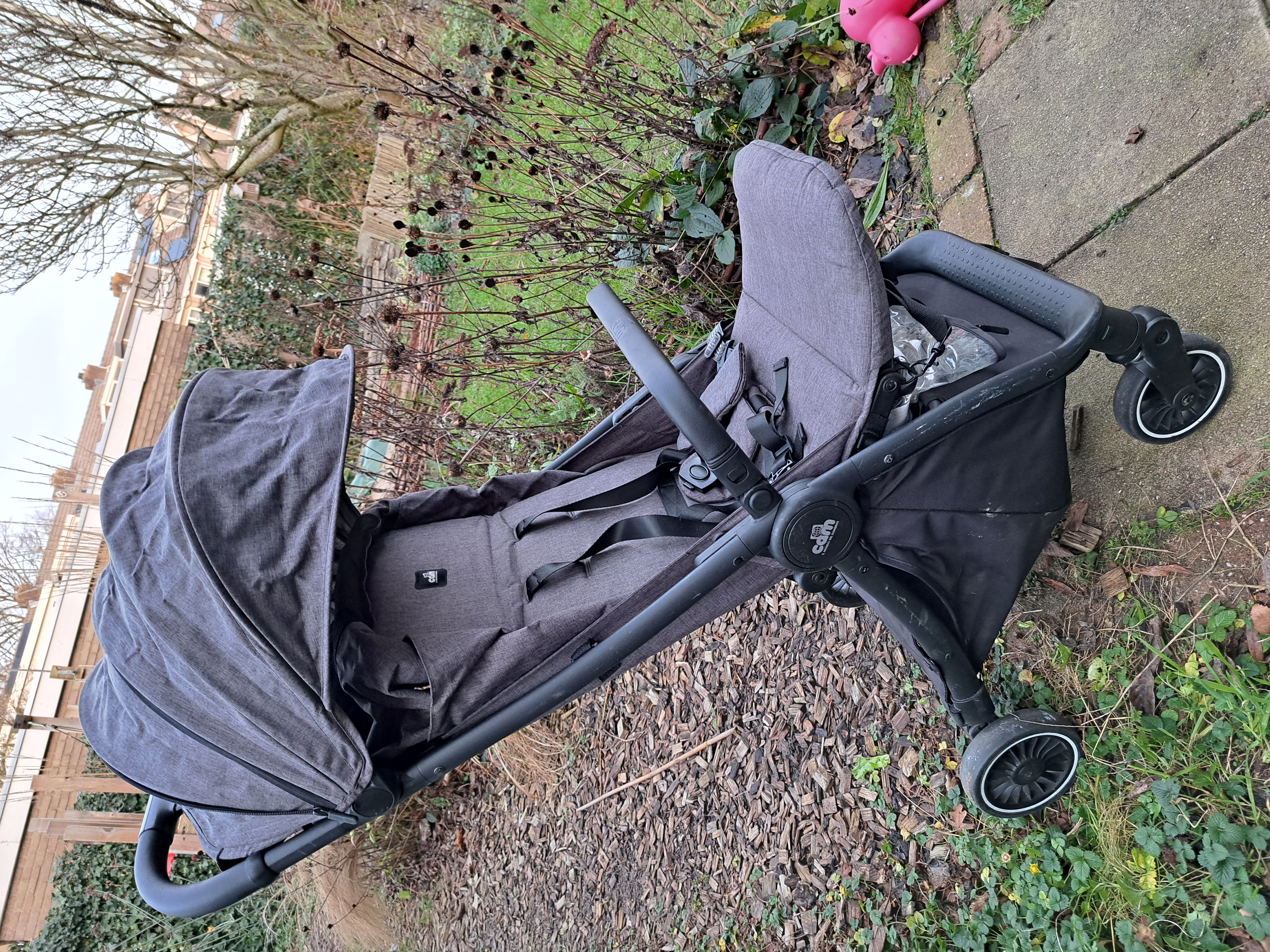 Buggy with an adjustable seat. Includes a rain cover and hood. Good condition.