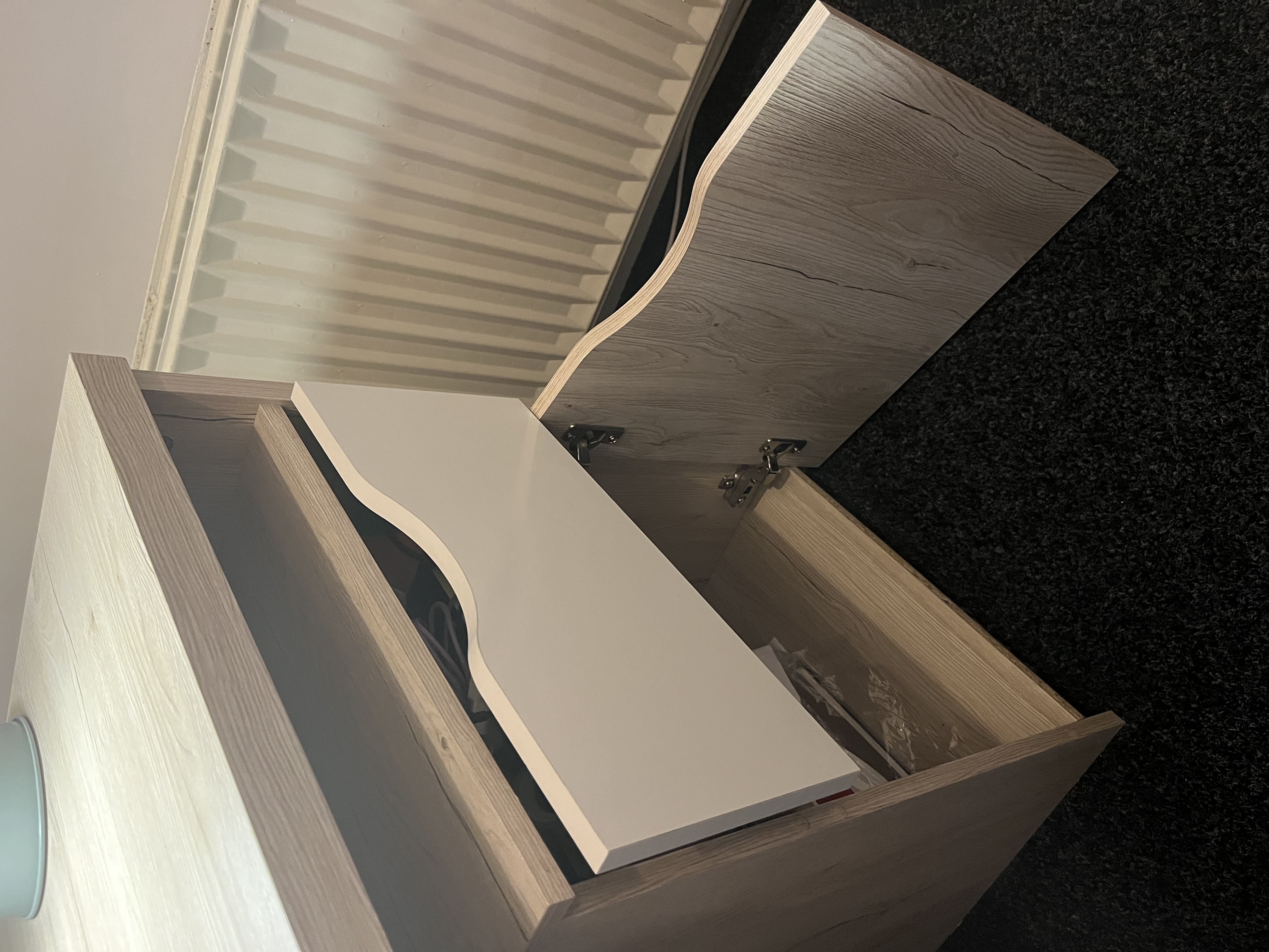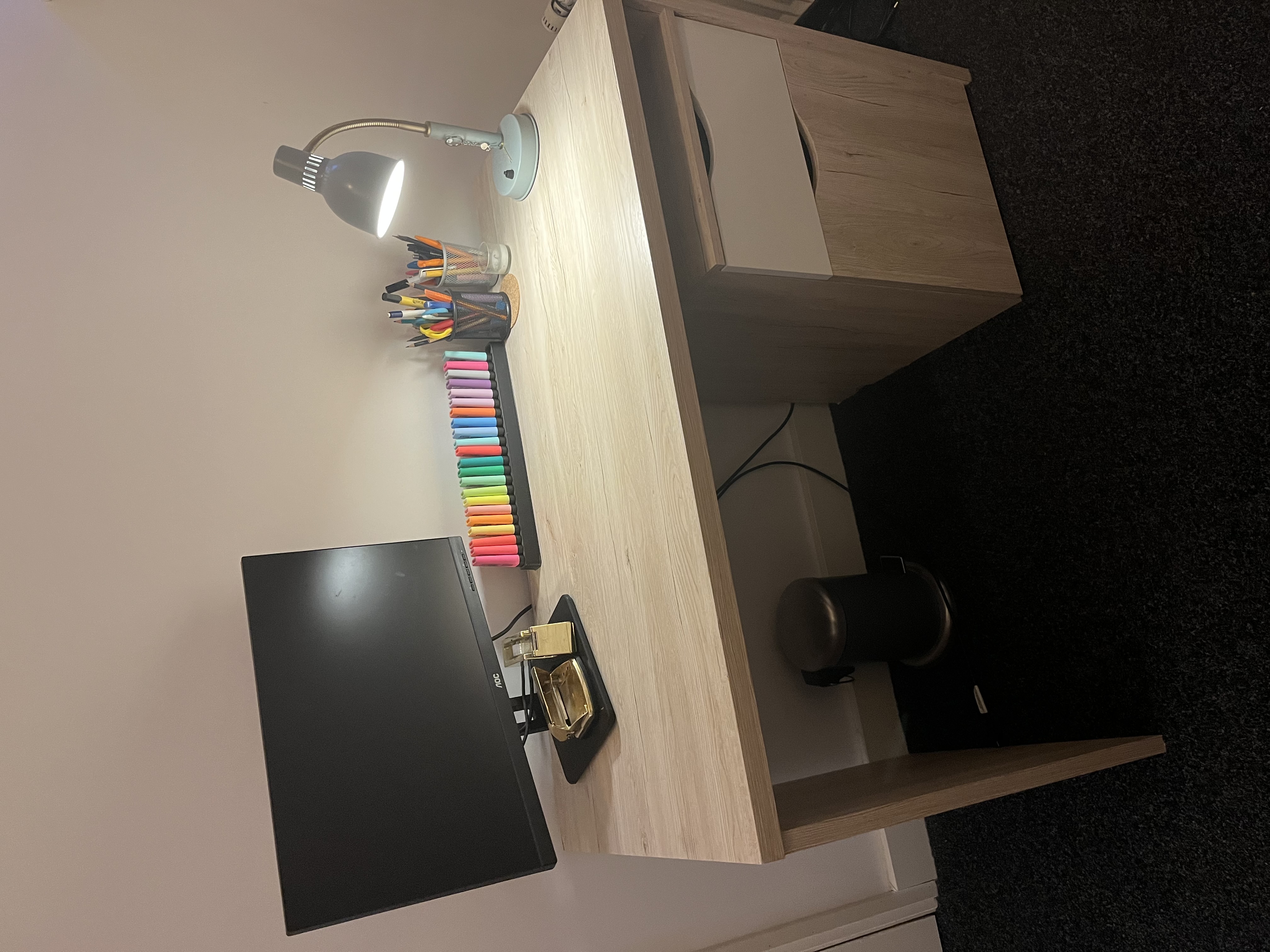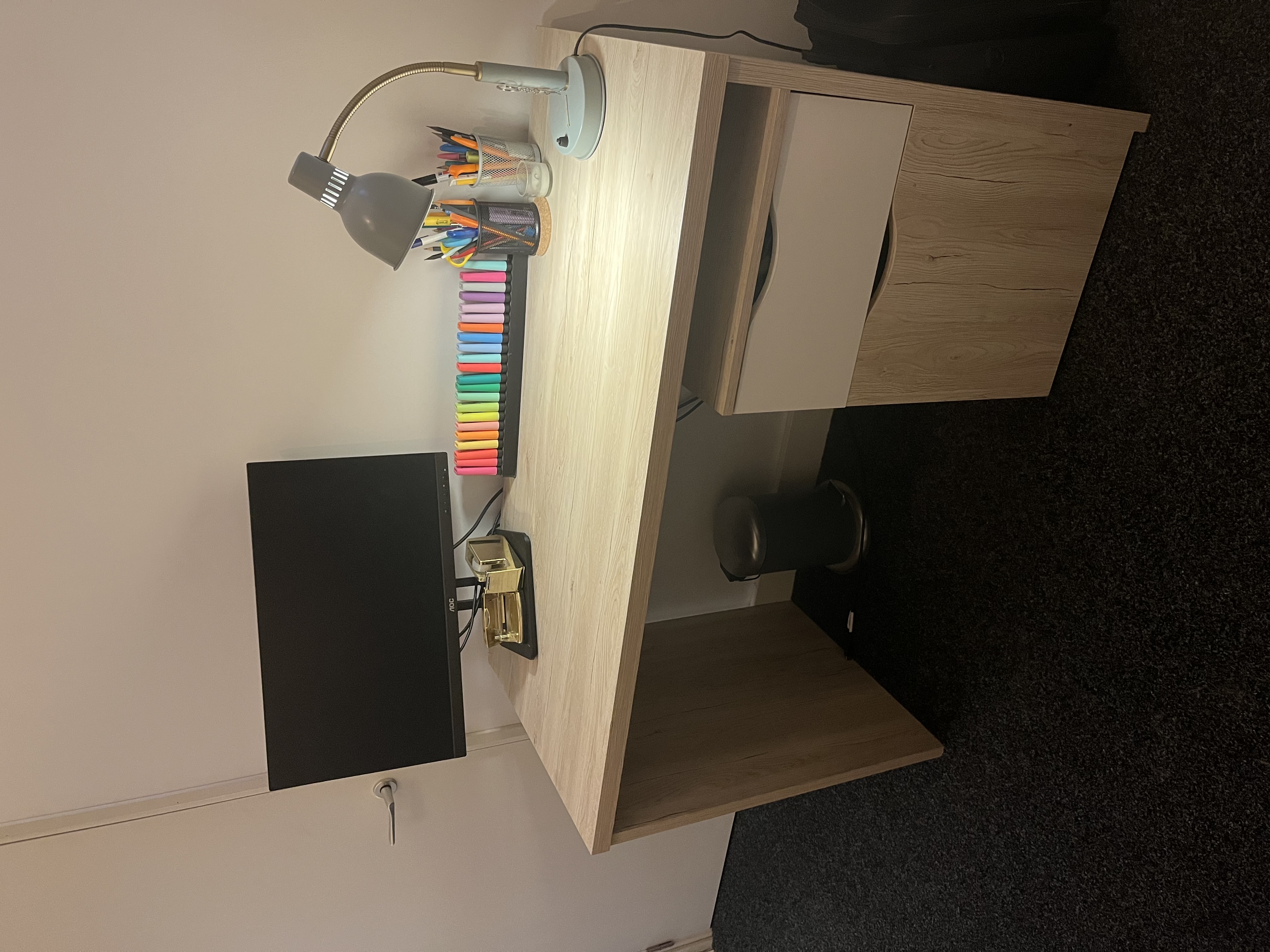 It’s a White, wooden desk with two very useful drawers to store stuff in. The desk has been used for a couple of years, there are a few bumps and rough patches (see pictures). But still very pretty! (The stuff on the desk is not included) Desk is pretty heavy, but we can help carry it to the car! Measurements: Length: 120 cm Depth: 55 cm Highth: 75 cm