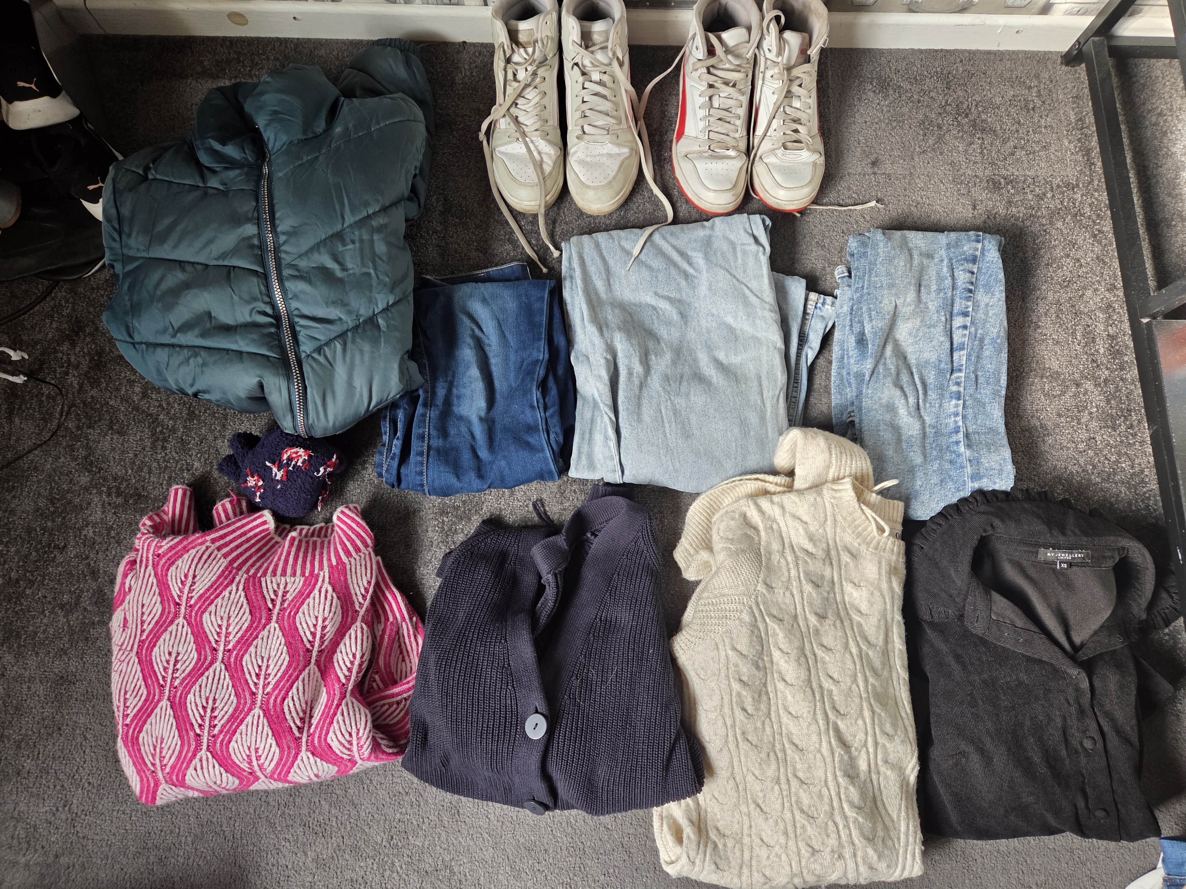 Hello, I'd like to give away my winter clothes that I no longer wear. One sweater, one cardigan, one long sweater, one dress, one black blouse, one mid-season coat, three pairs of jeans, and possibly two pairs of Puma shoes, size 39.
