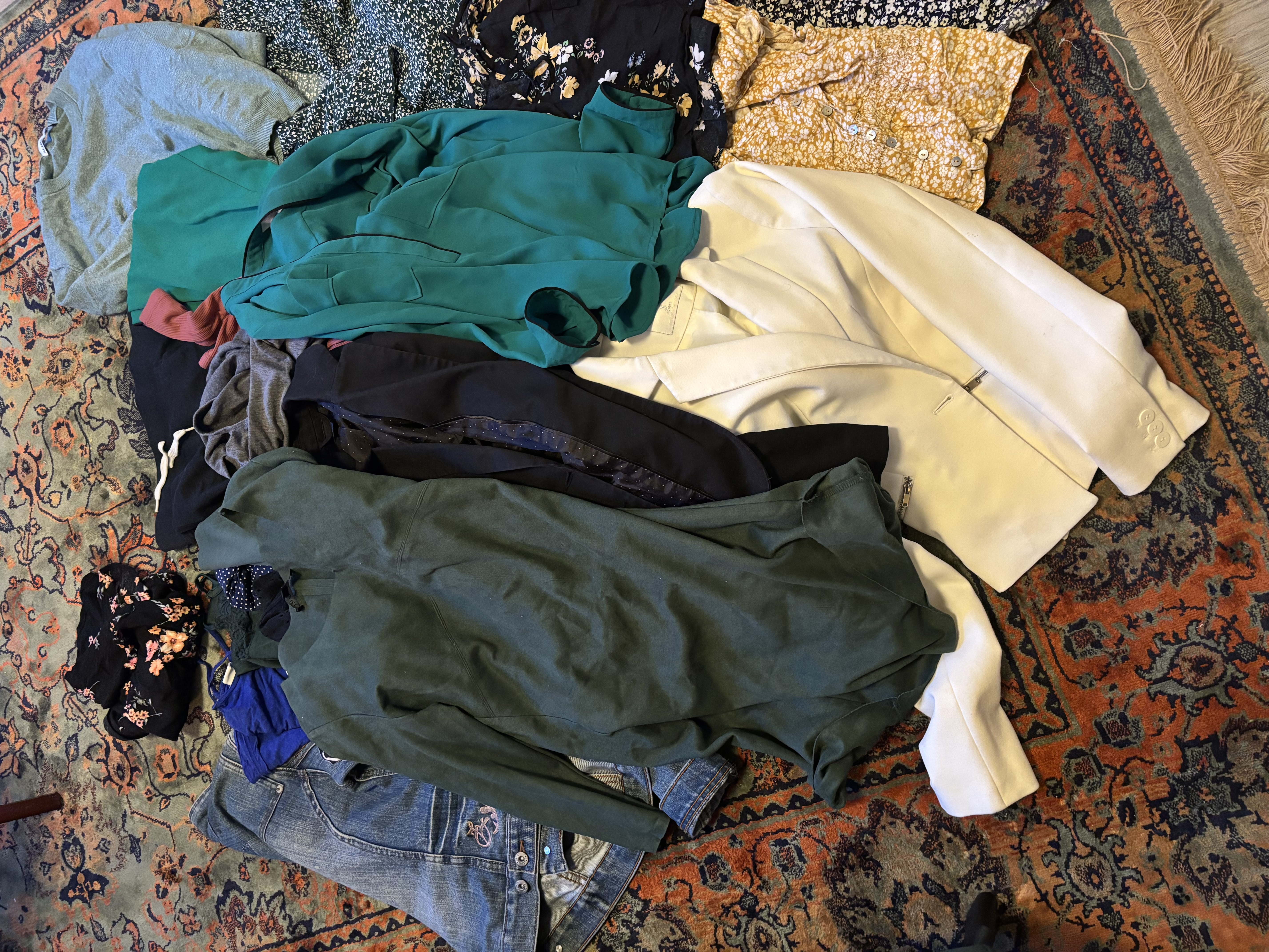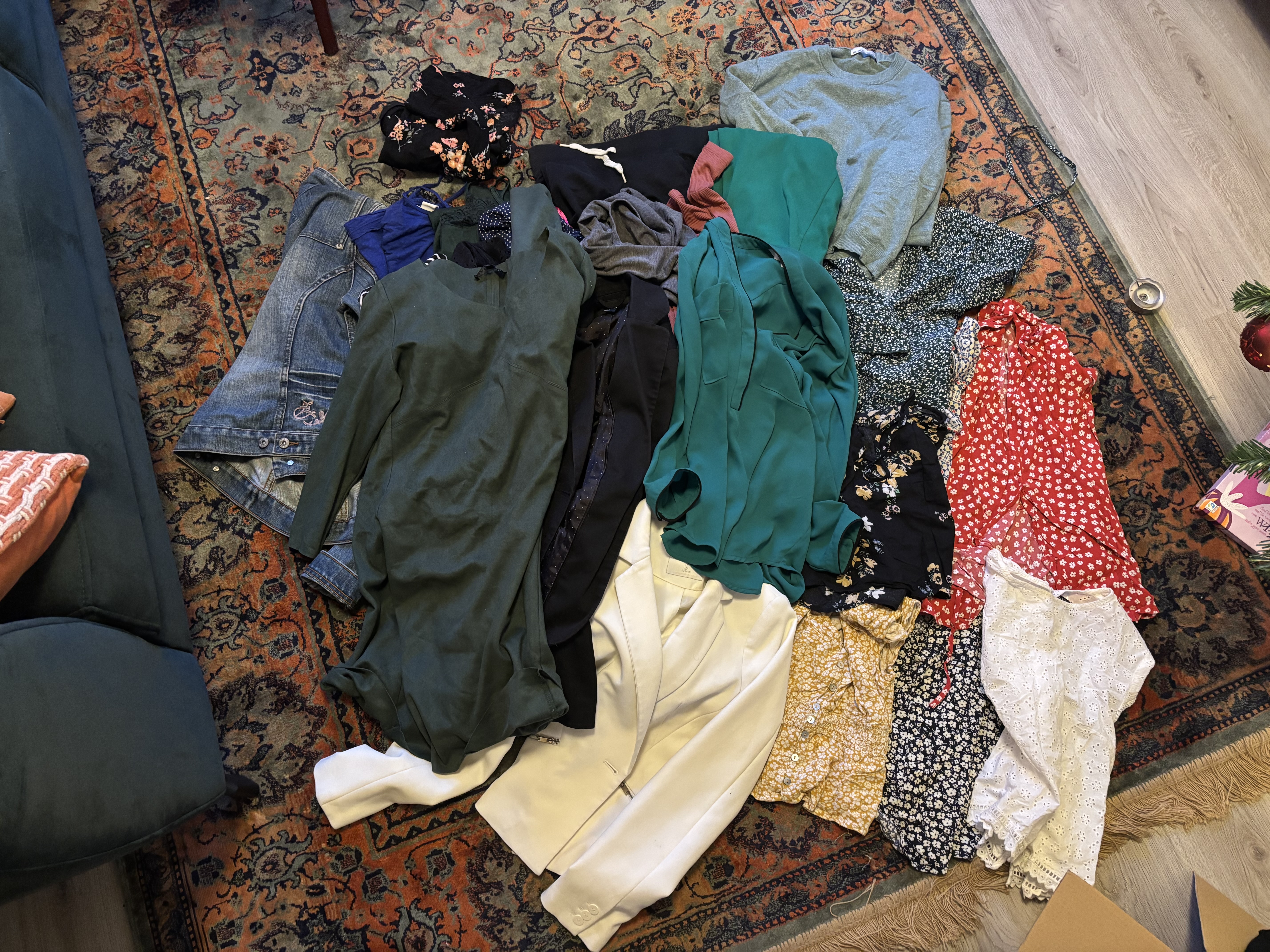 3 bags full of women's/girls' clothing (tops, t-shirt, blouse, trousers, jeans, skirts) size 34/36 3 pairs of sneakers size 36/37 A photo of some of the clothes