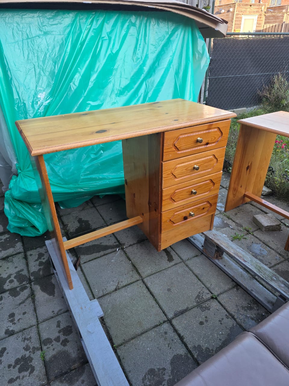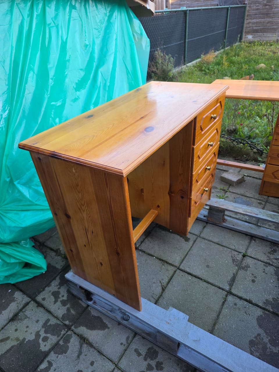 I'm offering two sturdy, solid pine desks. These desks are heavy-duty and in good condition. They're perfect for a home office, teenager's room, or student room. Because they're made of solid wood, they're also ideal for DIY projects, such as painting them a different color (like matte black or white). Features: Material: Solid pine (varnished). Storage: Equipped with 4 spacious drawers with beautiful details and knobs. Condition: Used, but very sturdy and well-maintained.