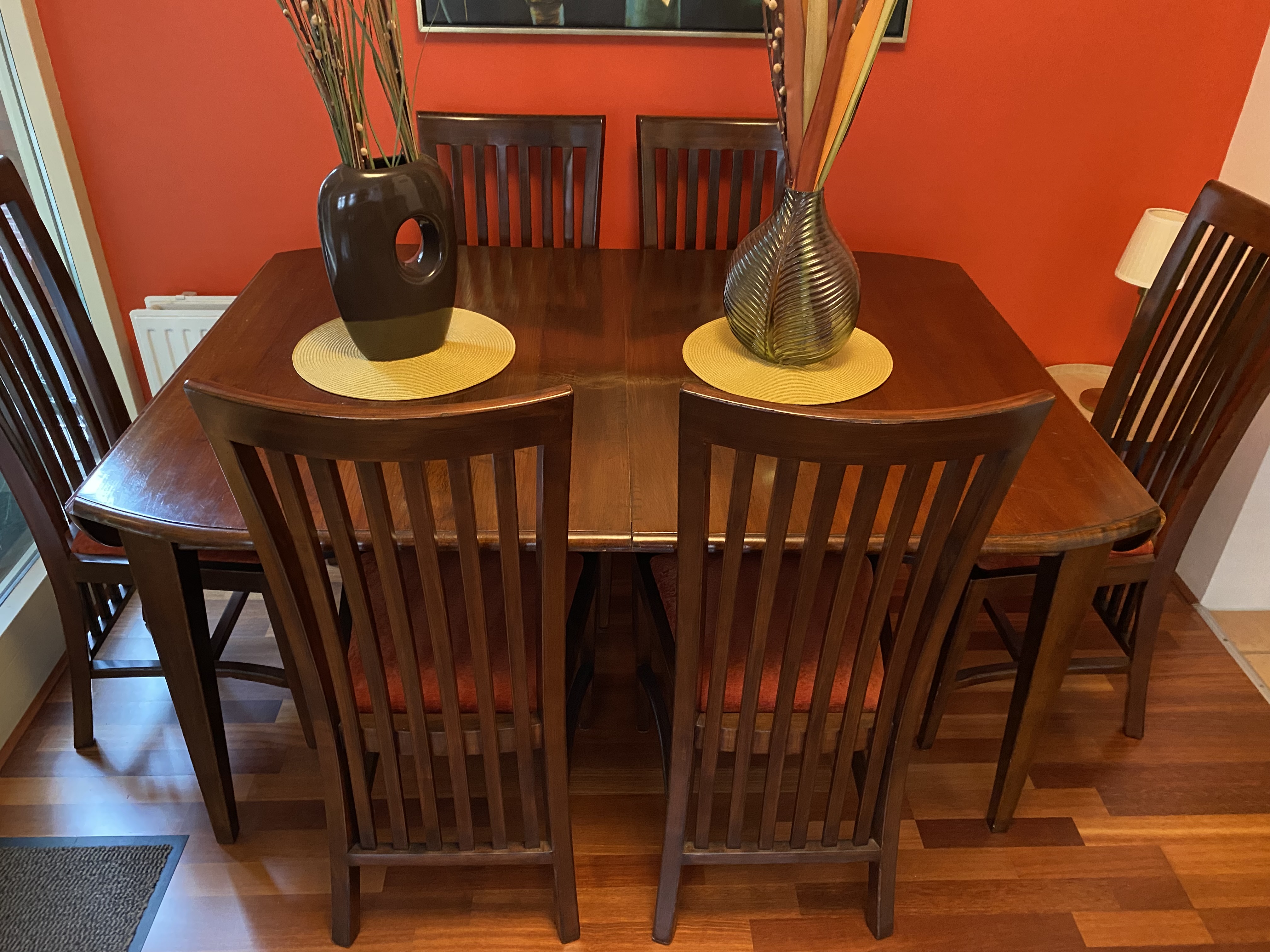 Dining table and 6 matching chairs with red cushion covers. Purchased 15 years ago at Pine Store Haarlem. Solid polished mahogany with two semicircular extensions at the ends and a lockable extension (49cm wide). Suitable for 6 people when not fully extended - up to 10 people when fully extended. Dimensions: Table: L 204 cm (+ 49cm extension) / W 108 cm / H 78 cm. Chairs: H 104 cm / ~45 cm square. Excellent condition. For collection in Amsterdam