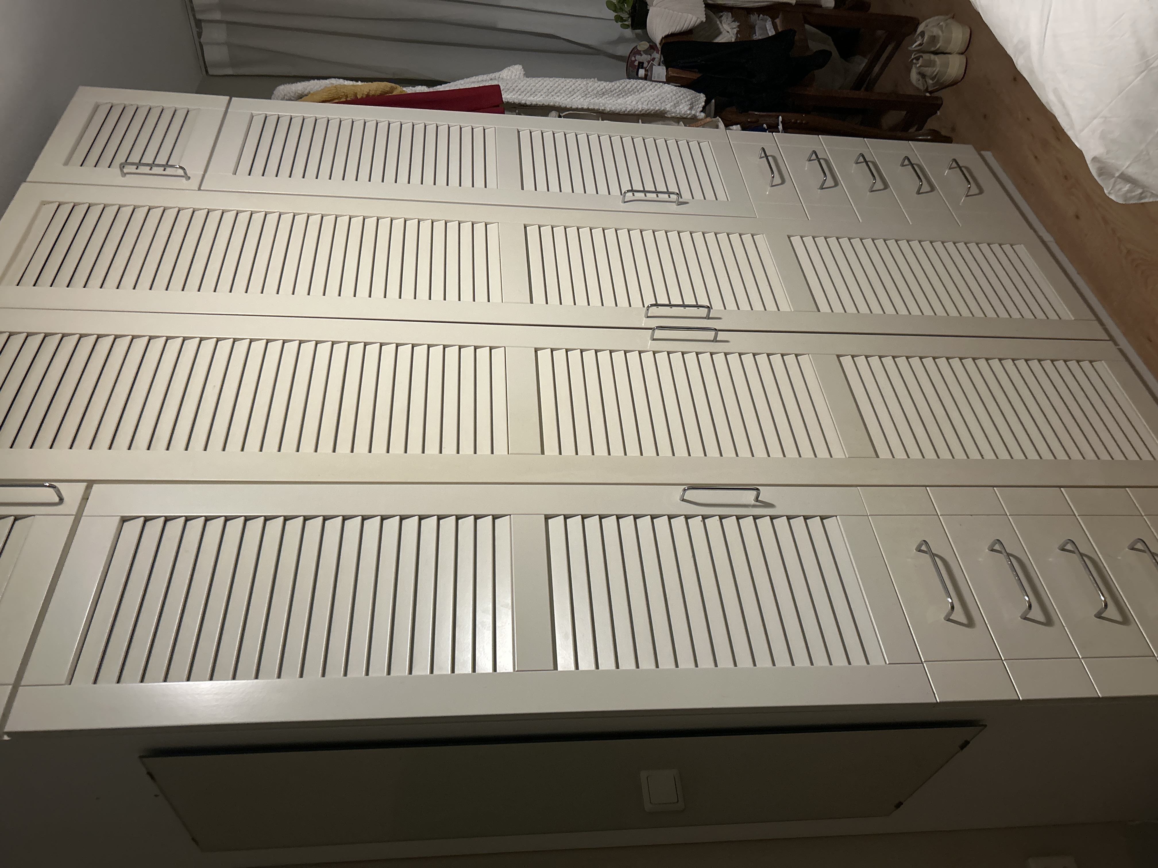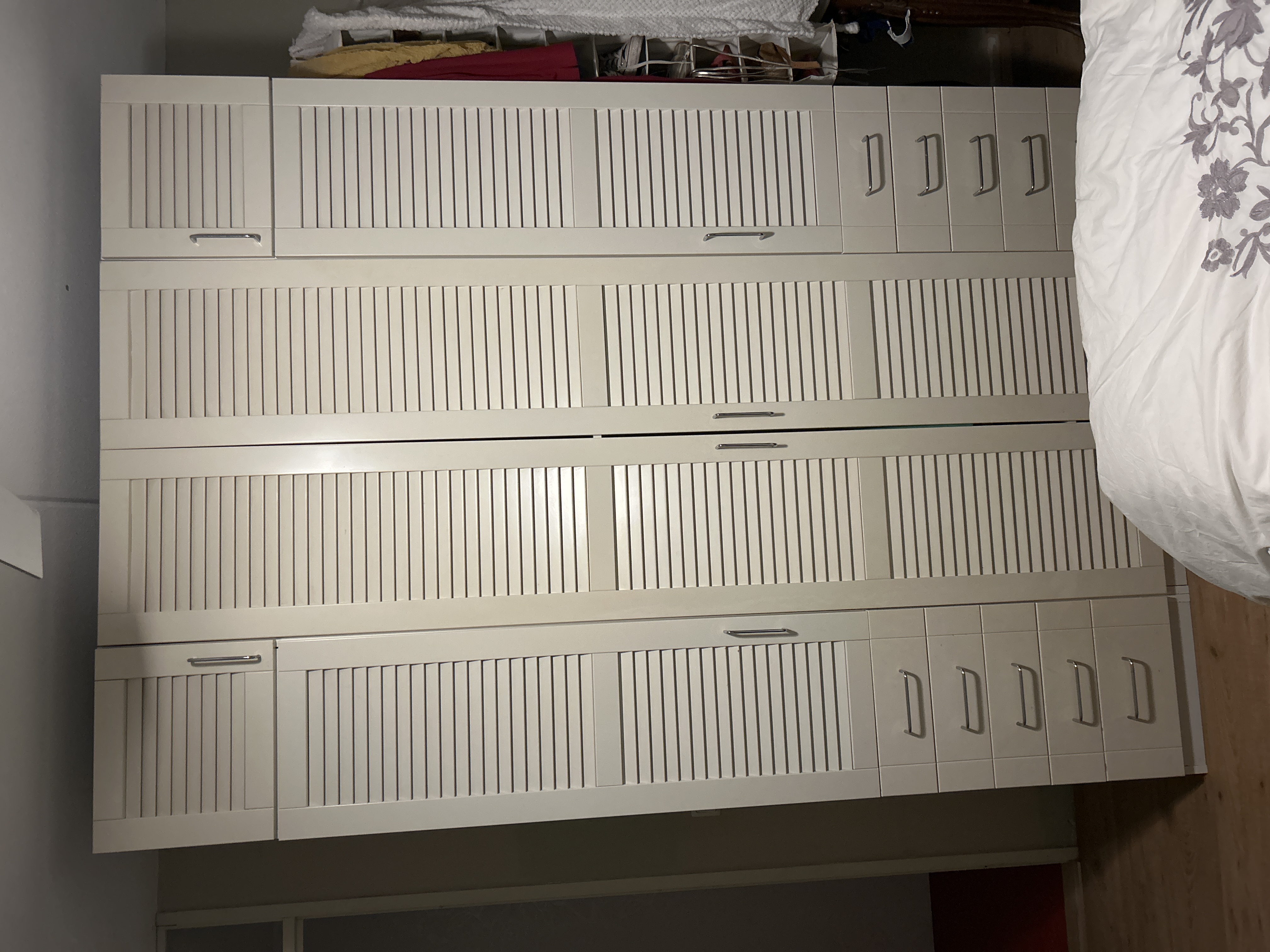 I have a large used IKEA cabinet with plenty of hanging and storage space. It will be available starting early next week. The drawers are a bit tight, but if you're handy, you can fix that. Note that your room must be at least 240 cm high. The cabinet is 160 cm long, 236 cm high, and 60 cm deep. I can disassemble it and will deliver it if you live within 5 km of me. My car isn't very big, and I can't close the trunk lid.