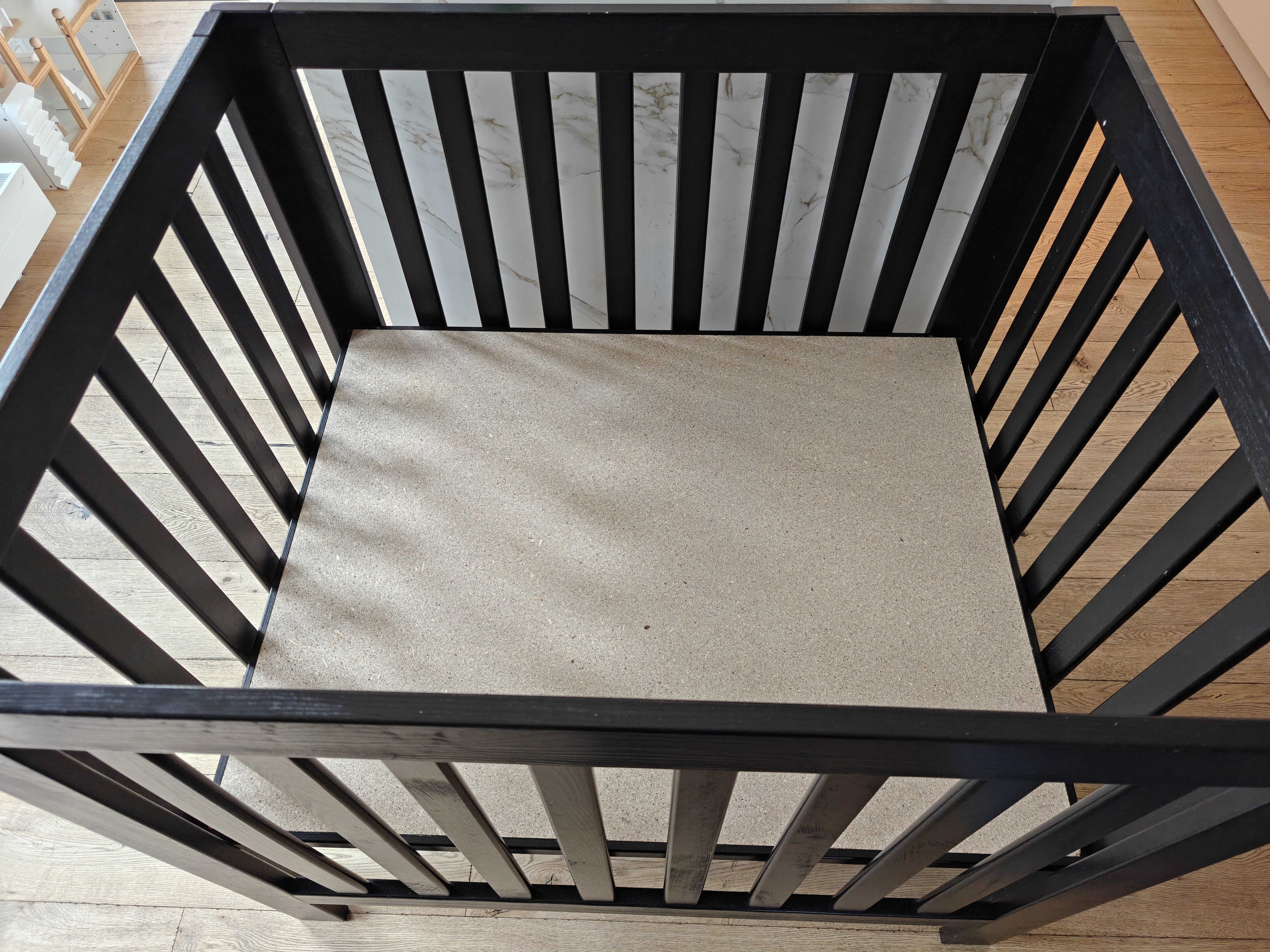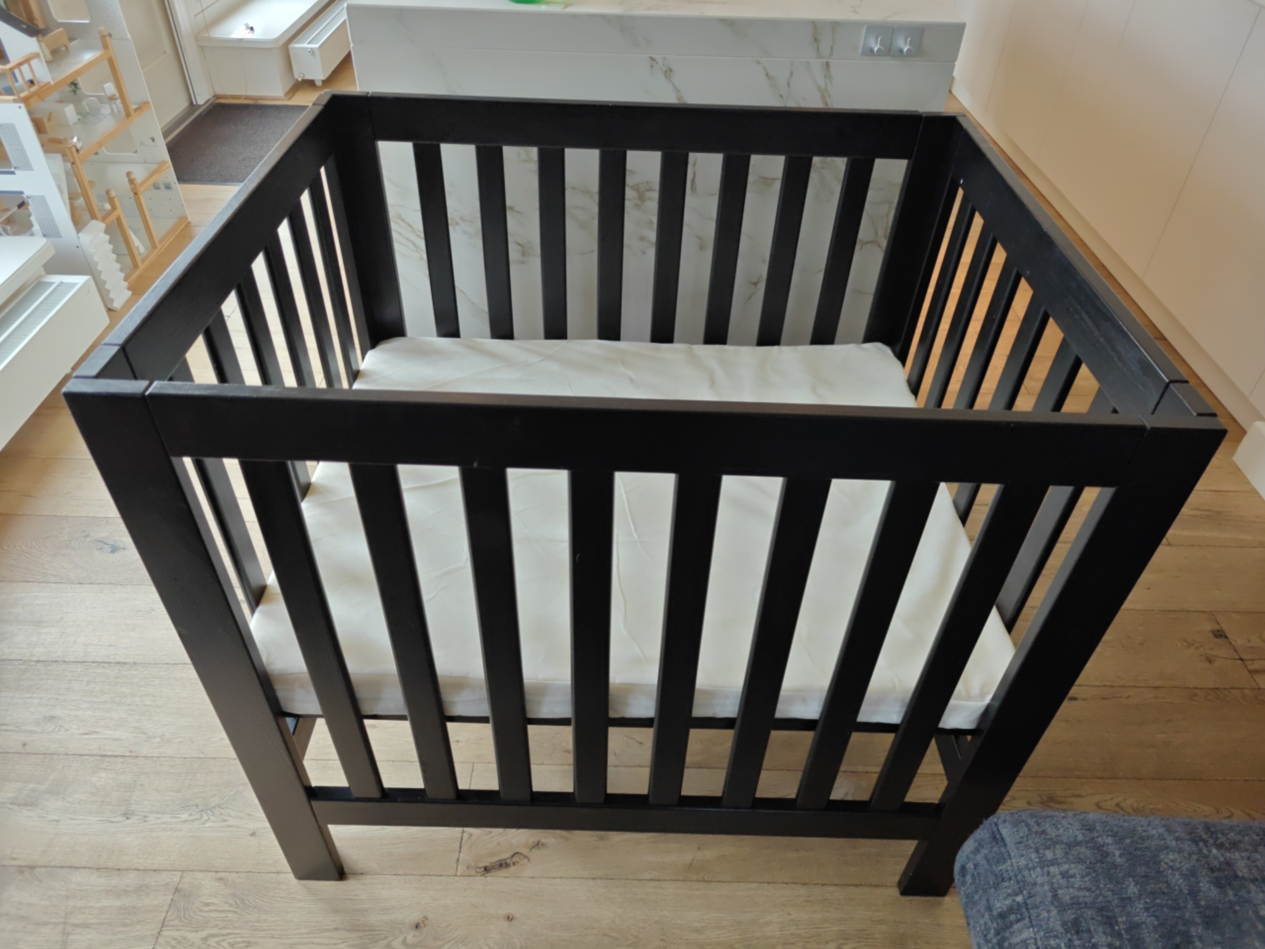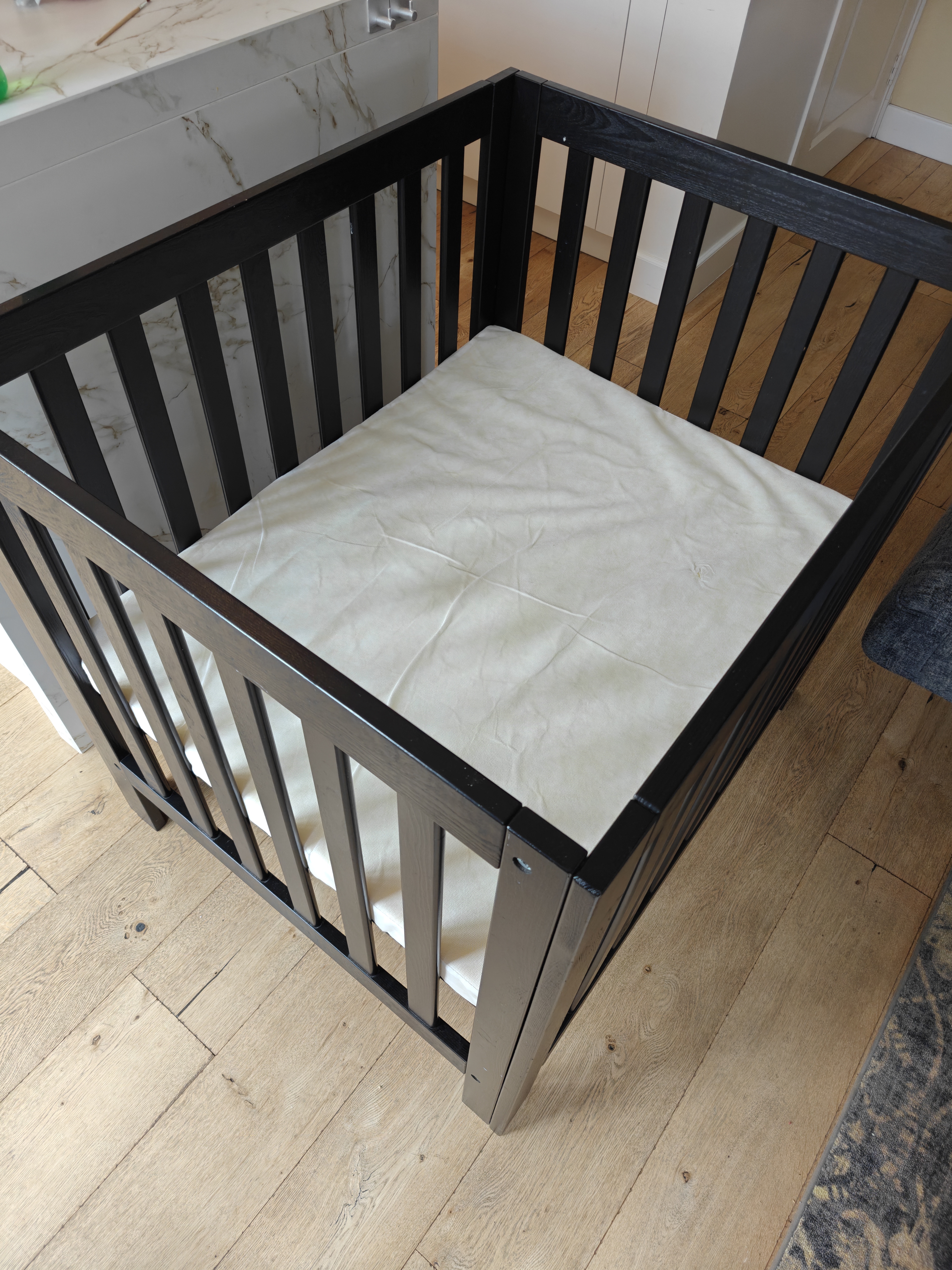 Wooden box with mattress. Barely used. Assemble it yourself. All screws are included.