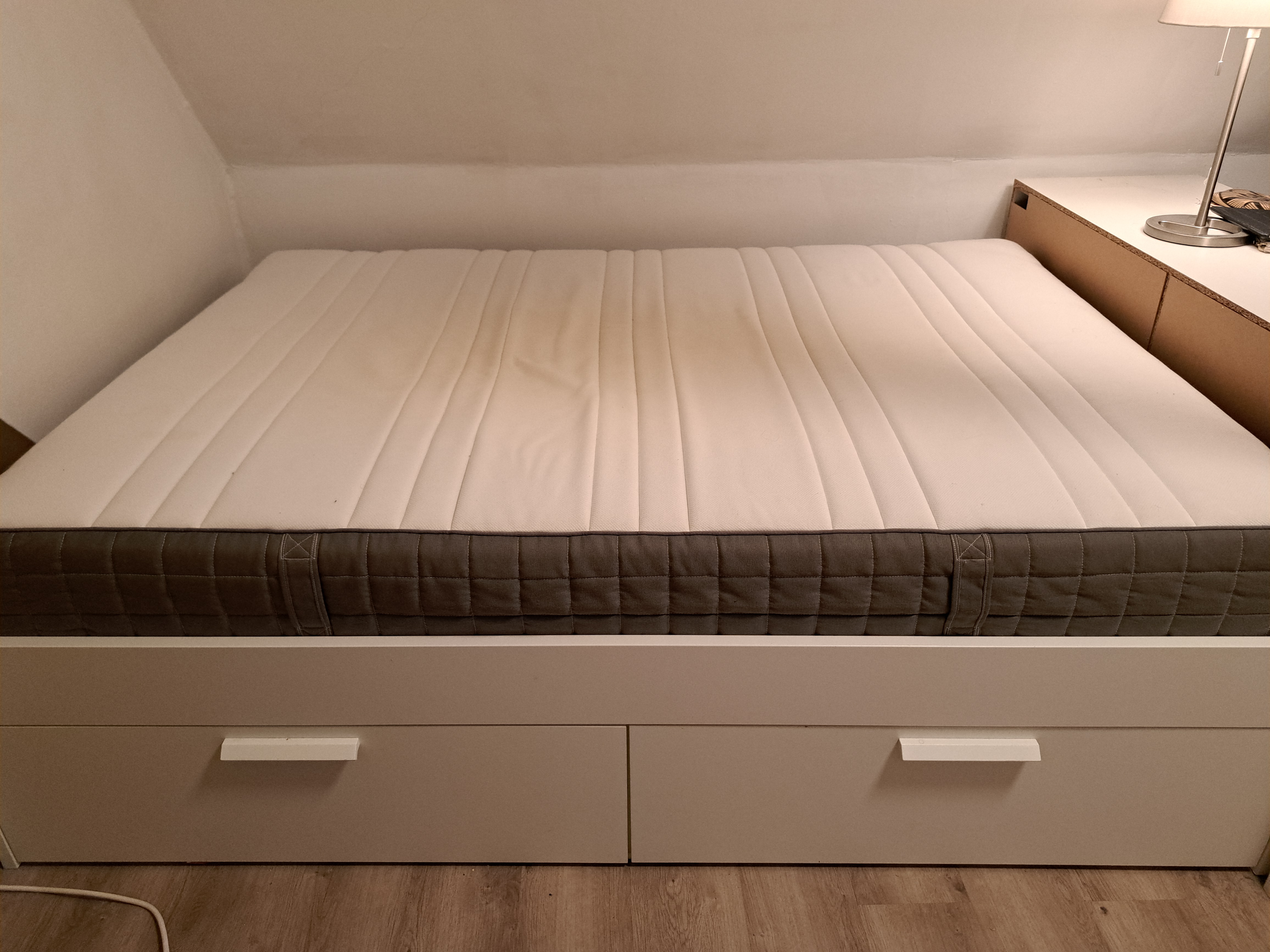 Ikea bed with 4 drawers. The bed is 1.40 m tall. A mattress is optional.