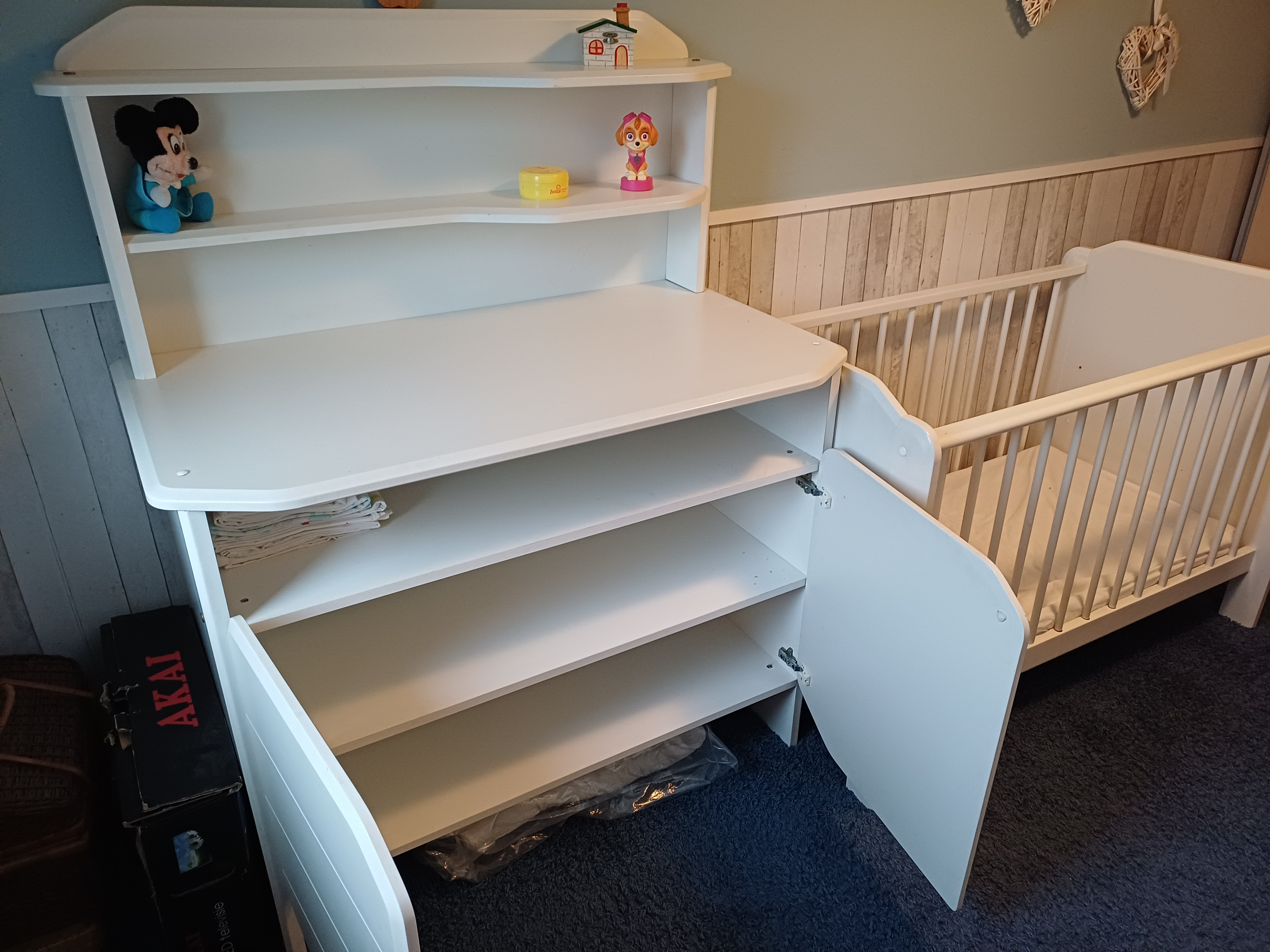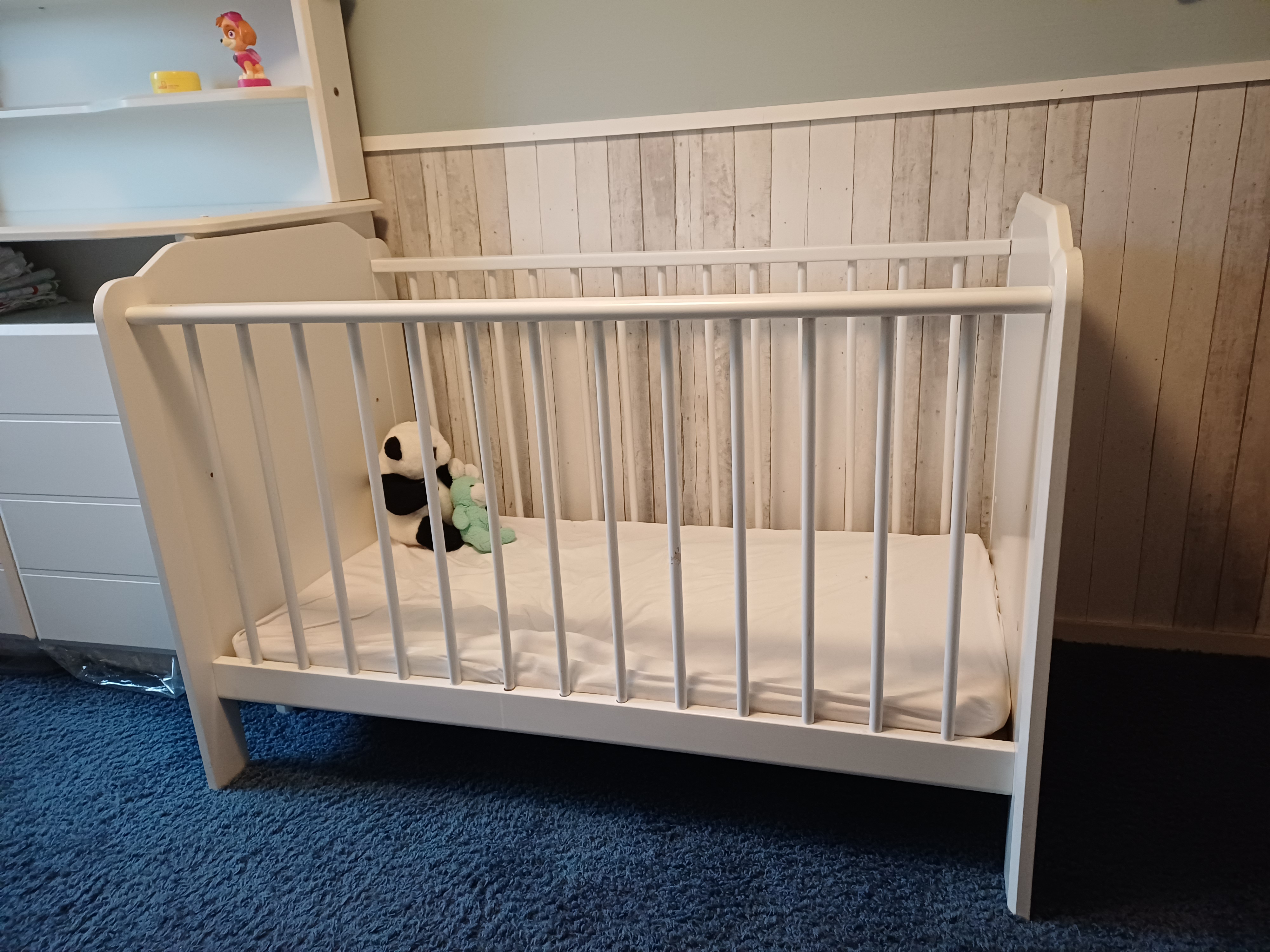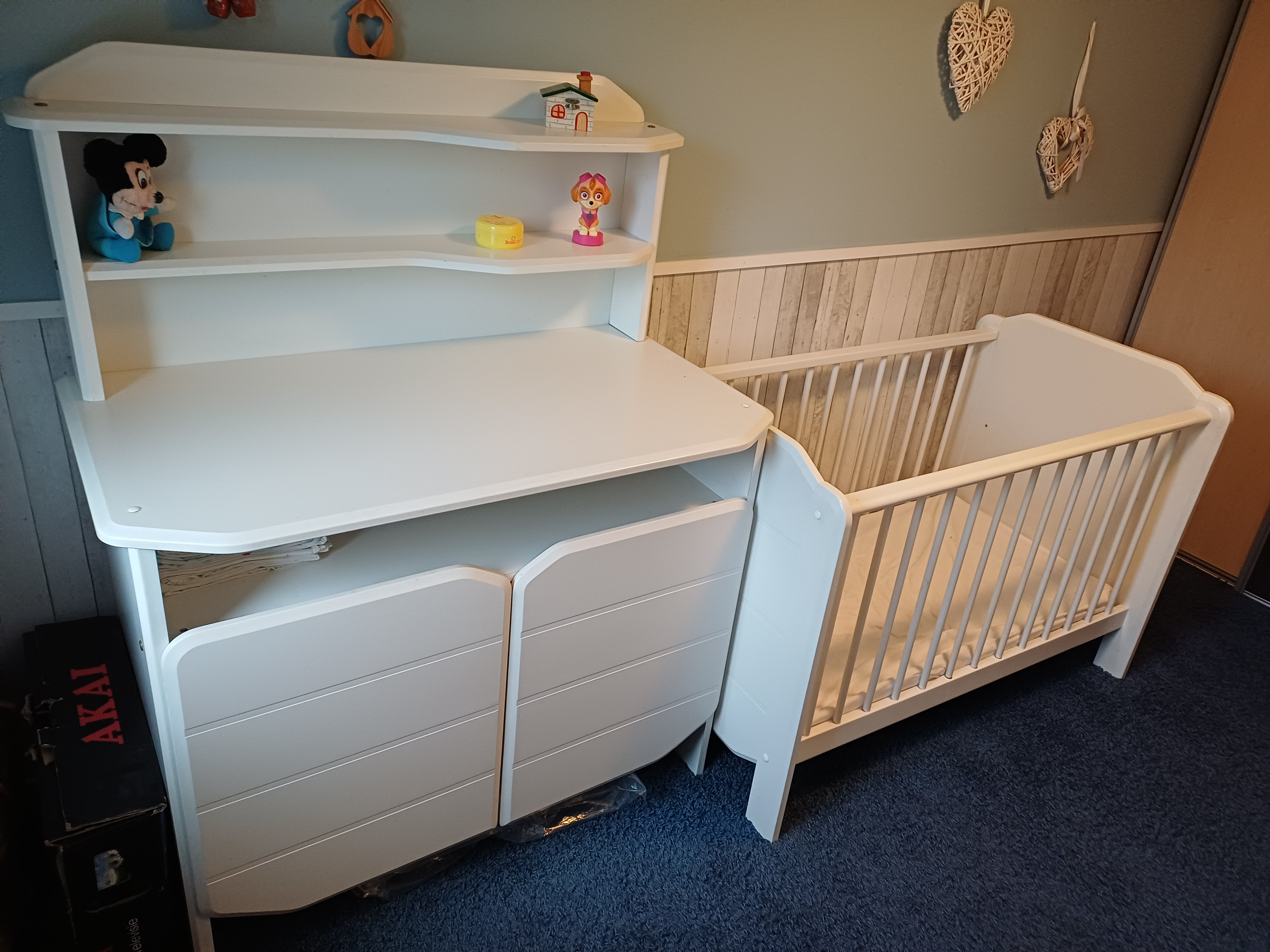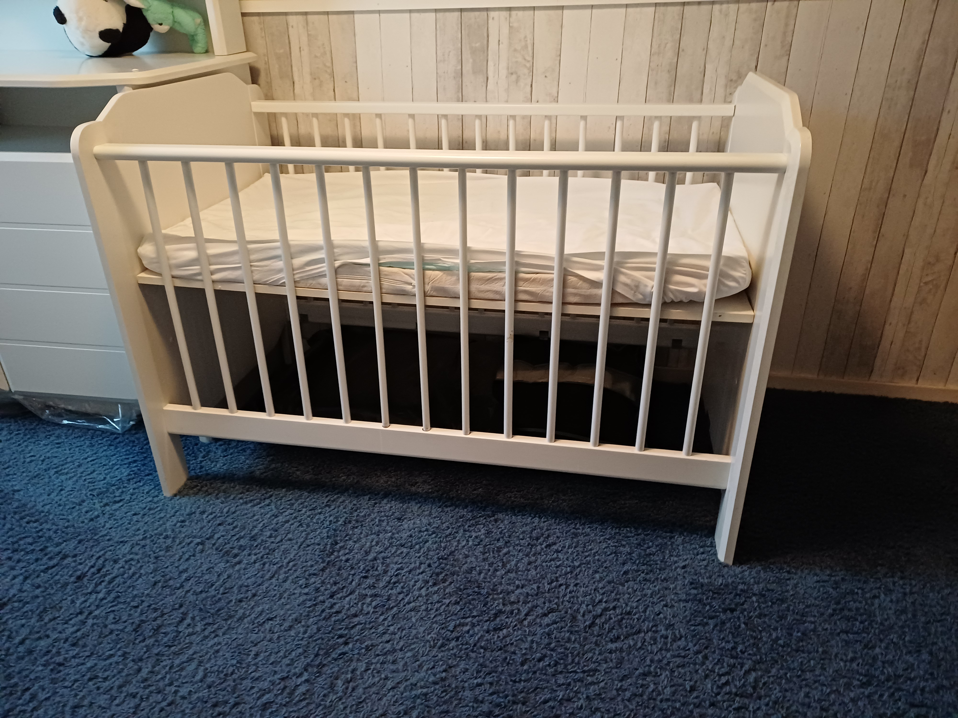White crib with matching dresser. The crib is height-adjustable. Mattress included.