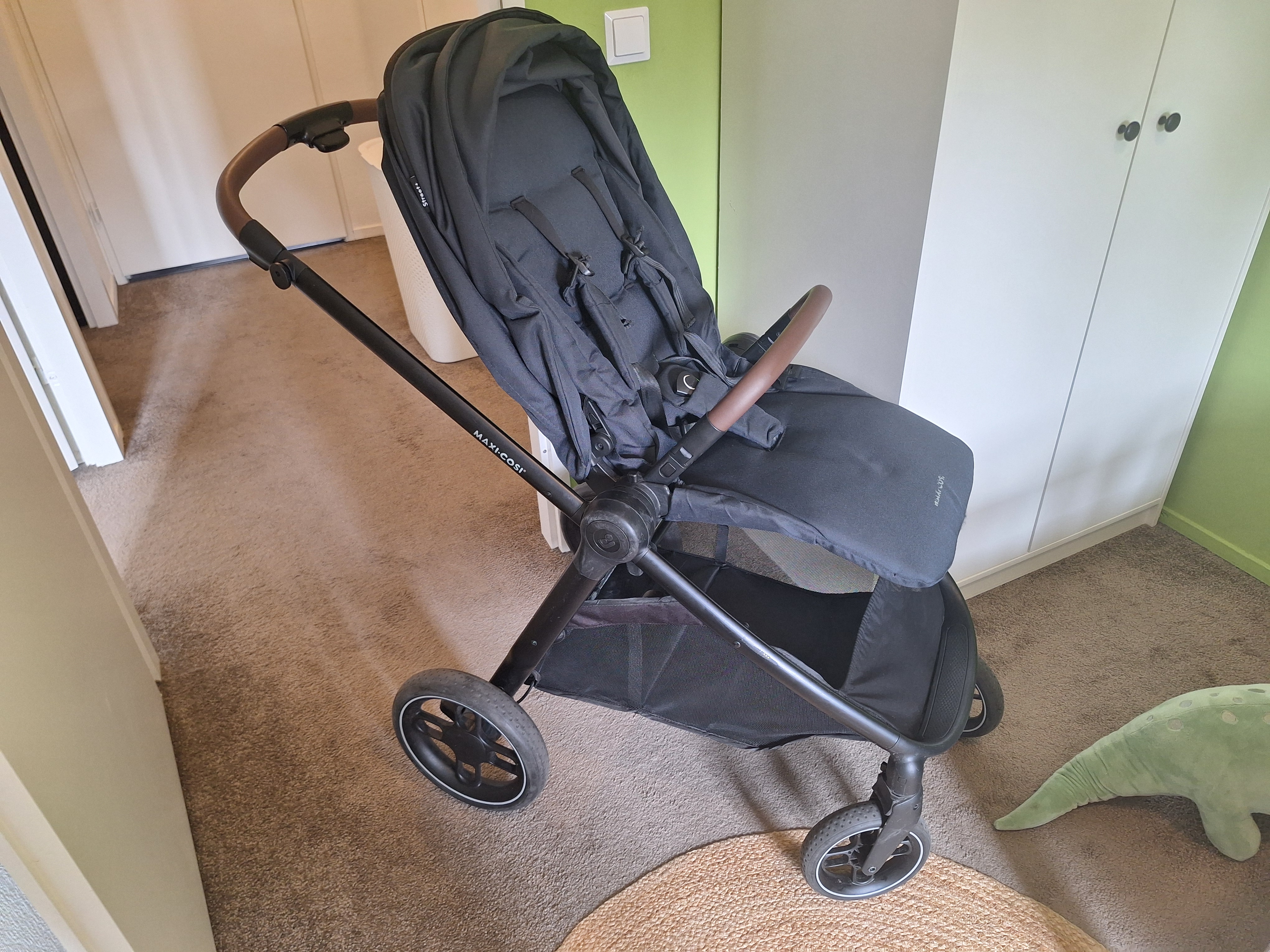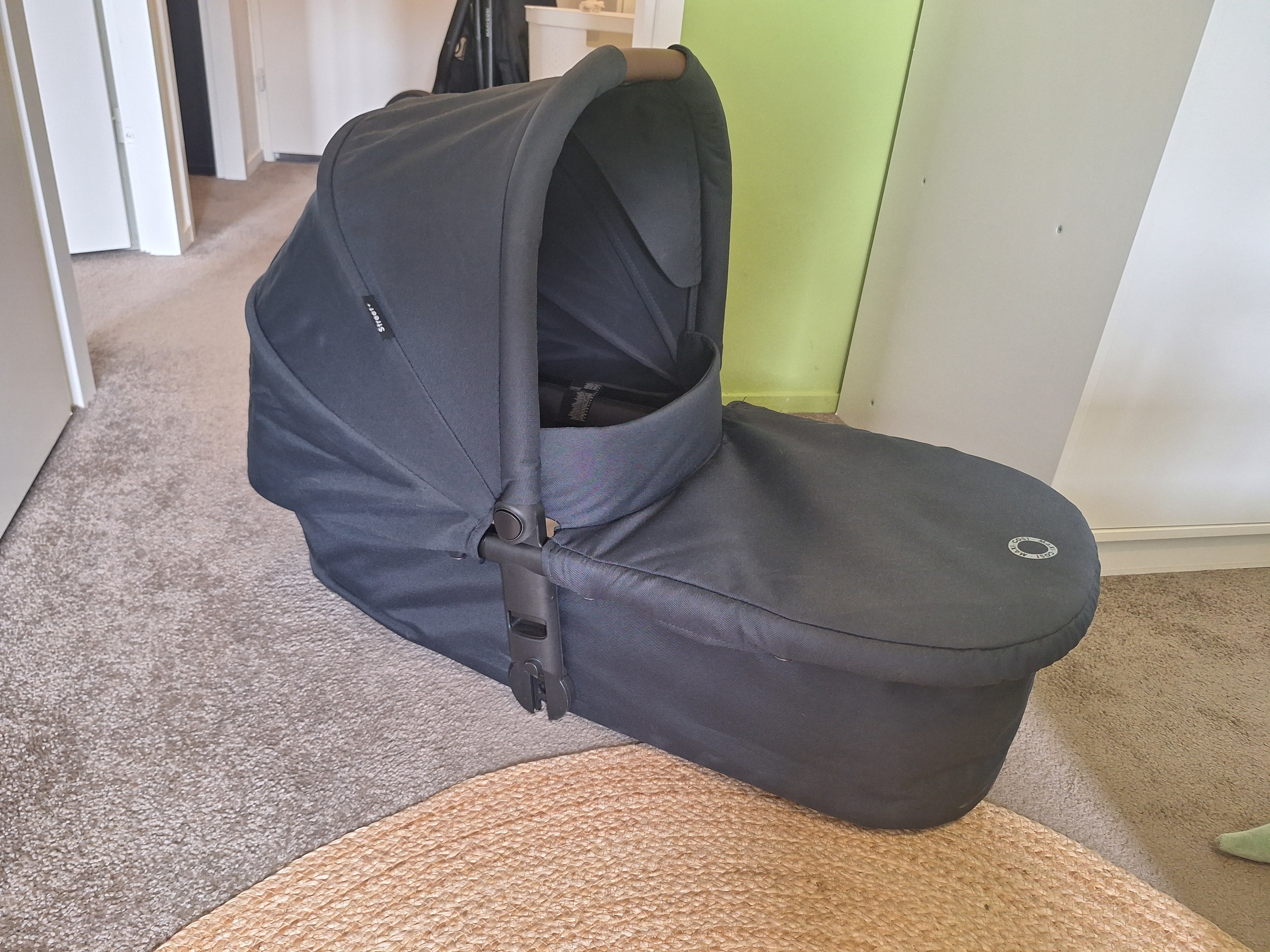 Maxi-Cosi dark blue stroller in good condition, including a click-on carrycot. The handlebar is adjustable, making it comfortable for taller people as well.