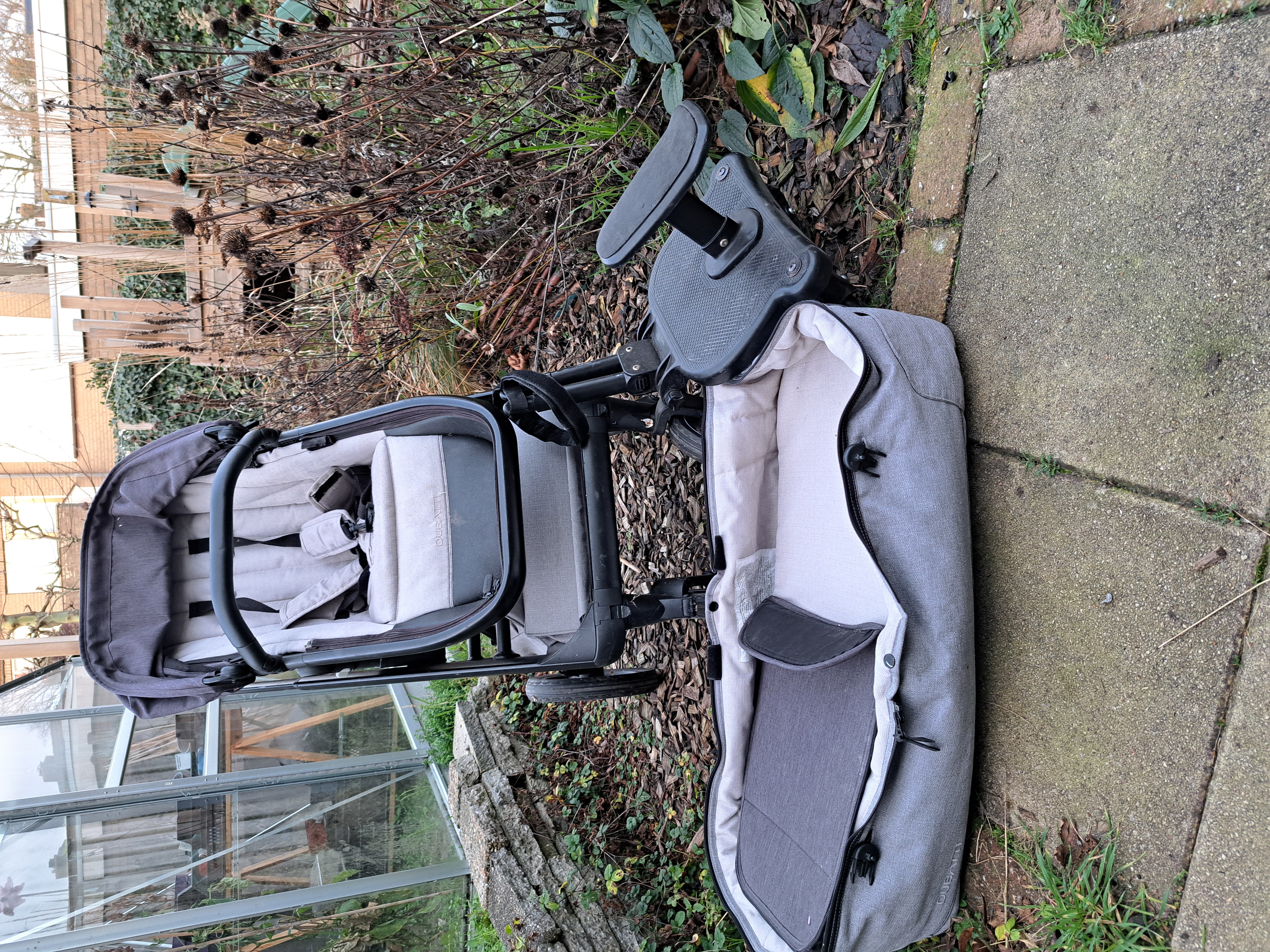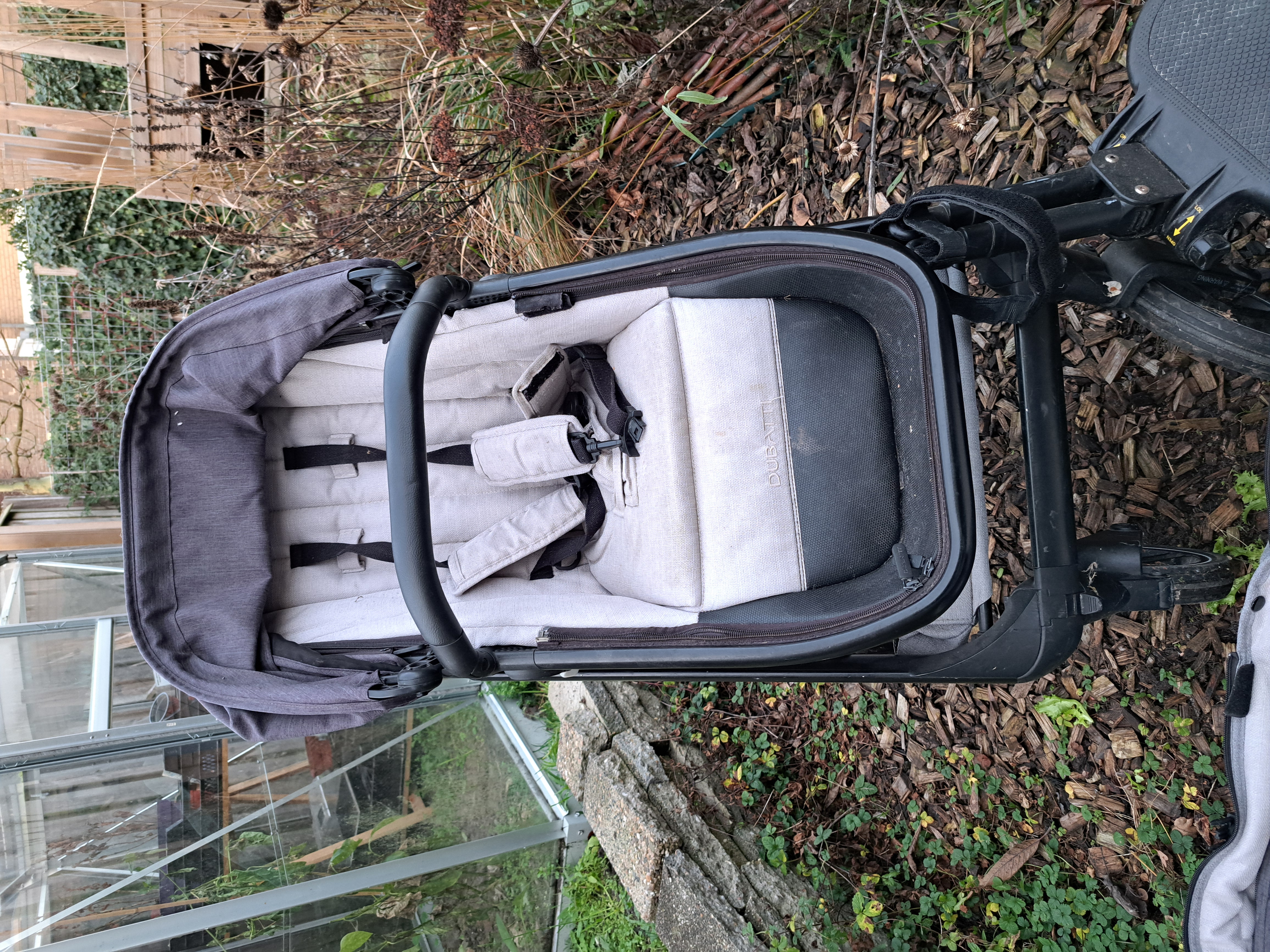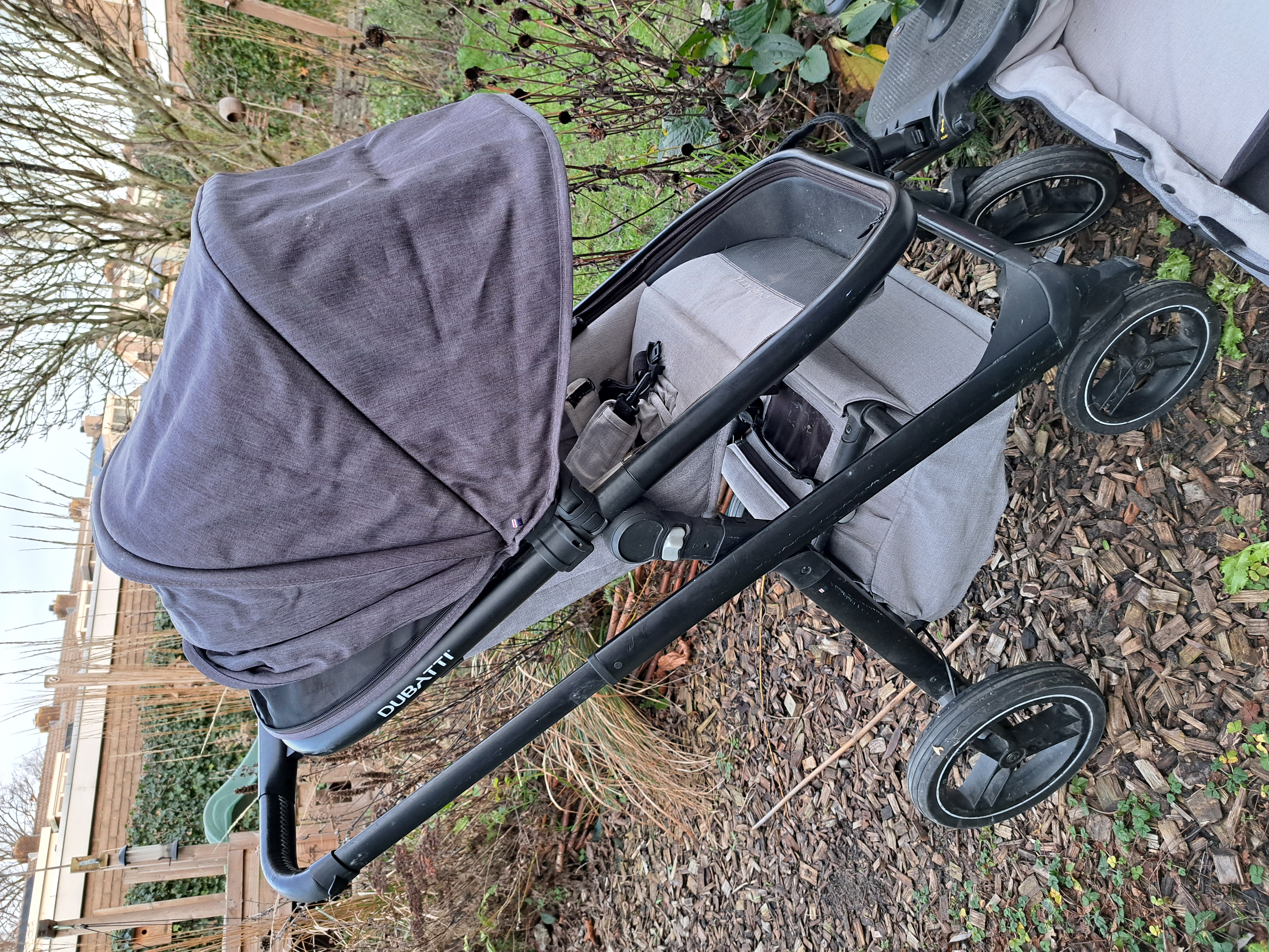 Dubatti stroller with bassinet and child seat. Good condition. A handy compartment at the bottom for your belongings. It also includes a rain cover and a seat tray for an older child.