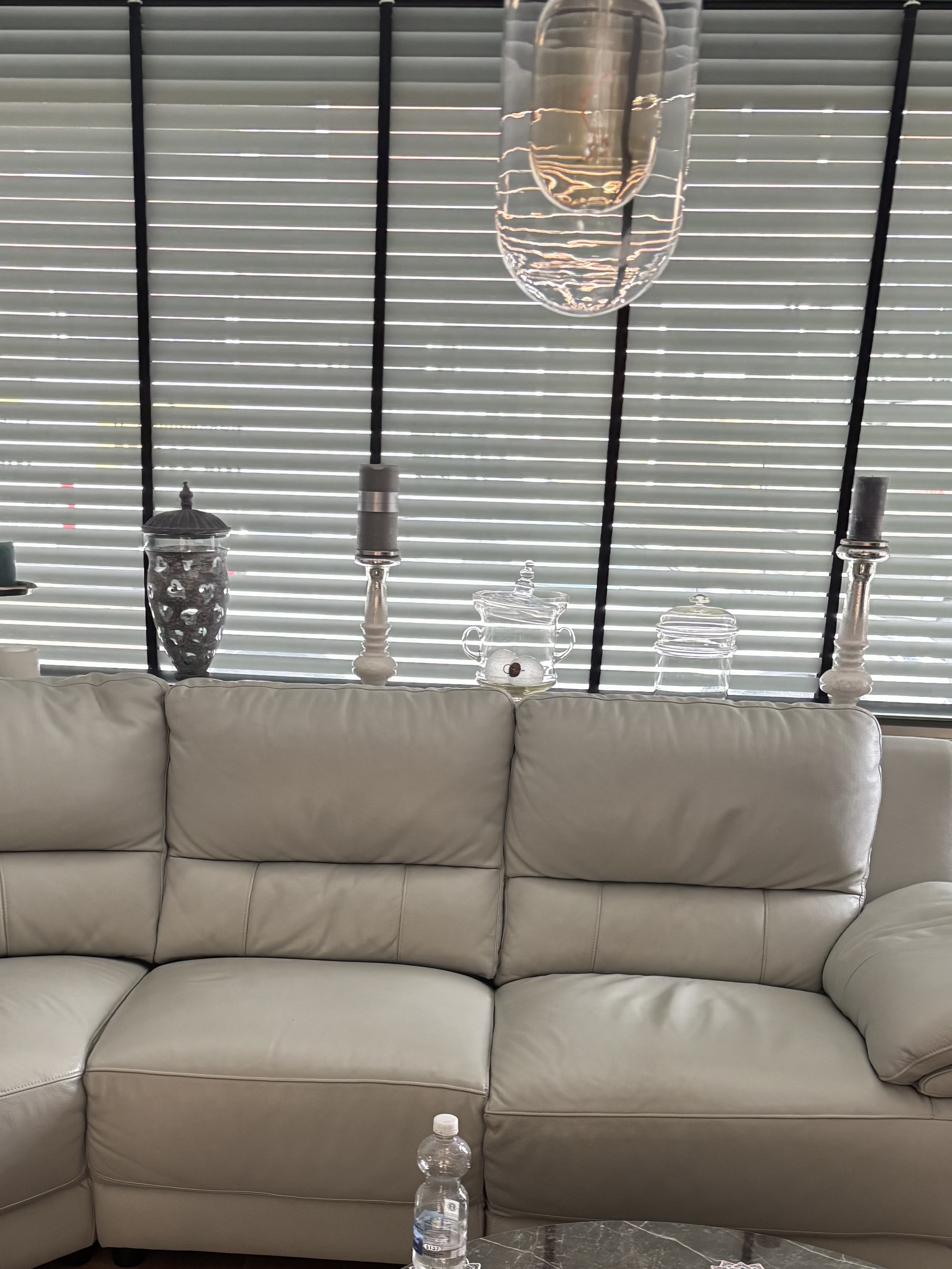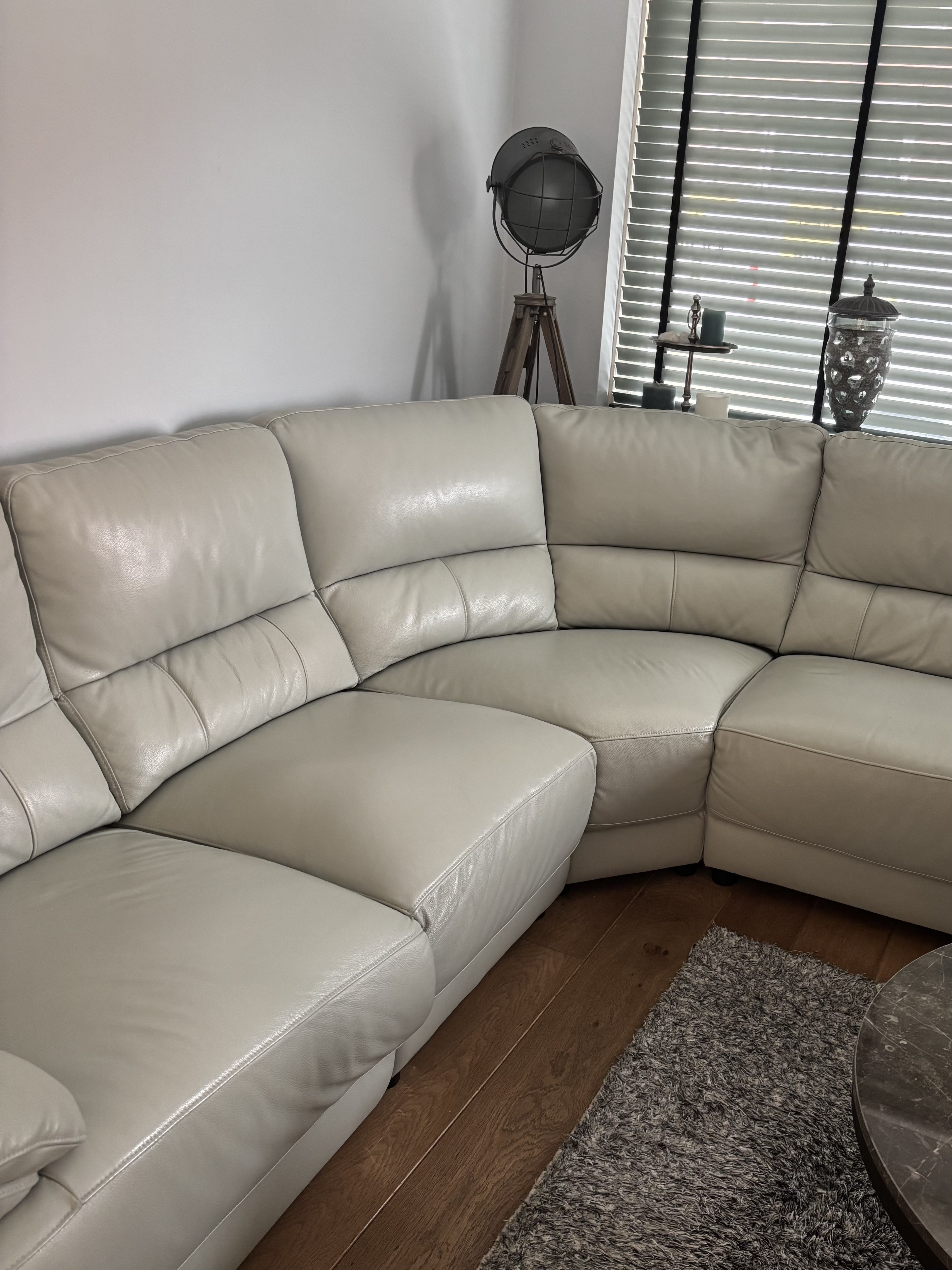 A stylish light gray sofa in good condition. The sofa is 6 years old and has always been well maintained. It is a modular sofa, which means the parts can easily be taken apart - handy for transport or to adapt the layout to your living space. ✅ Color: Light gray ✅ Material: Eco-leather ✅ Accessory: Charging point in the sofa for electronics and electric fold-out footrest ✅ Age: 6 years ✅ Condition: used, but neat and clean ✅ Special features: loose parts (easy to move or combine) ✅ Comfort: very comfortable, with firm but soft cushions