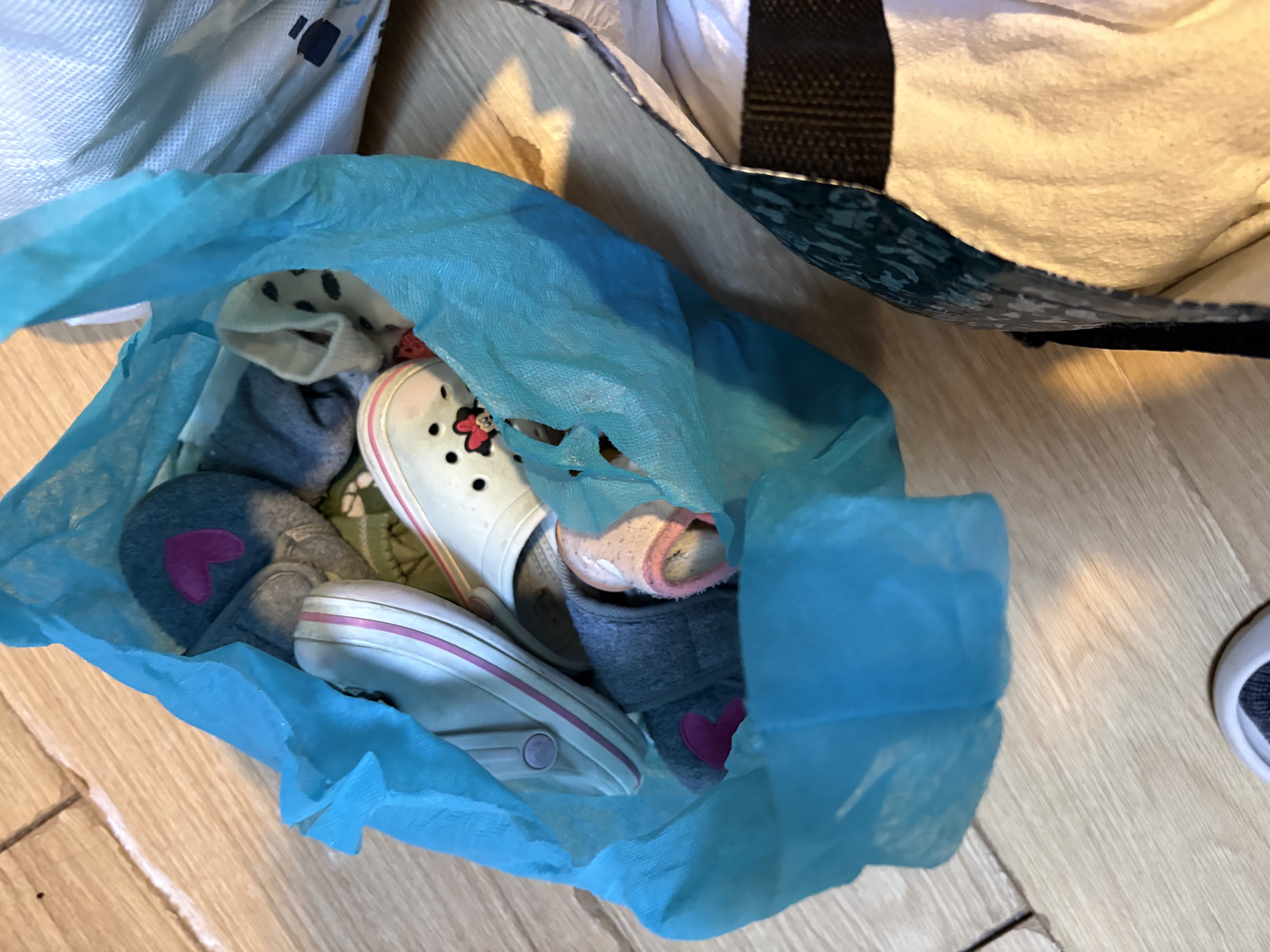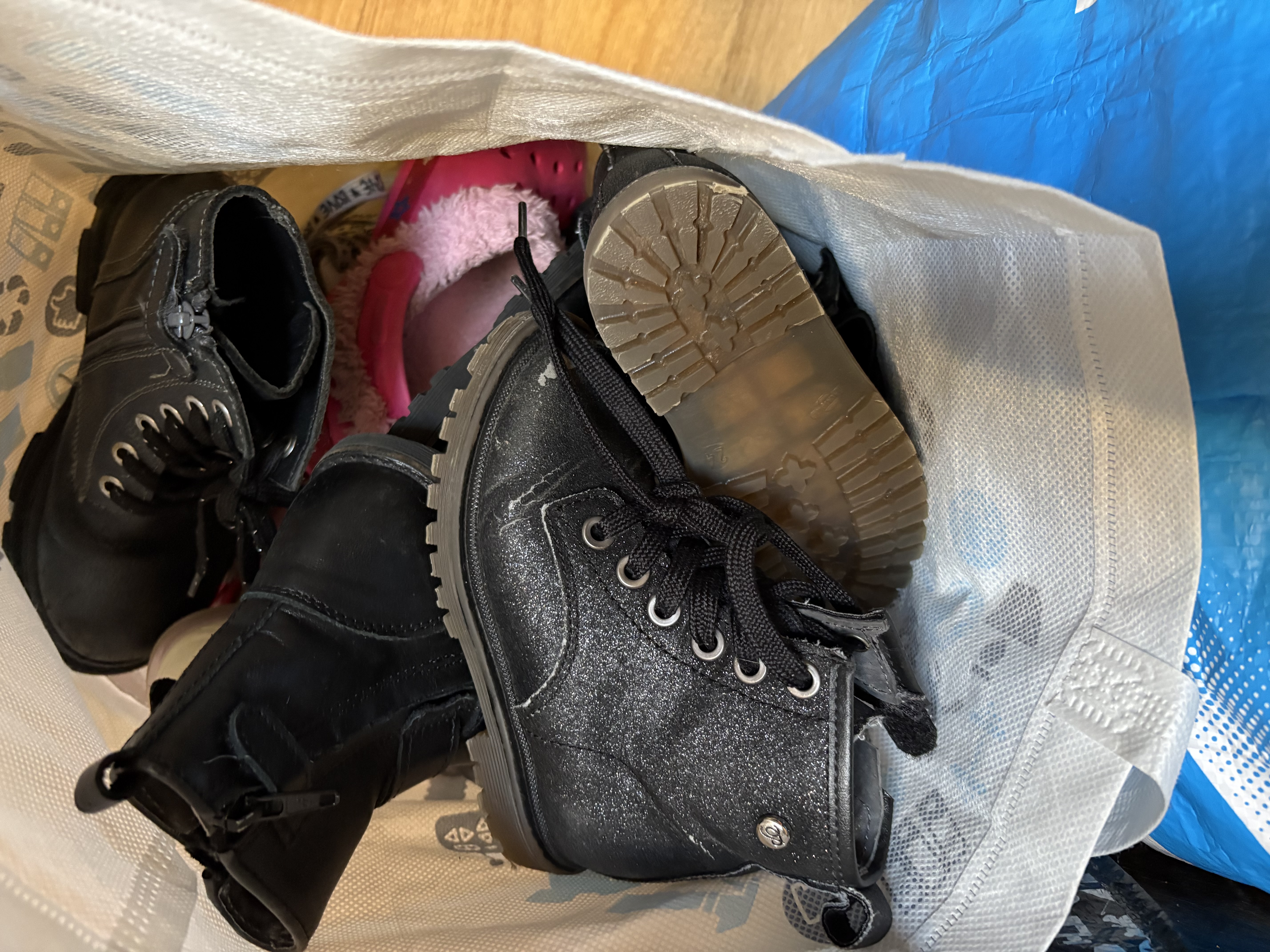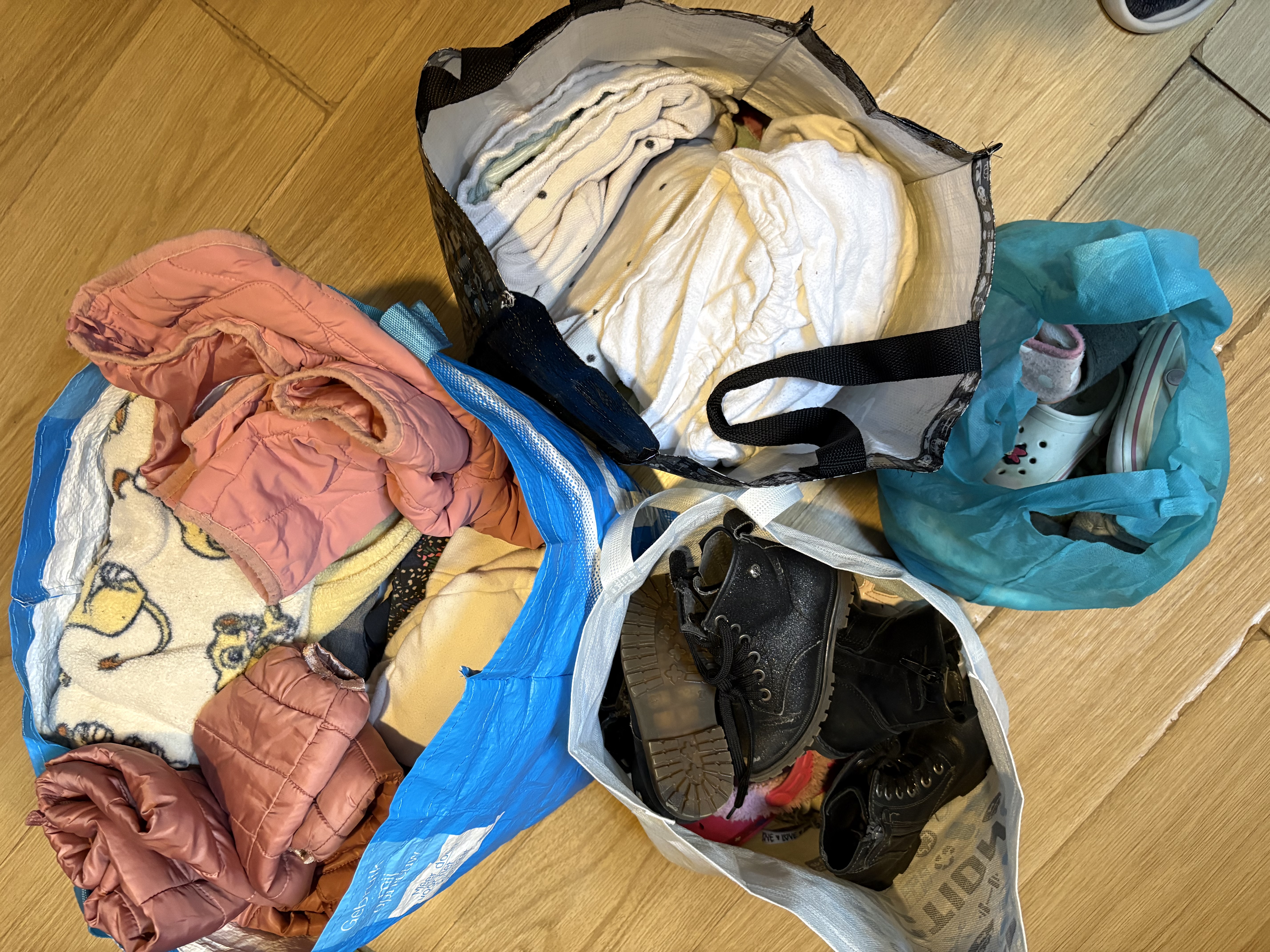 Girls' clothes in sizes 80/86 to 104. A bit of everything. Rompers, pajamas, shoes, booties, socks, sleeping bag, bathrobe, jackets, jeans, and some shirts. Used but still in good condition. Also a mattress protector and crib cover, and some bath capes and towels for after swimming/showering. Shoes are in various sizes, including some larger sizes.