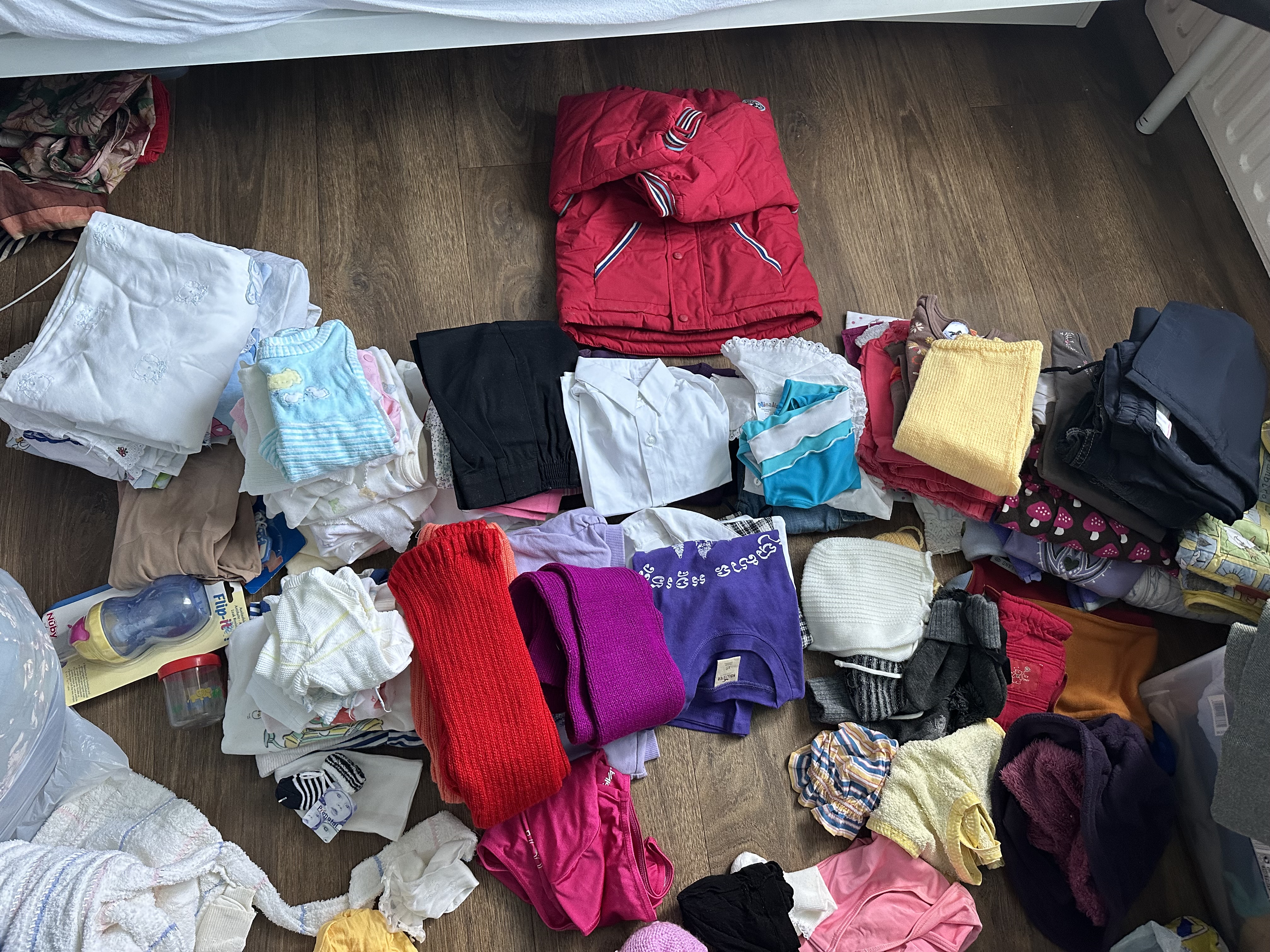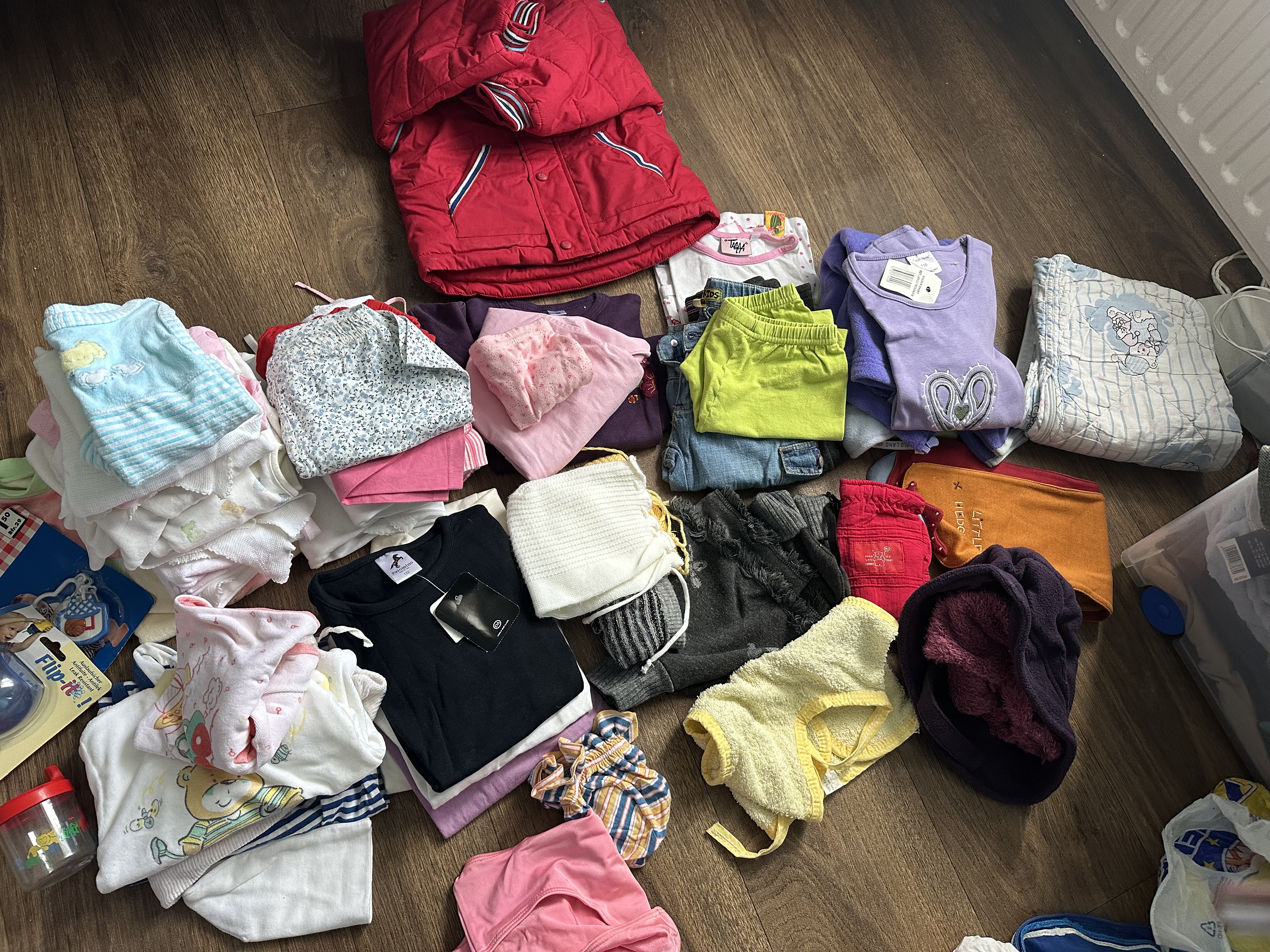 Baby clothes: clothing, socks, sleeping bag, bed sheets. Girls' clothes up to size 128: clothing, tights, socks, gloves, scarf, and hat. All in good condition.