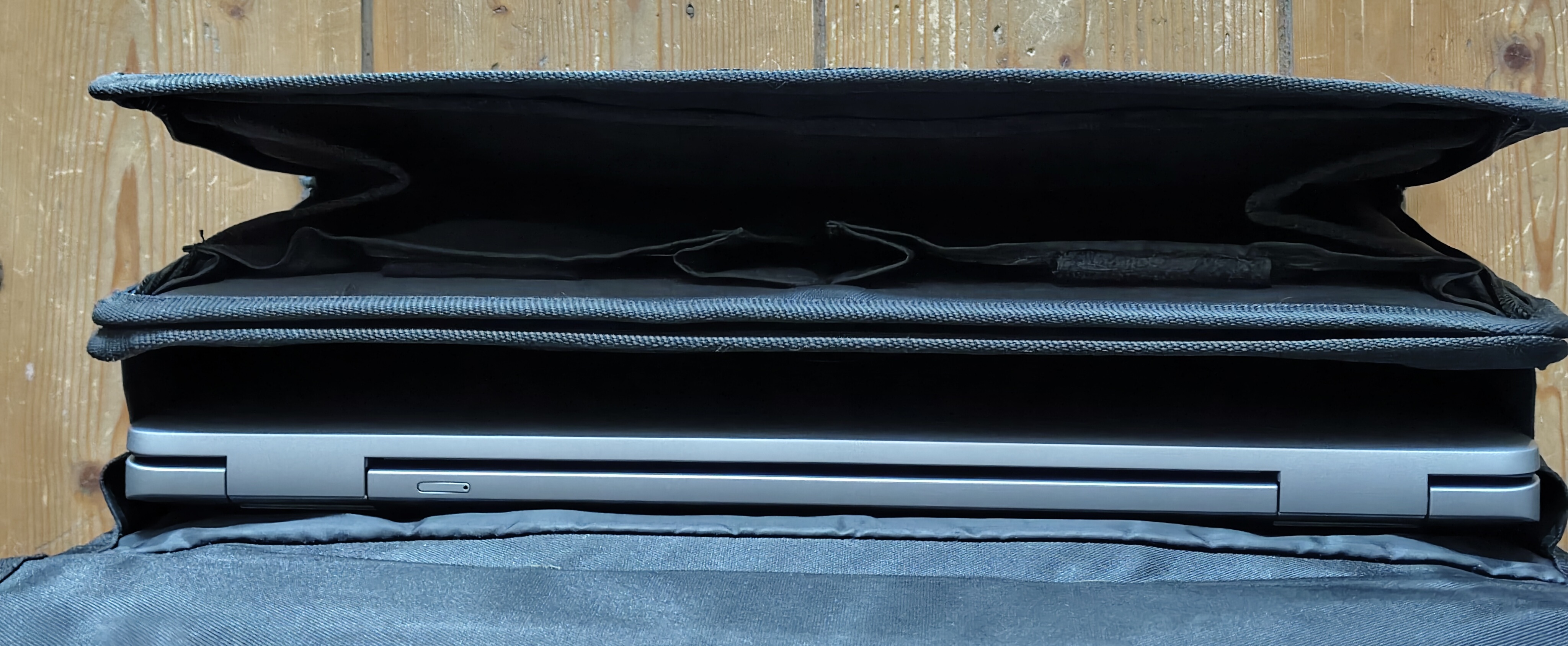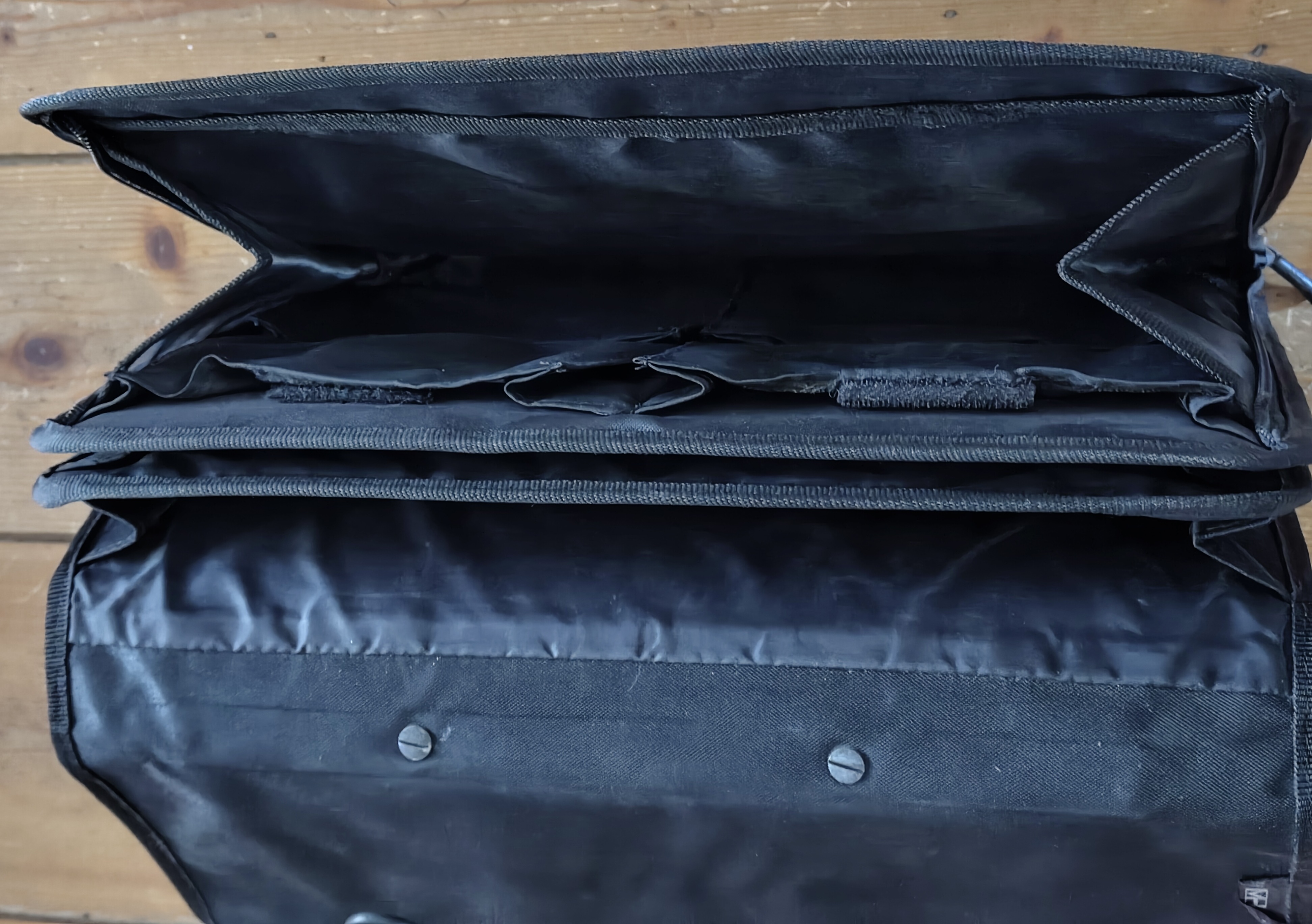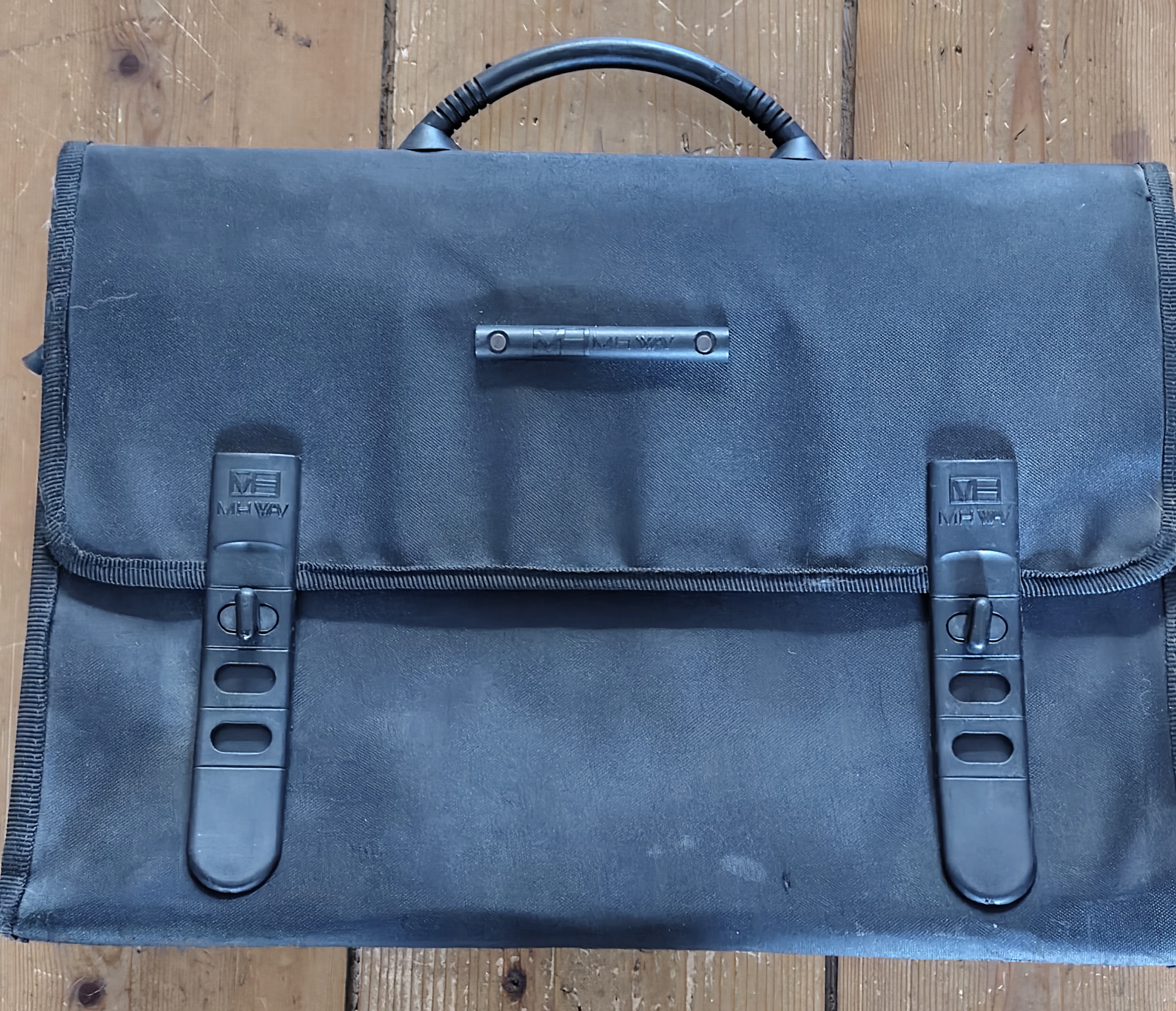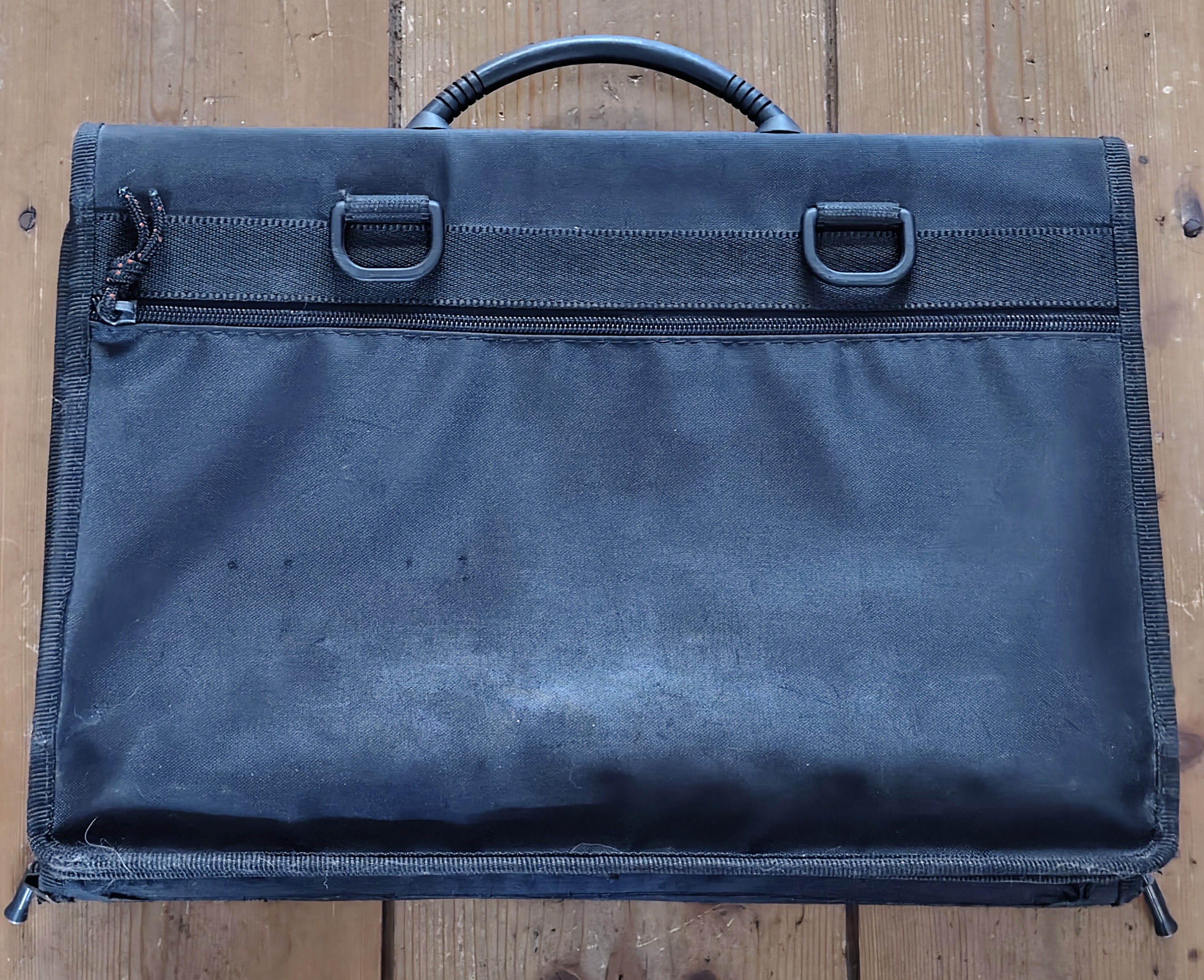 These bags are designed by Makio Hasuike. A simple, flat laptop bag, large enough for a 17" laptop with extra space for some paperwork, a mouse, and a charger. Used frequently, with clear signs of wear. Pickup only in The Hague; I will not ship this bag.