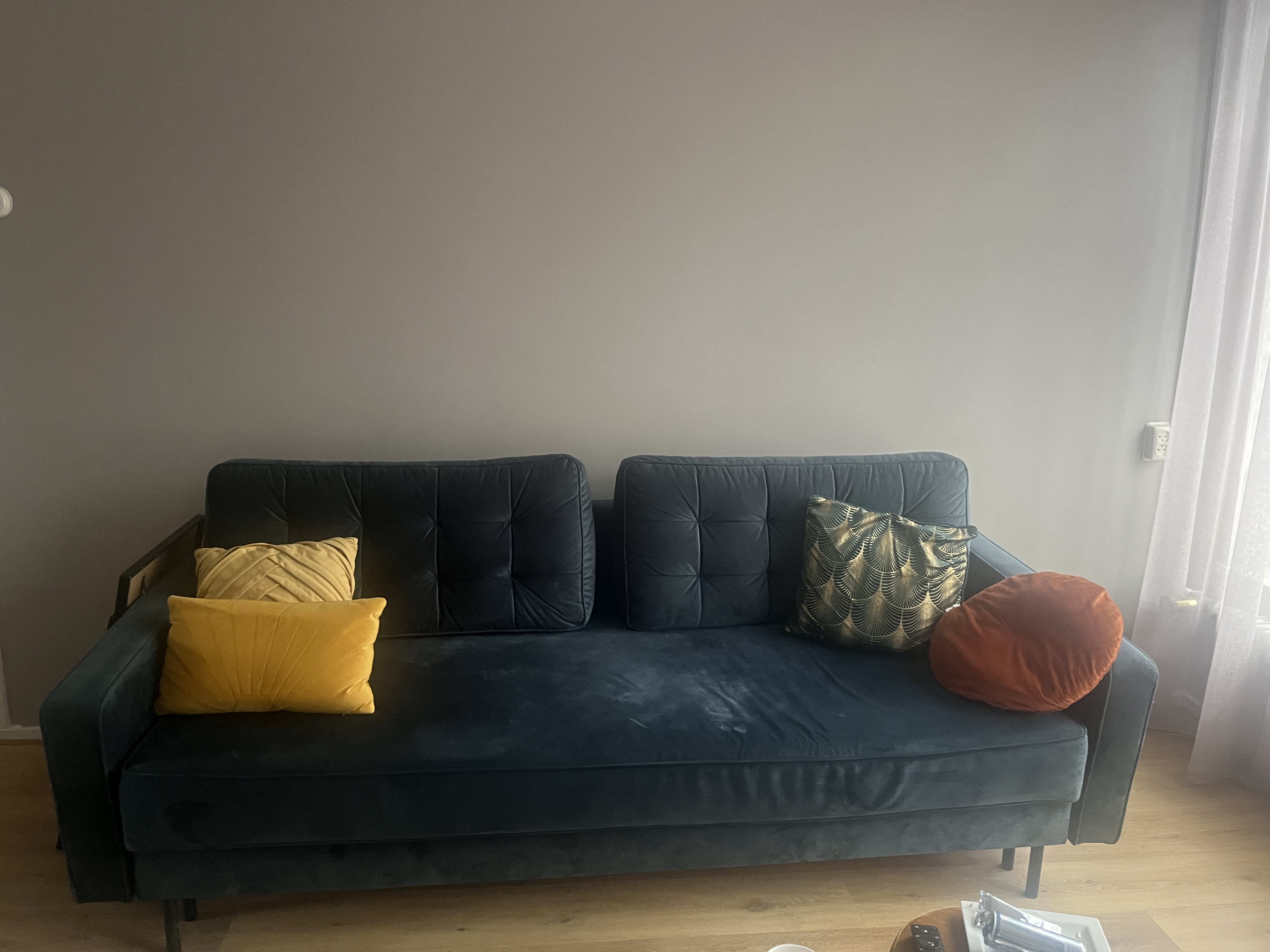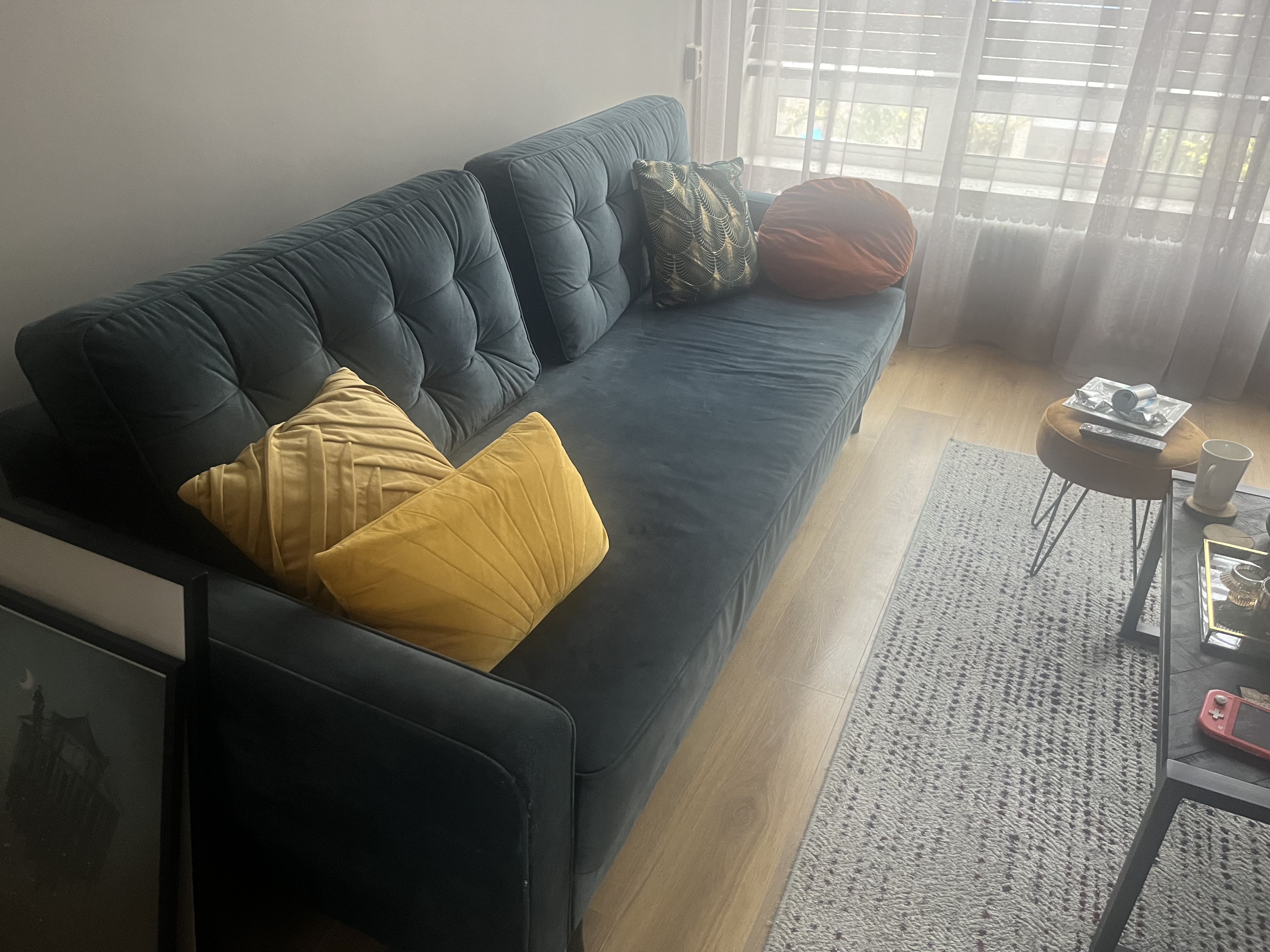 I'm offering this beautiful blue sofa. Used, but in good condition. 2.20 meters long and 90 cm deep.