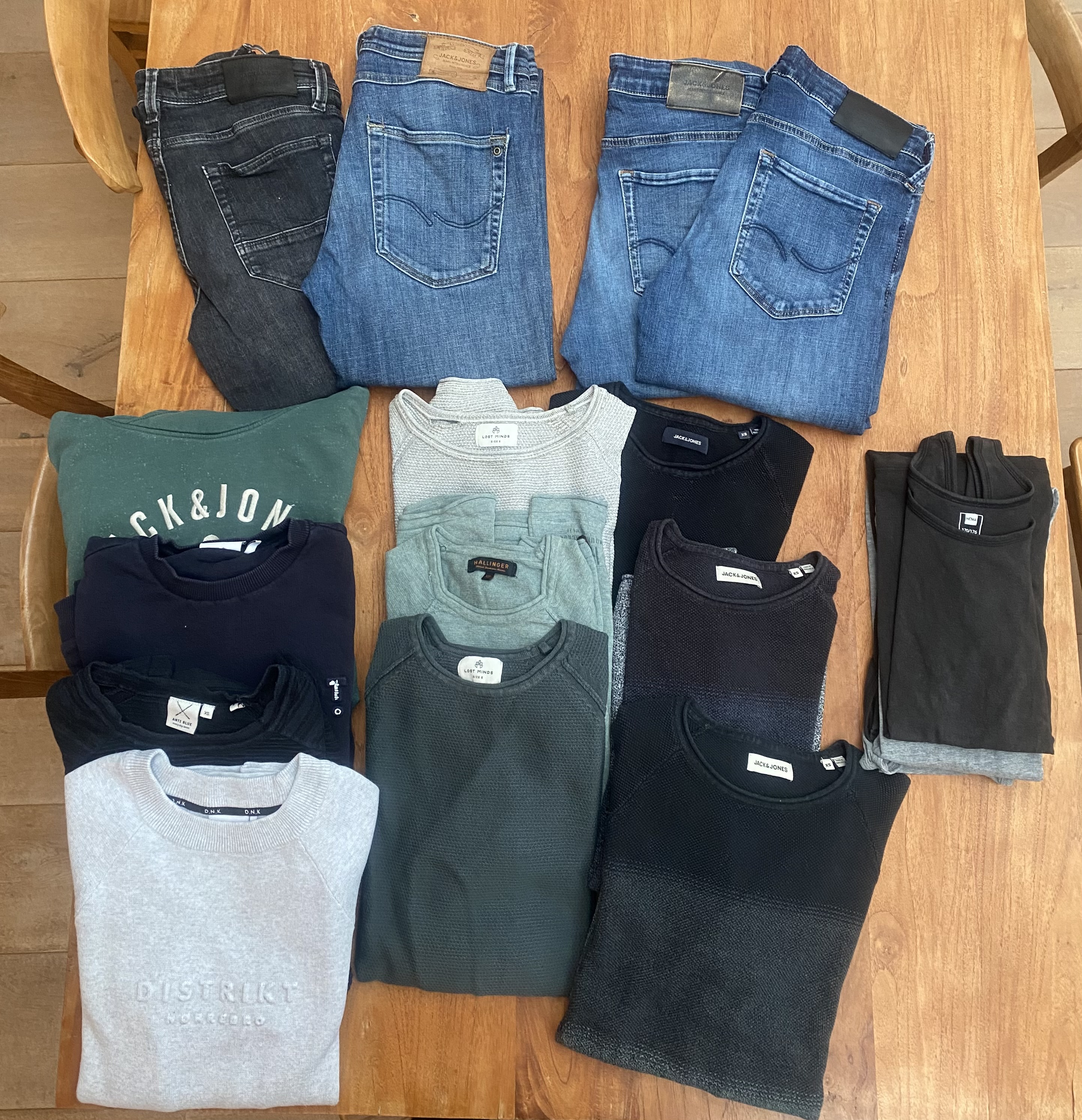 Jeans and long-sleeved shirts.