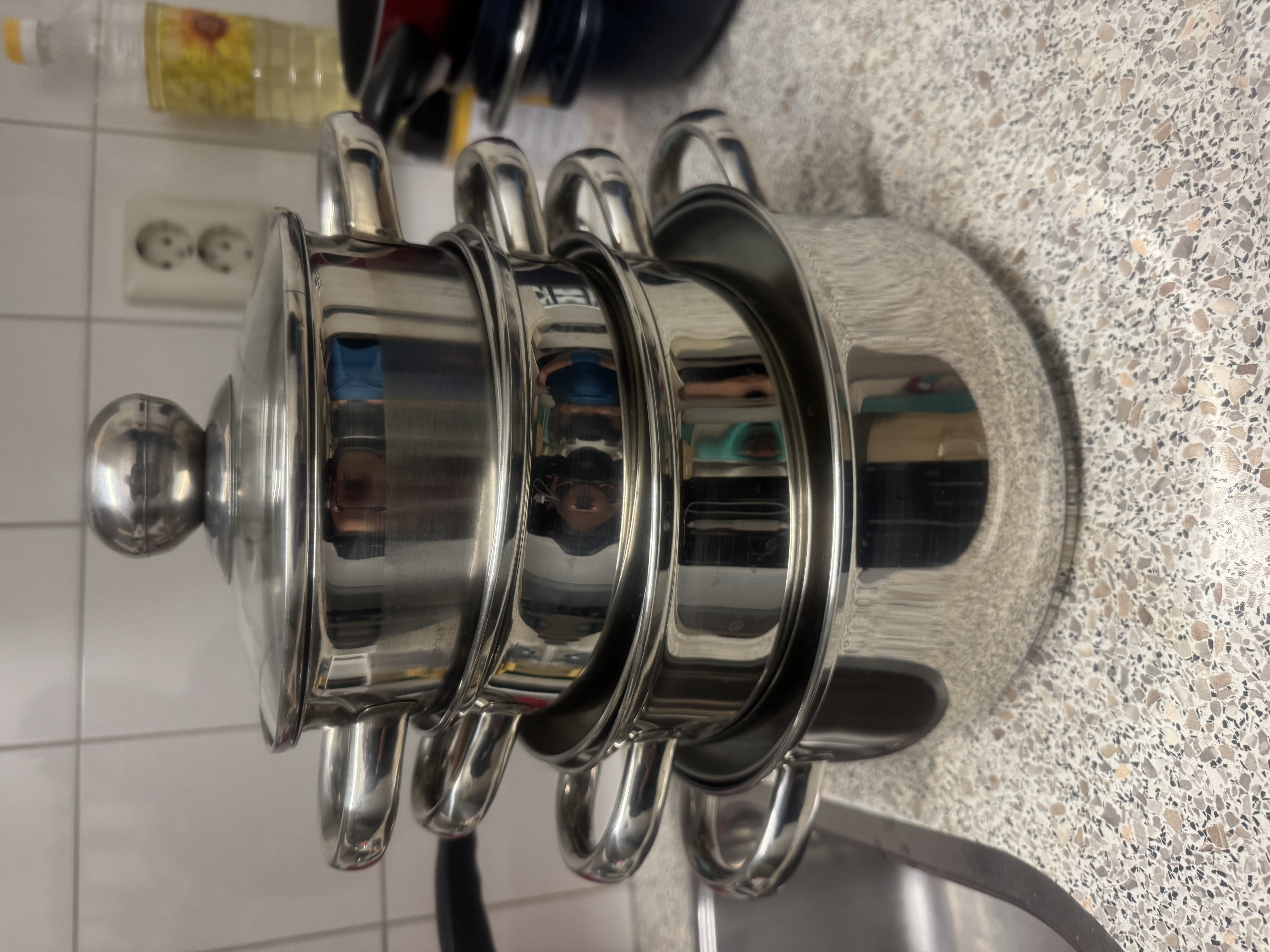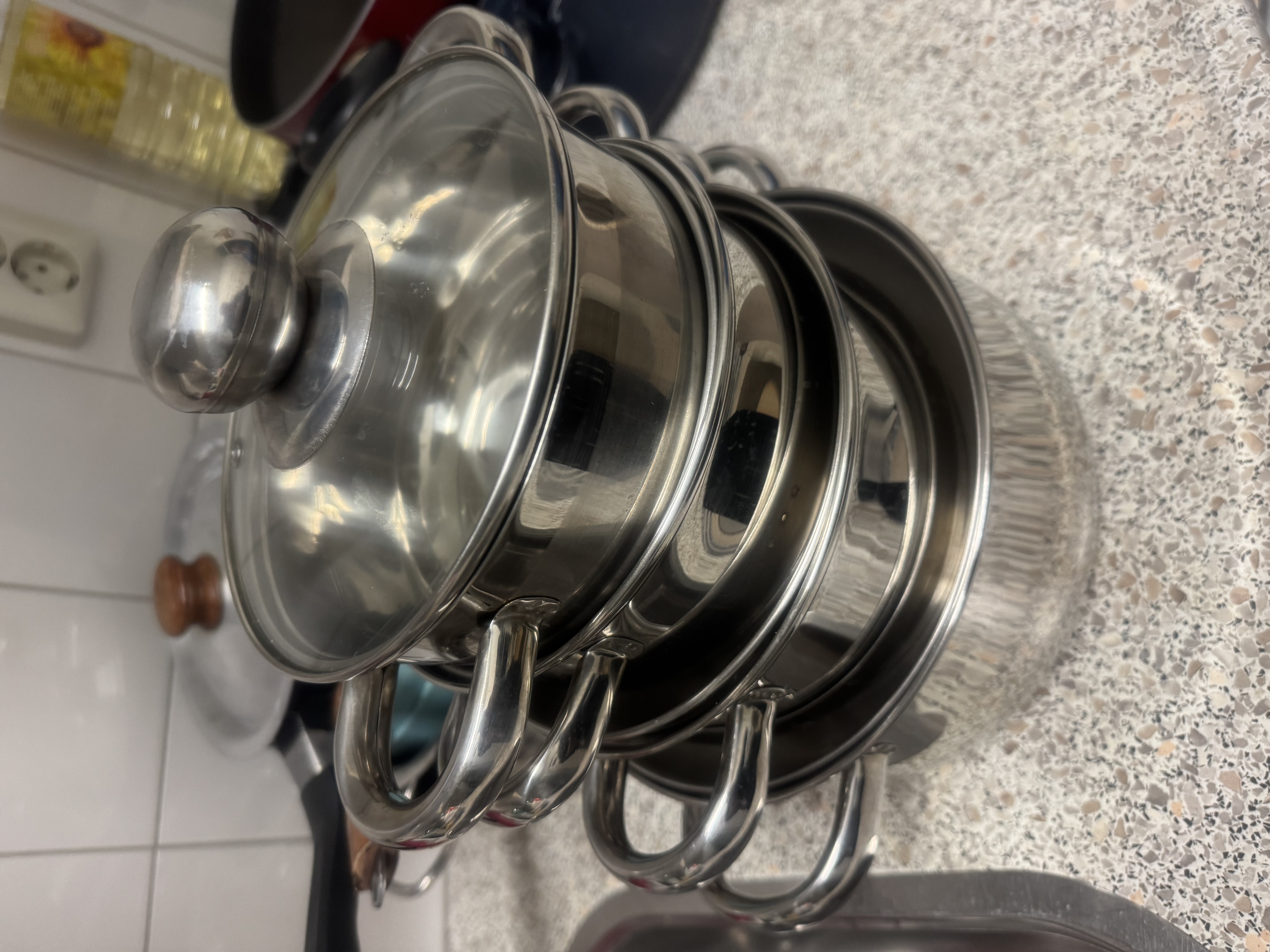 Four pots for cooking. We're offering these because I'm moving and haven't gotten rid of them. They're very well-maintained and barely used. €10 for everything. The money will go towards the move.