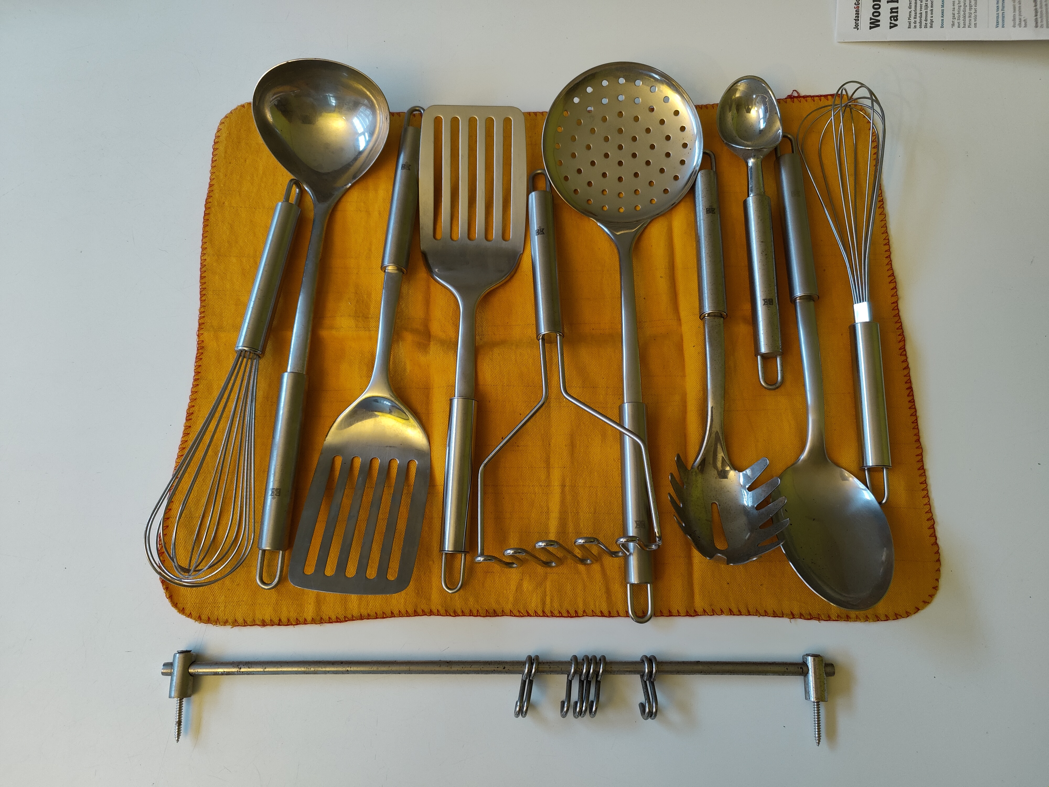 Wall rack with 8 hooks and 10 pieces of kitchen cutlery. Free pickup in Amsterdam. Due to a death, the house must be vacated by January 28th.
