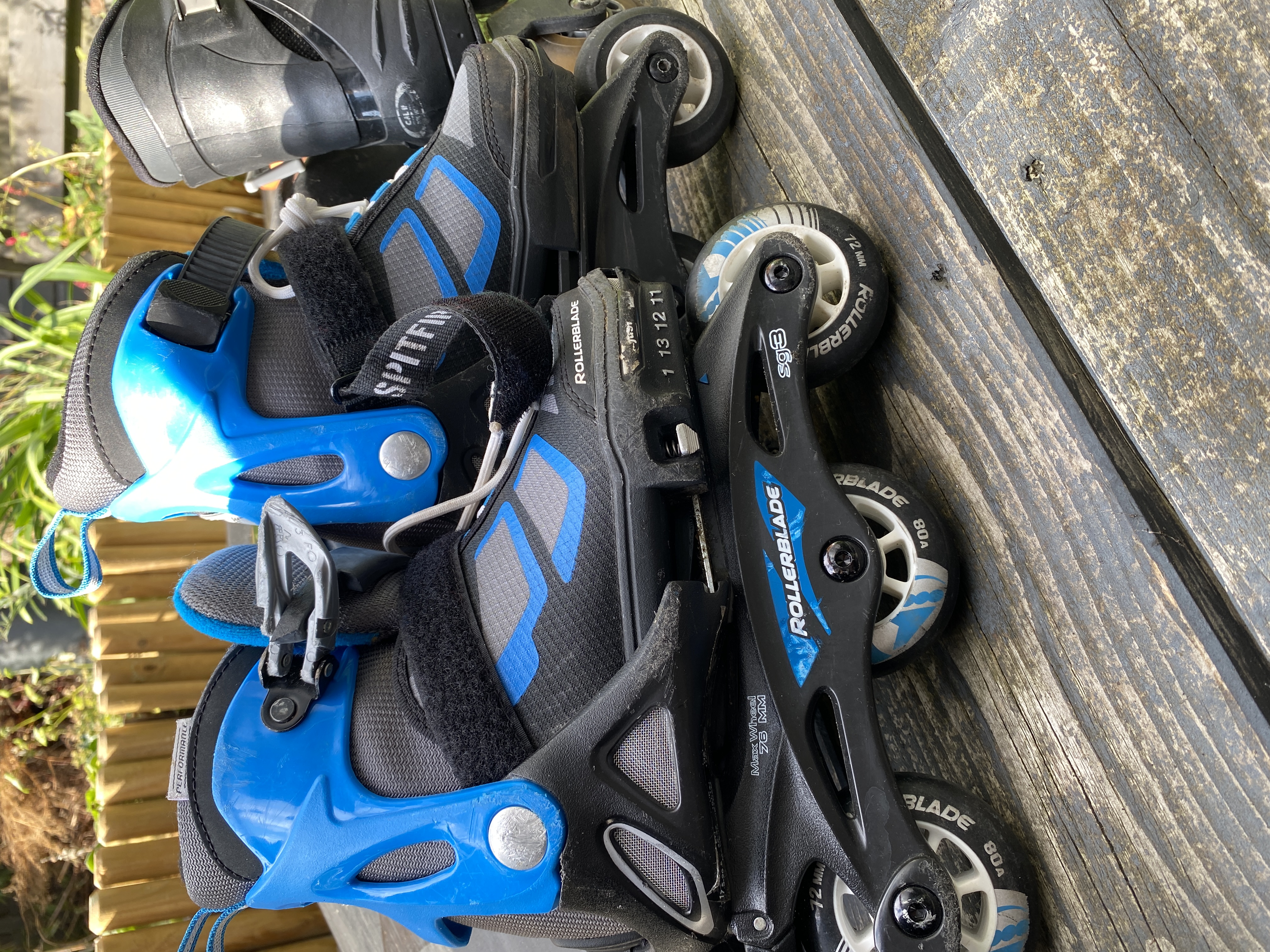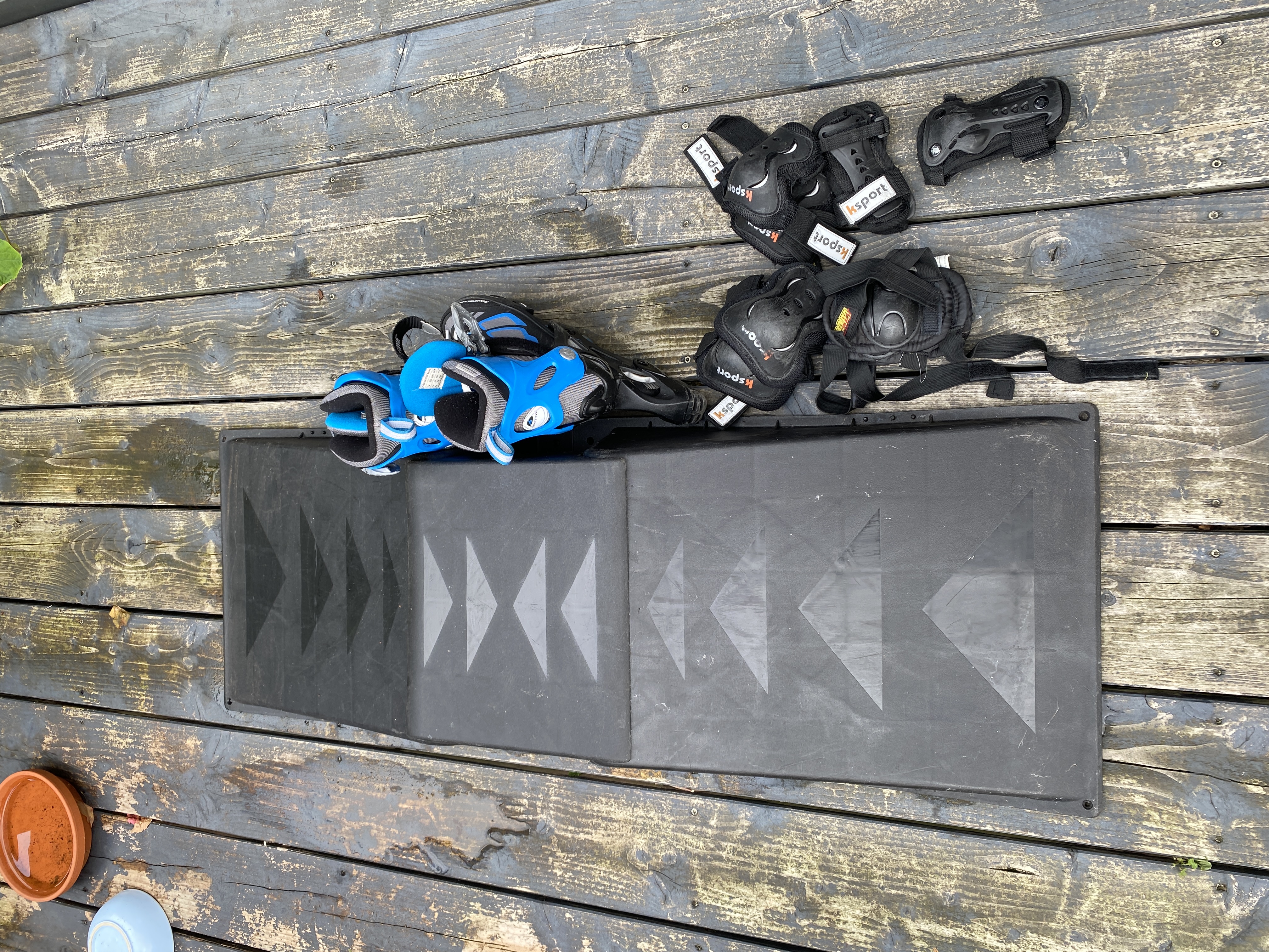 - One pair of Rollerblade skates. Size 28-32, extendable. Hardly used. - Skate ramp and protection for knees, elbows, and wrists.