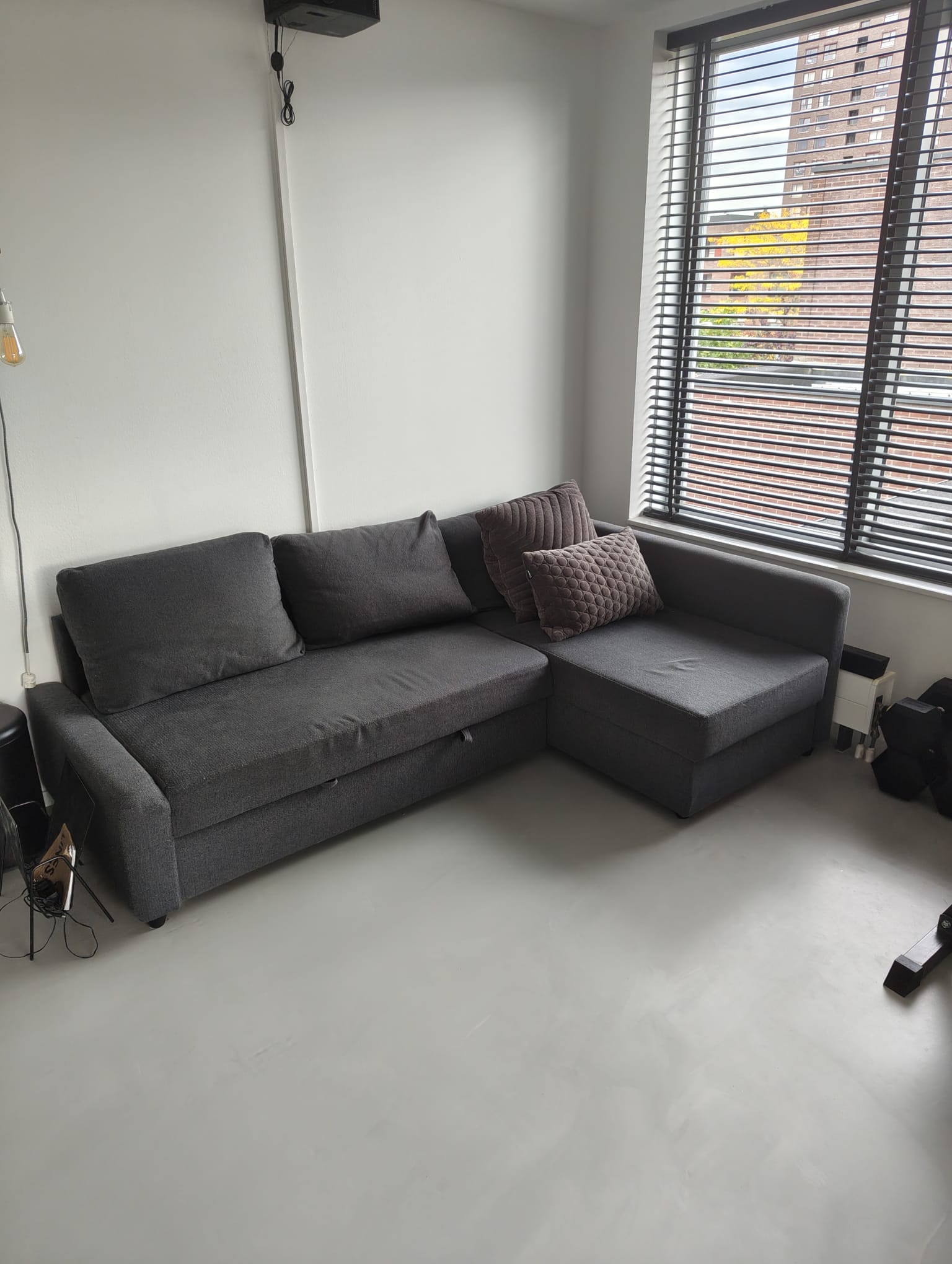 A gray sofa bed. Easily converts from a corner sofa into a double bed. It also has extra storage space for pillows and blankets.
