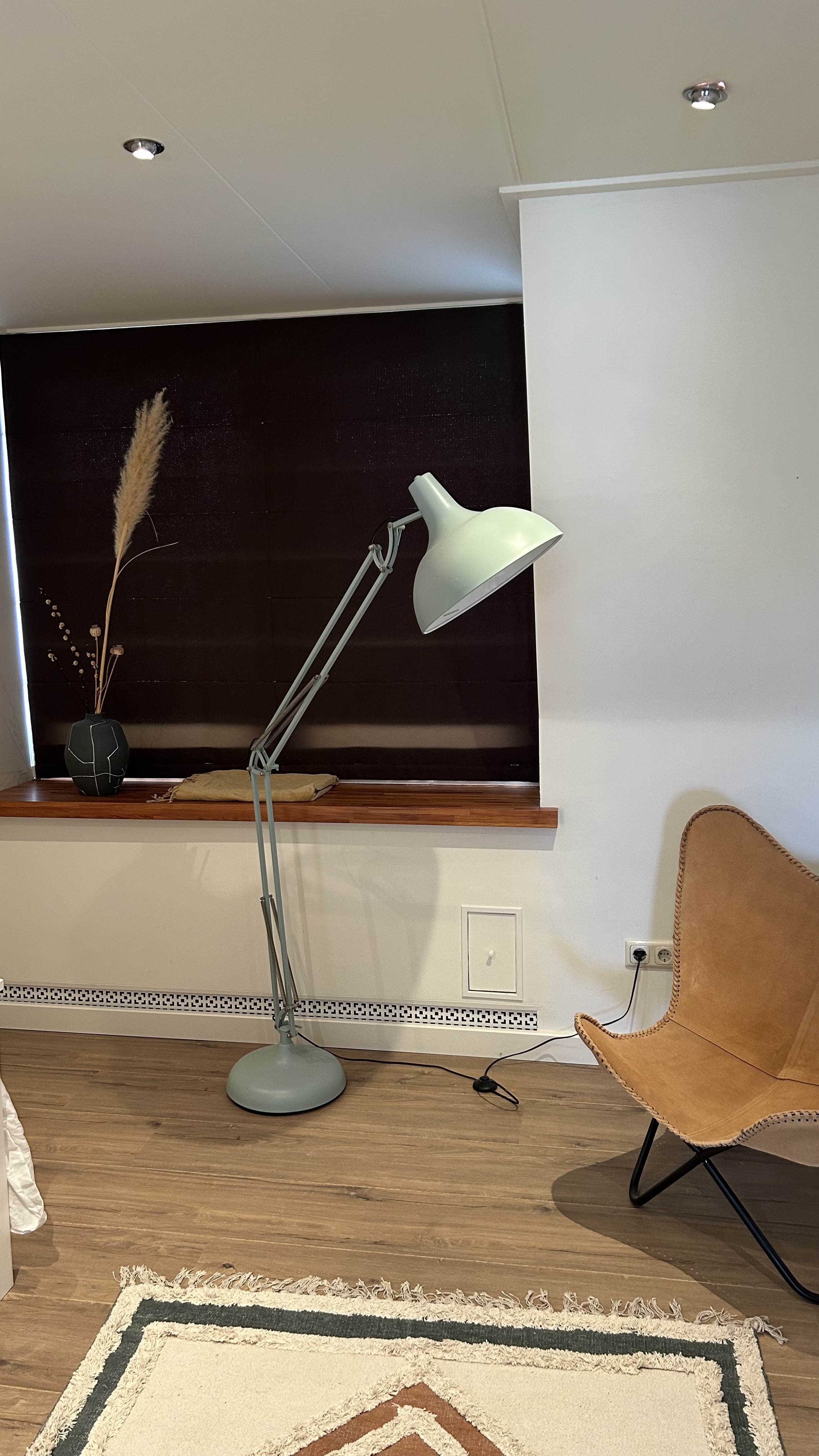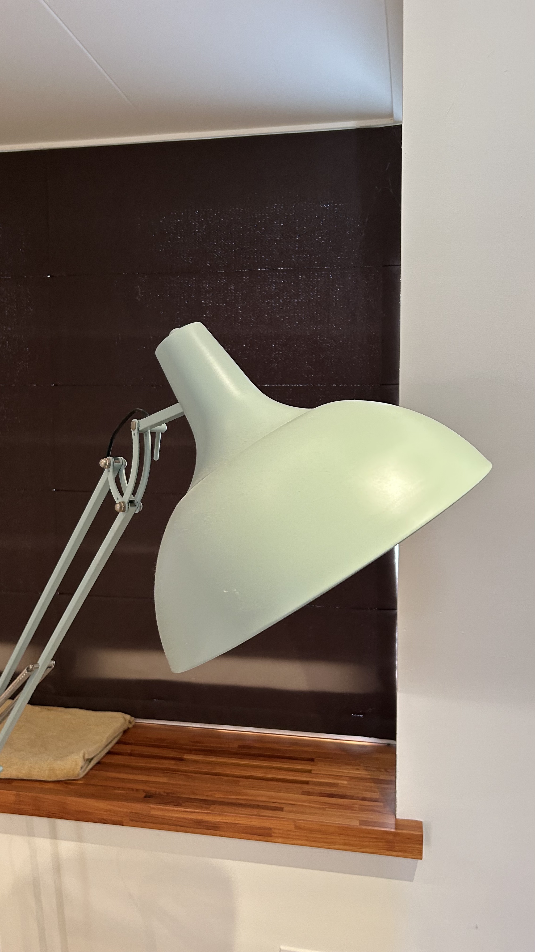 Light blue lamp with a shade, standing. You can adjust it higher or lower. Provides plenty of light.