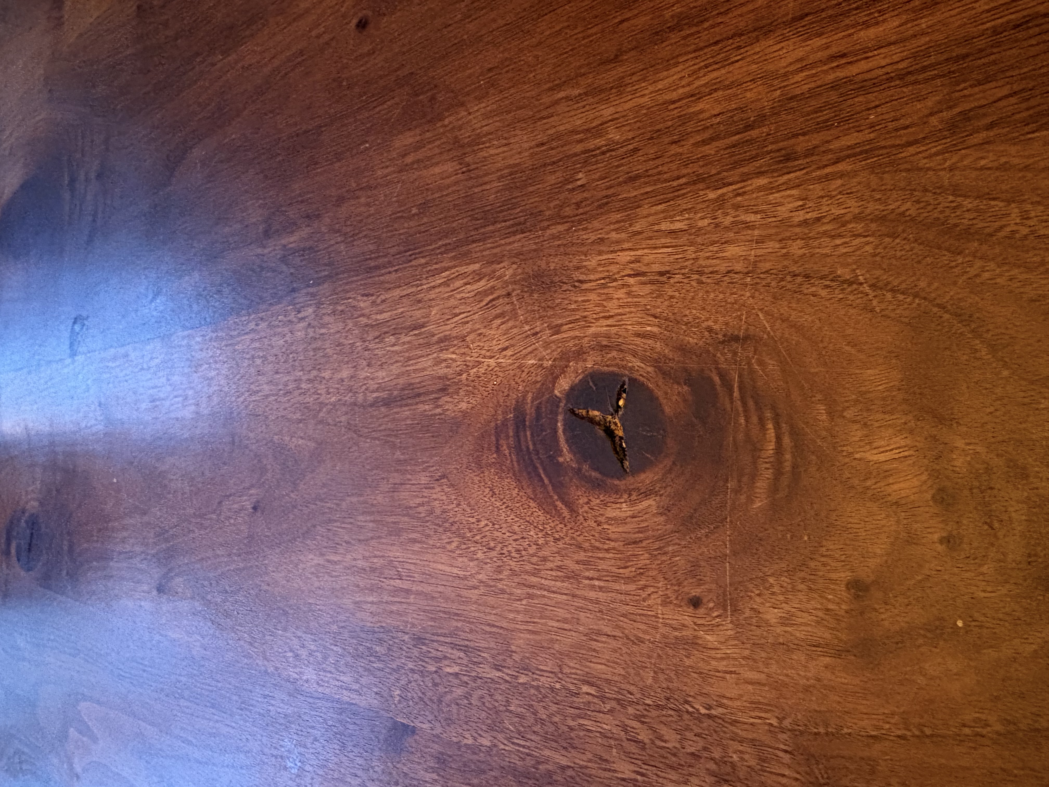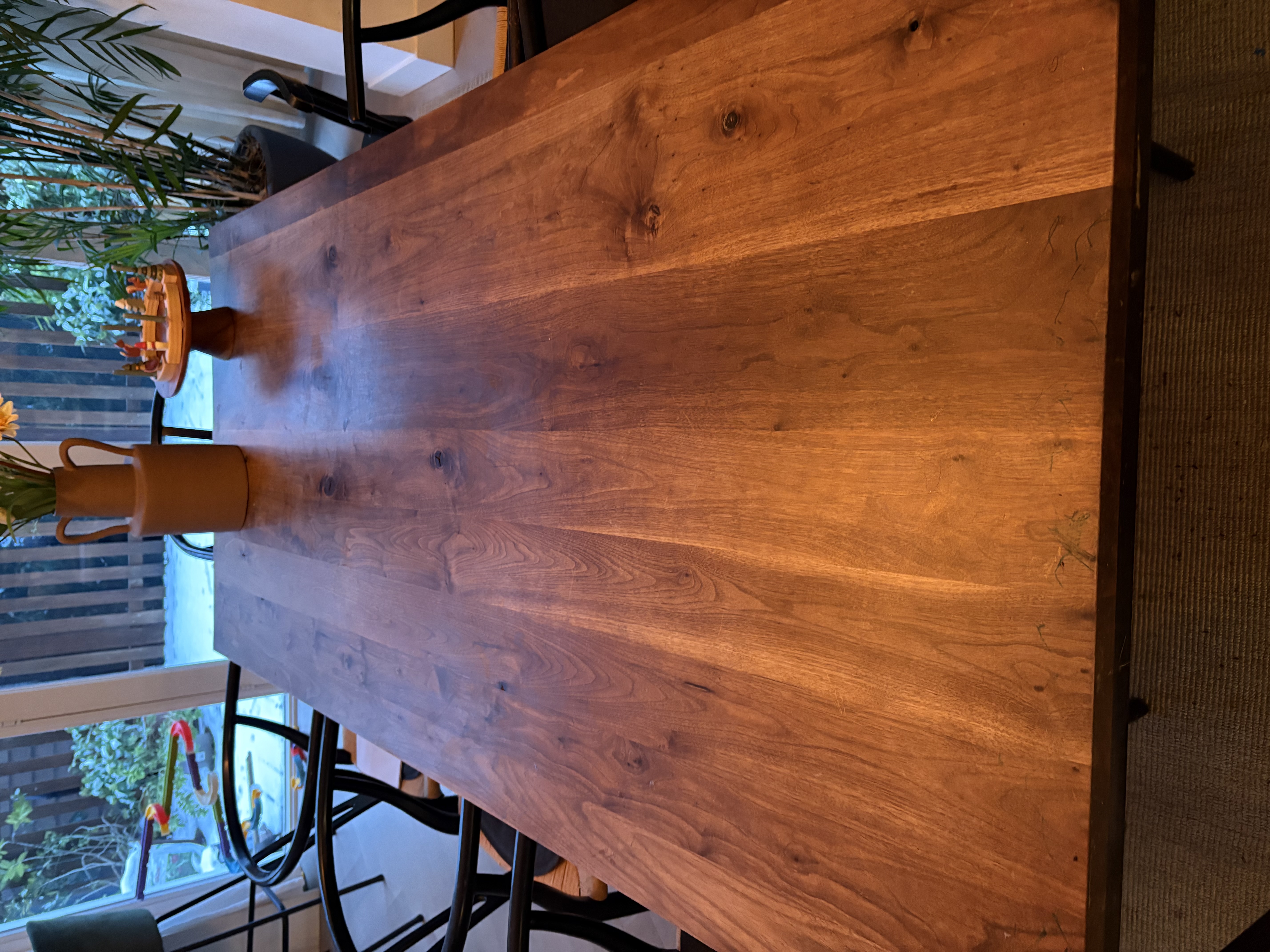 Wooden table with steal frame, with six chairs. Some of the chairs are a bit damaged. 1m by 1.10m Hight: 76 Pick-Up asap