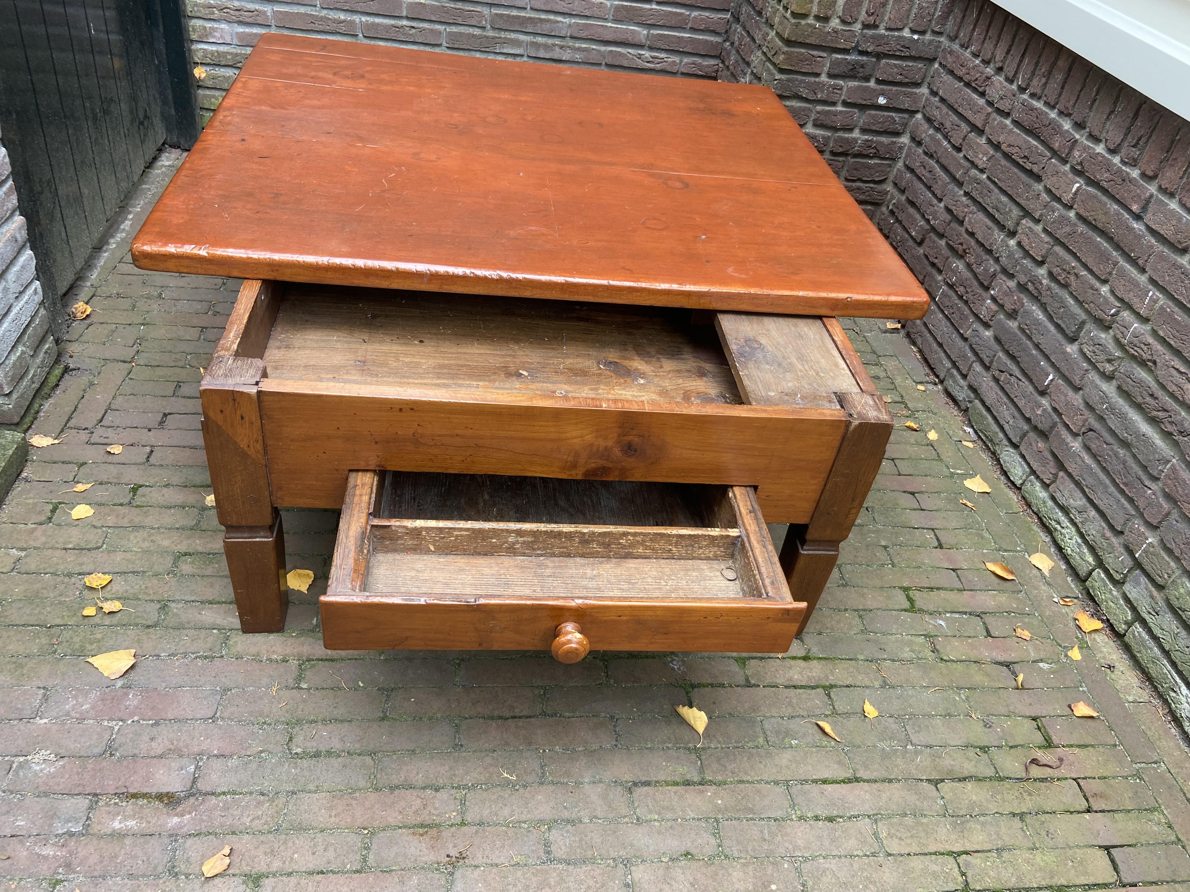 I have a spare oak table with two compartments. Dimensions: 100cm x 100cm.