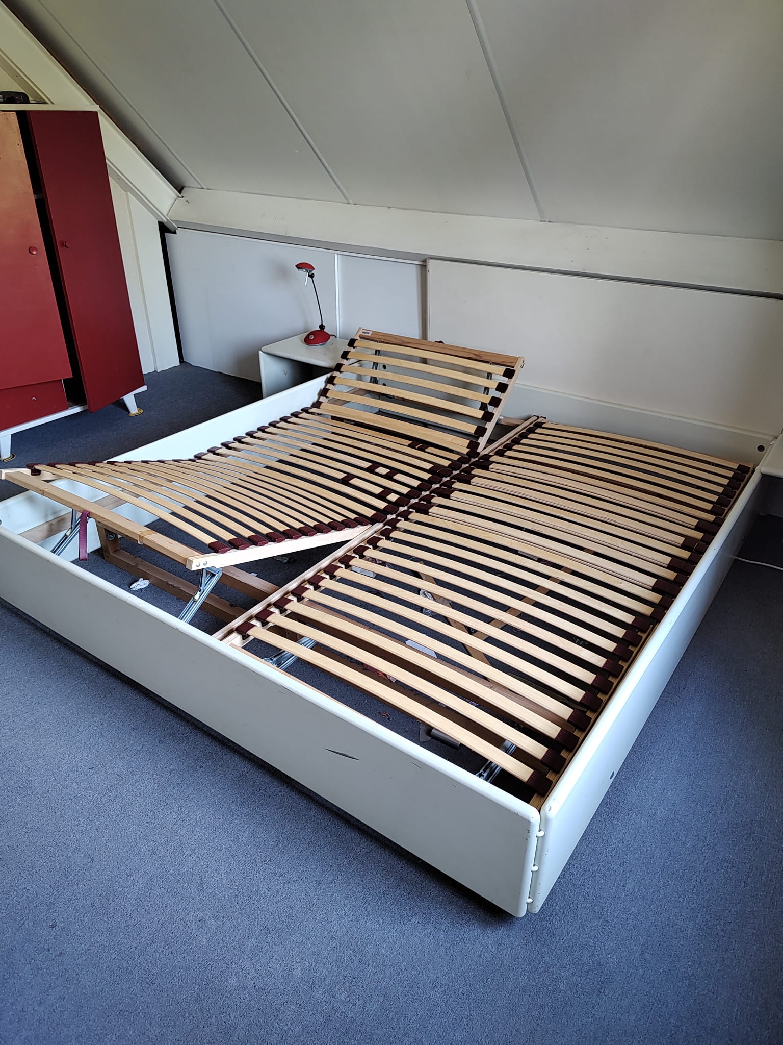Sturdy and modern bed frame (180x200 cm) with a movable shelf on both sides serving as a bedside table. Mattresses in good condition are also included. Slatted bases are manually adjustable at the head and foot ends. Available for pickup after October 12, 2025. Free delivery.