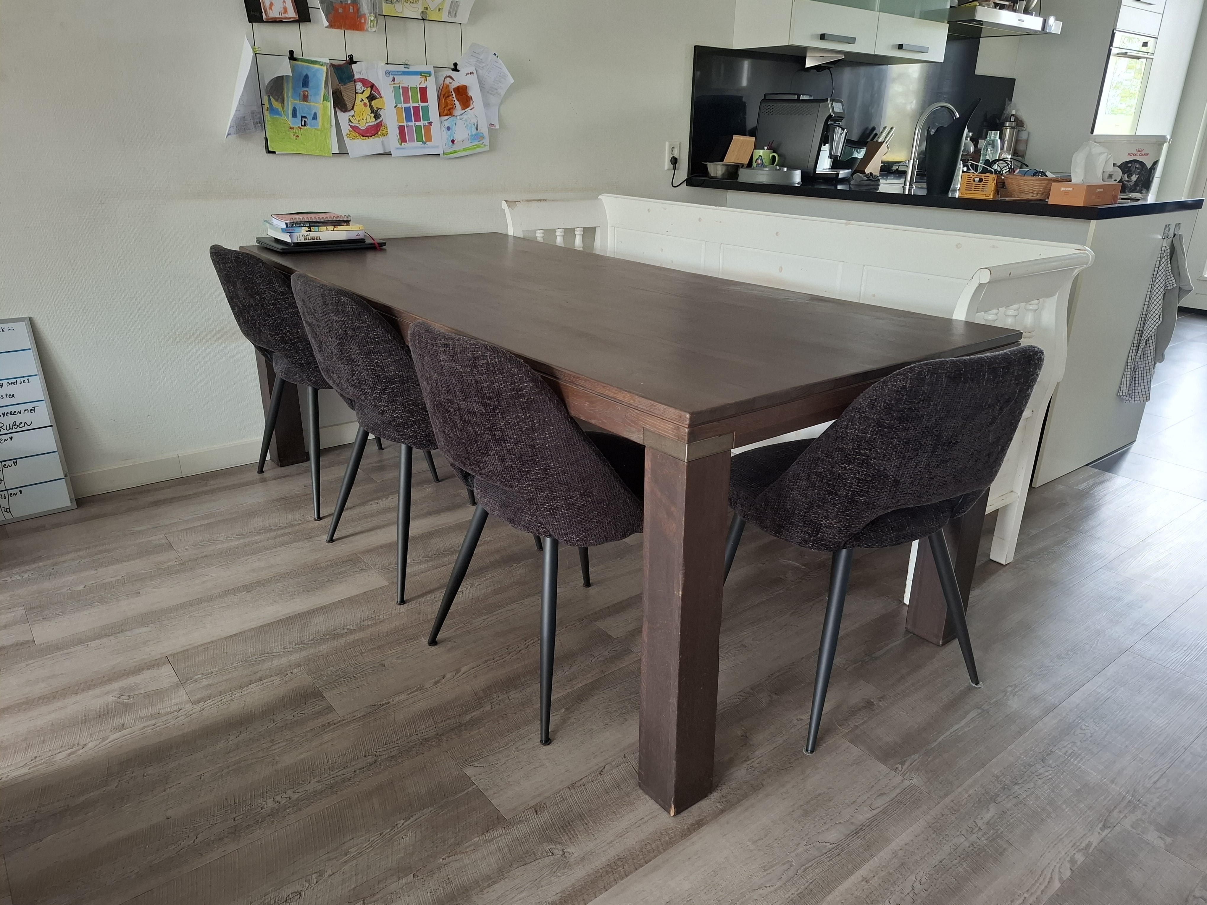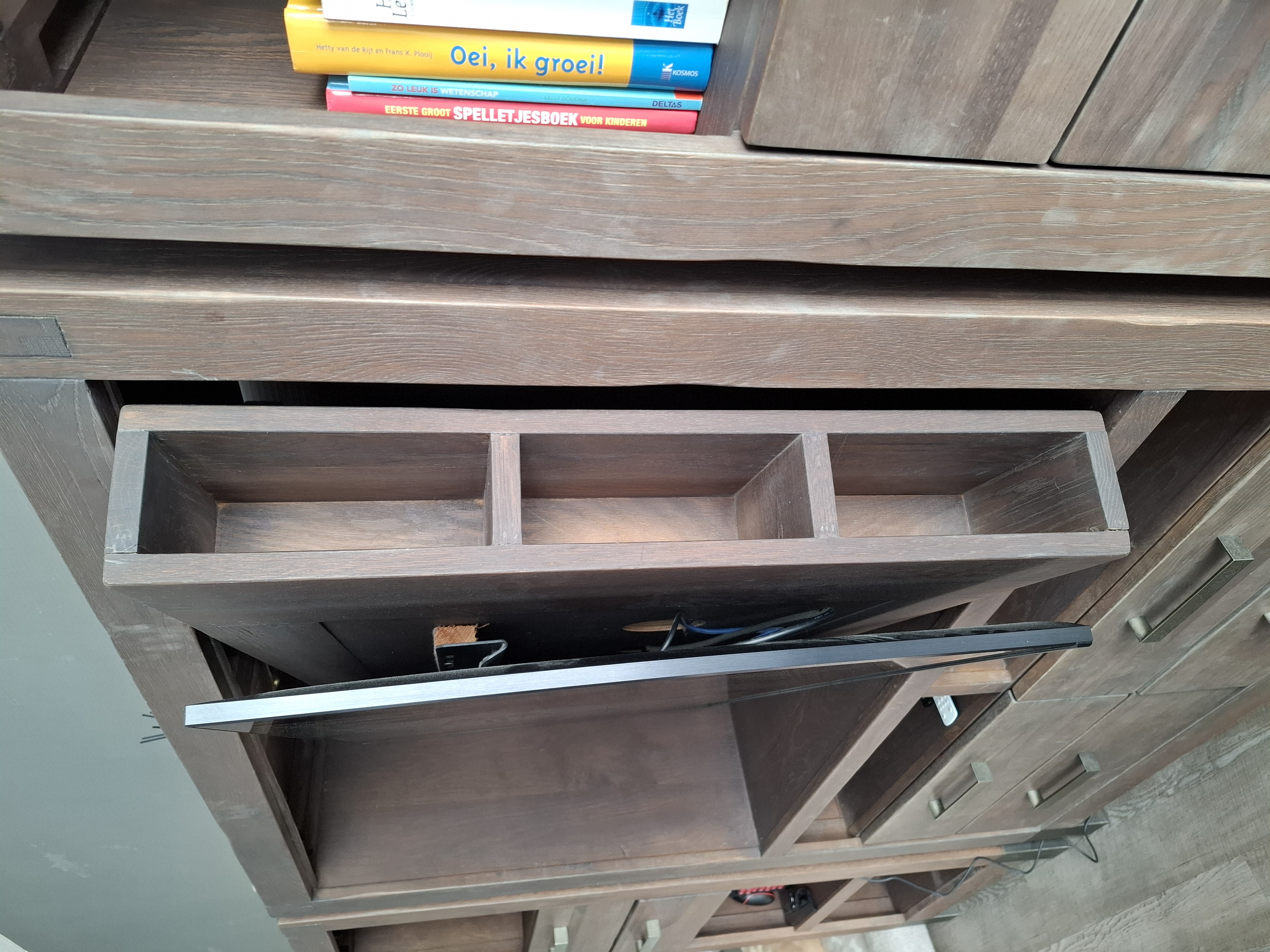 Dining table, sideboard, TV cabinet, bookcases and side table. Everything belongs together. Furniture is about 15 years old. They are solid oak furniture. Some signs of use here and there. Dimensions: Sideboard: 85cm high 1.90m wide 45cm deep Bookcase: 1.52m high 60cm wide 45cm deep TV cabinet: 1.52m high 1.30m wide 45cm deep TV that is currently in it Approximately 1.10m wide 64cm high Corner table: 60cm deep 60 cm wide 40 cm high Dining table: 77.5cm high 99cm wide 2.20m long Please pick up yourself. These are large pieces of furniture so a small trailer is not sufficient. Pick up preferably during the Christmas holidays.