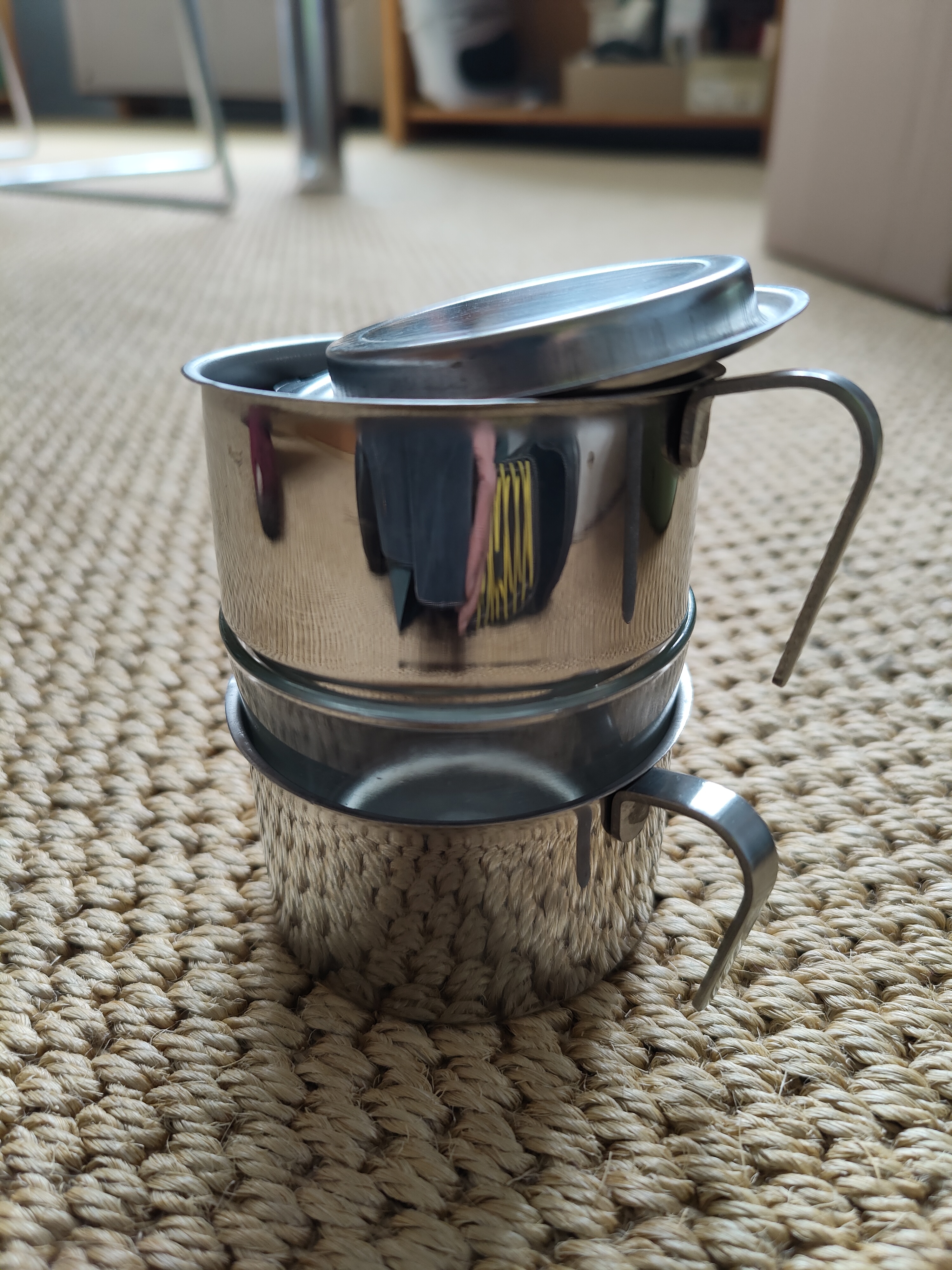 Cafetière filtre individuelle. Café moulu dans la partie supérieure, eau chaude par-dessus, et le café s'écoule dans le verre en bas. Retrait gratuit à Amsterdam. Possibilité d'ajouter une brique de café bio.