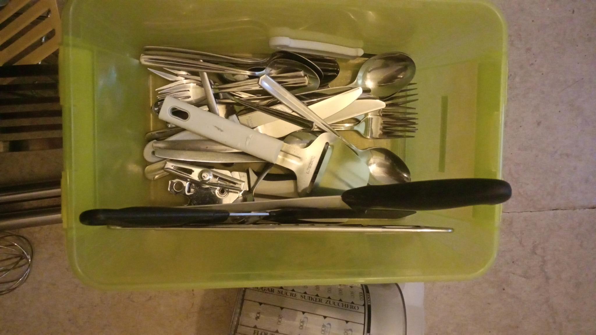 Plateau avec fourchettes, cuillères, couteaux, trancheuse à fromage, couteau à pain, couteau d'office et ouvre-boîte. À récupérer gratuitement à Amsterdam.