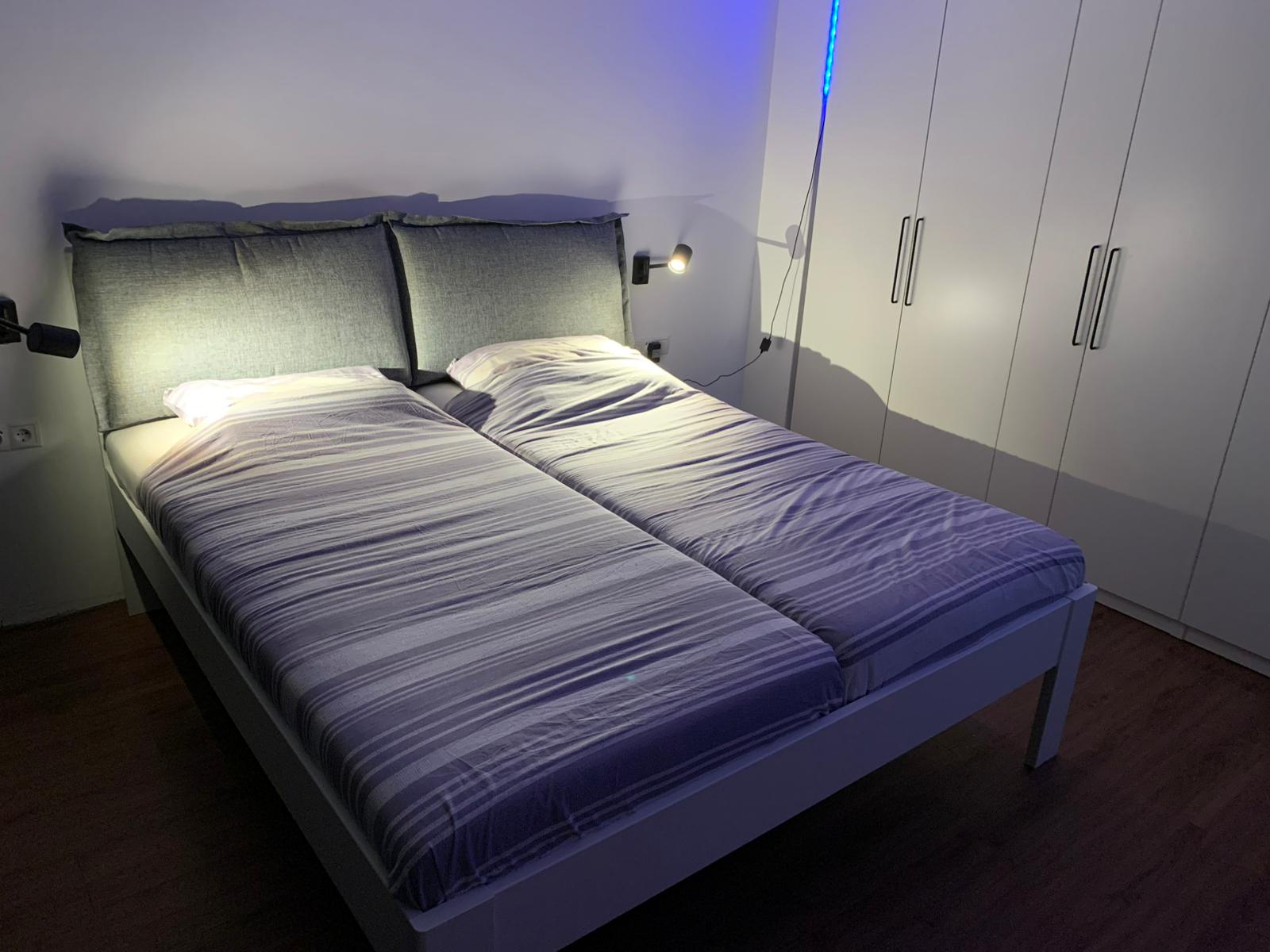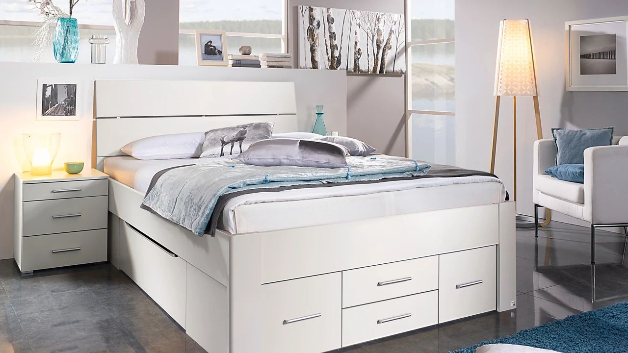 Lit double blanc (1,80 m x 2 m) avec tiroirs de rangement. Matelas non inclus. Deux tables de chevet blanches assorties sont également disponibles. La photo 1 montre le lit tel qu'il était vendu en magasin, mais le coussin moelleux sur la tête de lit n'est pas inclus. La photo 2 montre le lit monté, mais sans les tiroirs. Bien qu'ils soient inclus, nous n'avons pas pris de photo après leur installation. Le lit a 8 ans. Nous devons nous en séparer car nous n'en avons plus besoin maintenant que nous vivons ensemble.