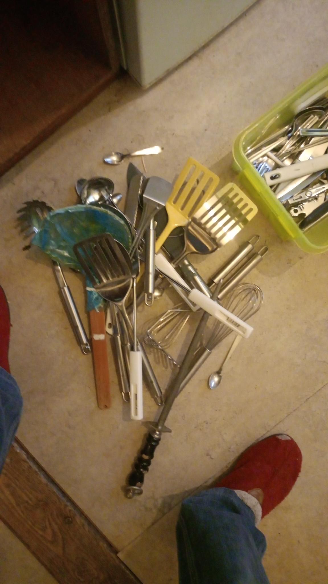 Ustensiles de cuisine divers : fouet, cuillère à spaghetti, écumoire en cuivre (emballée dans du plastique bleu), louche à sauce et cuillères à égoutter. À récupérer gratuitement à Amsterdam.