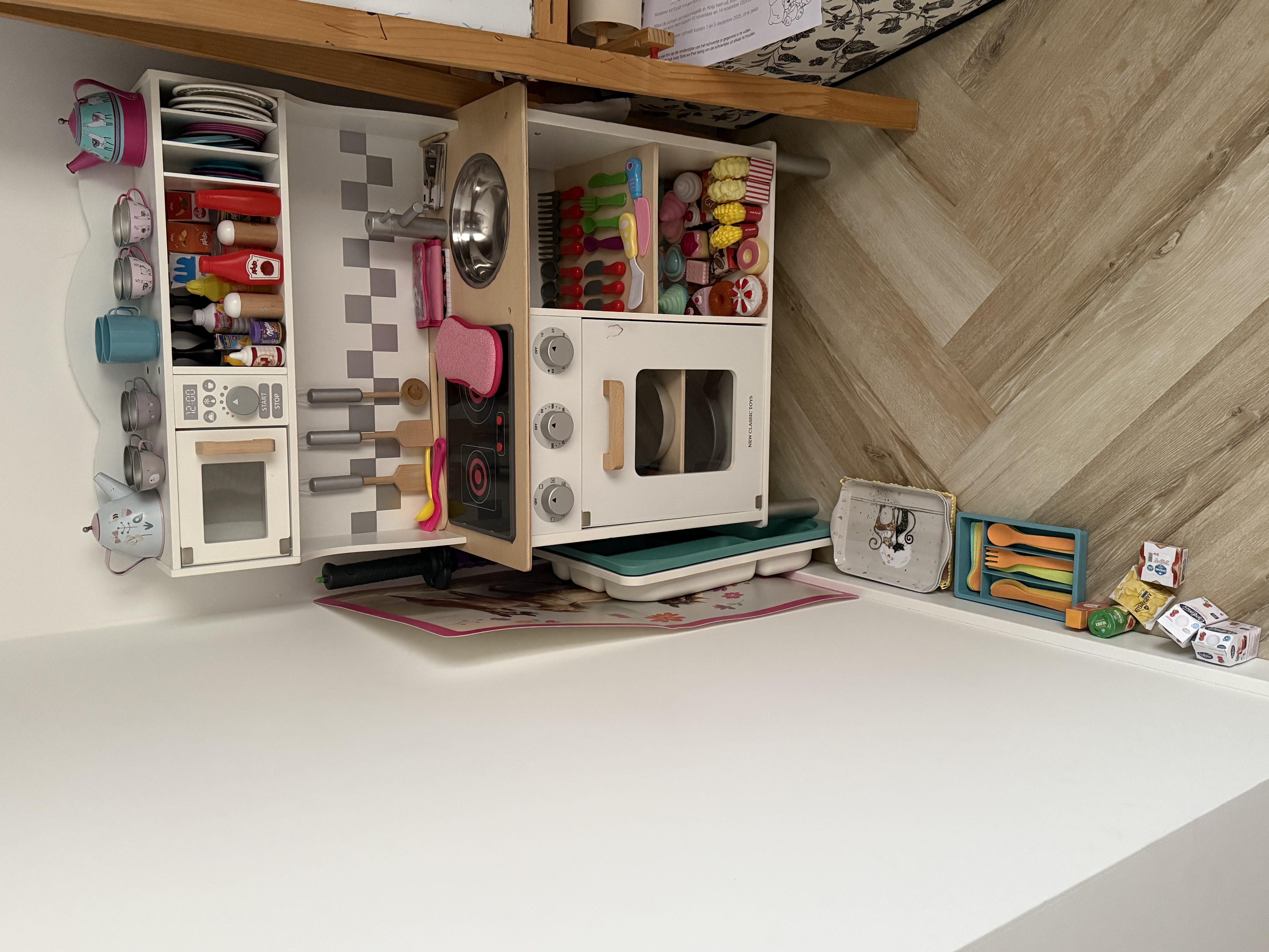 Cuisine miniature avec tous ses accessoires : fruits et légumes factices, vaisselle, couverts, casseroles, etc. En parfait état, ma fille en a toujours pris grand soin.