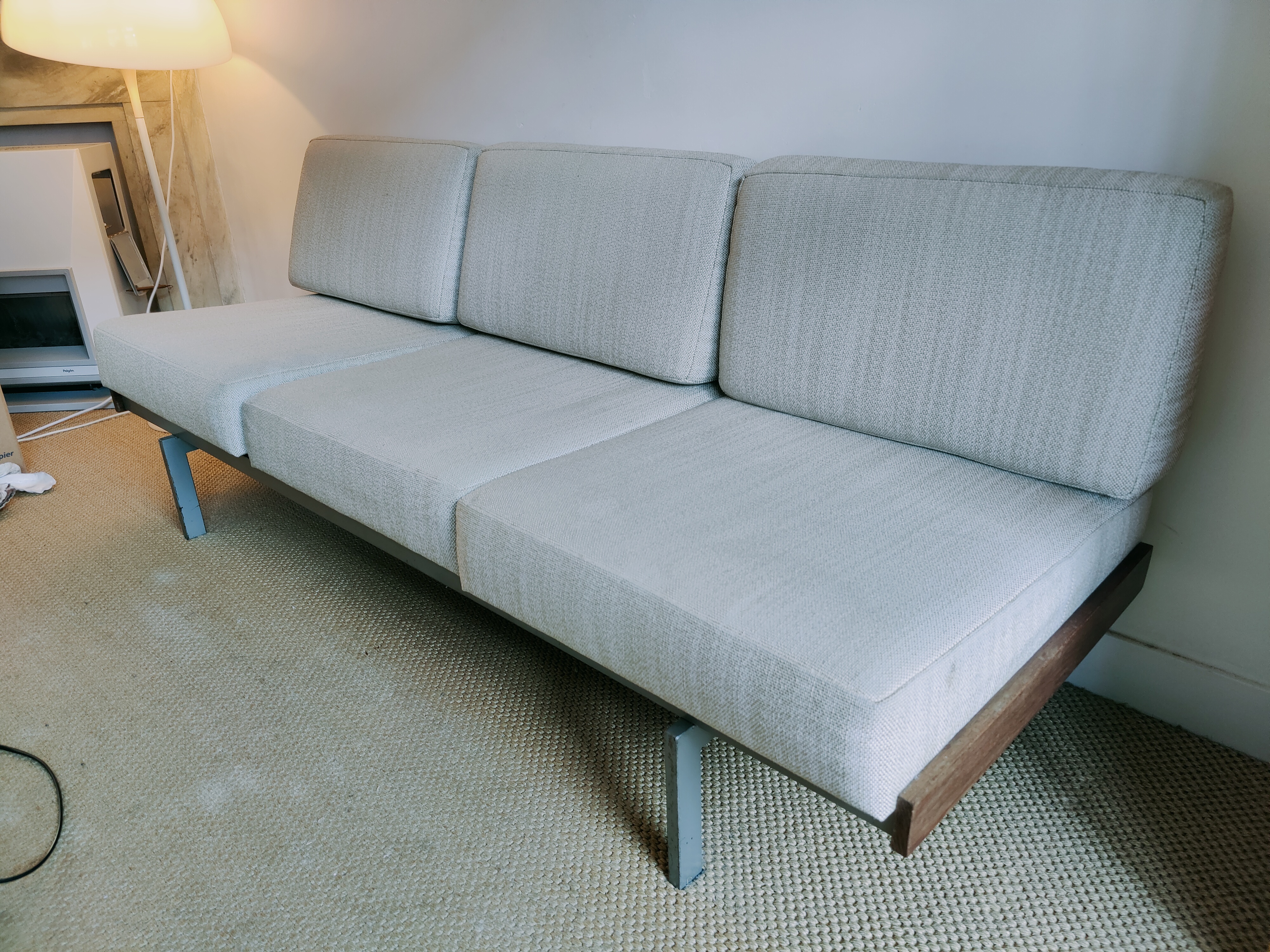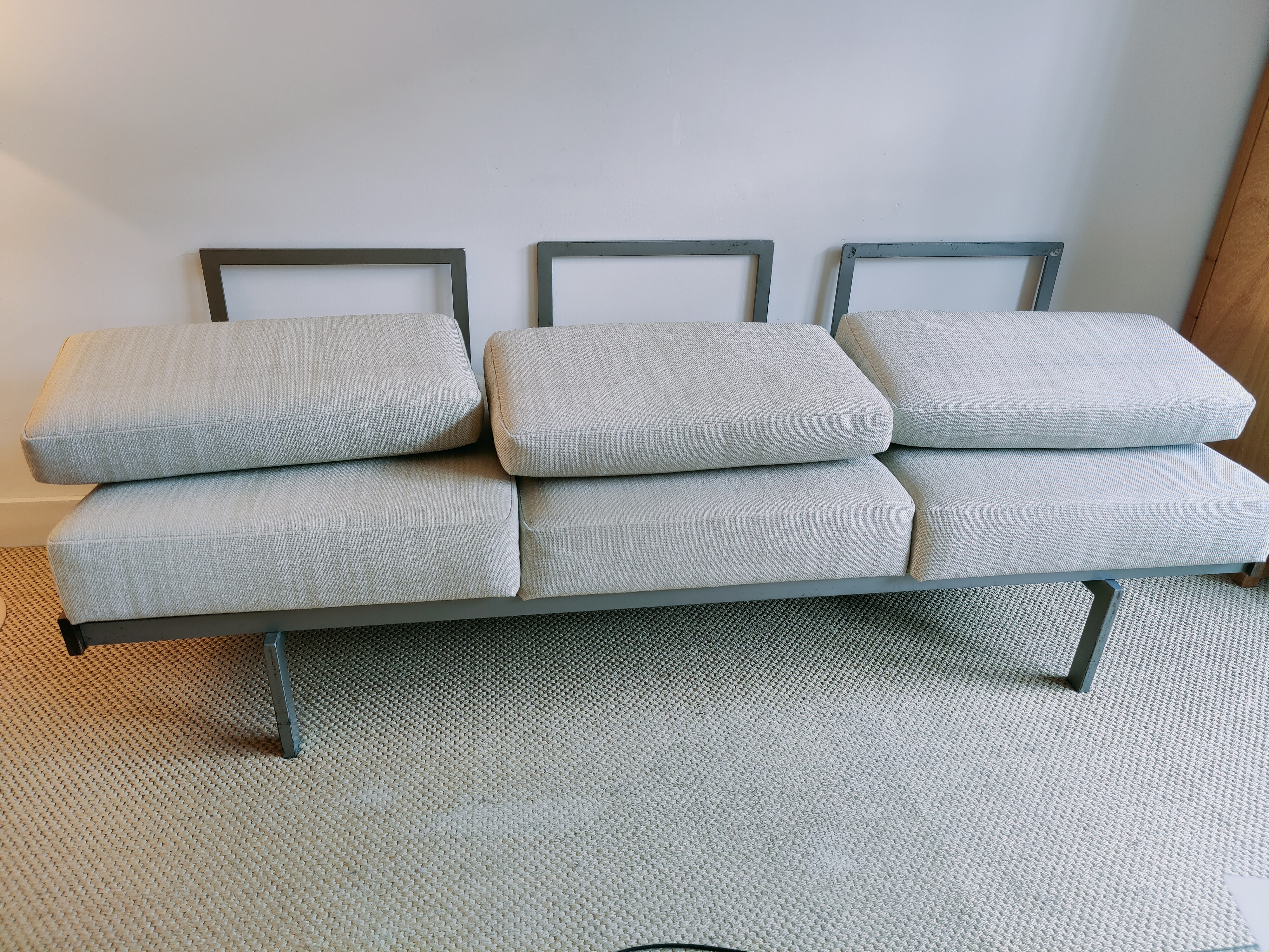3-zits bank. Metalen frame met wat gebruikssporen. De bank is opnieuw bekleed met stof. Gratis ophalen in Amsterdam In verband met overlijden moet het huis vóór 28 januari leeg.
