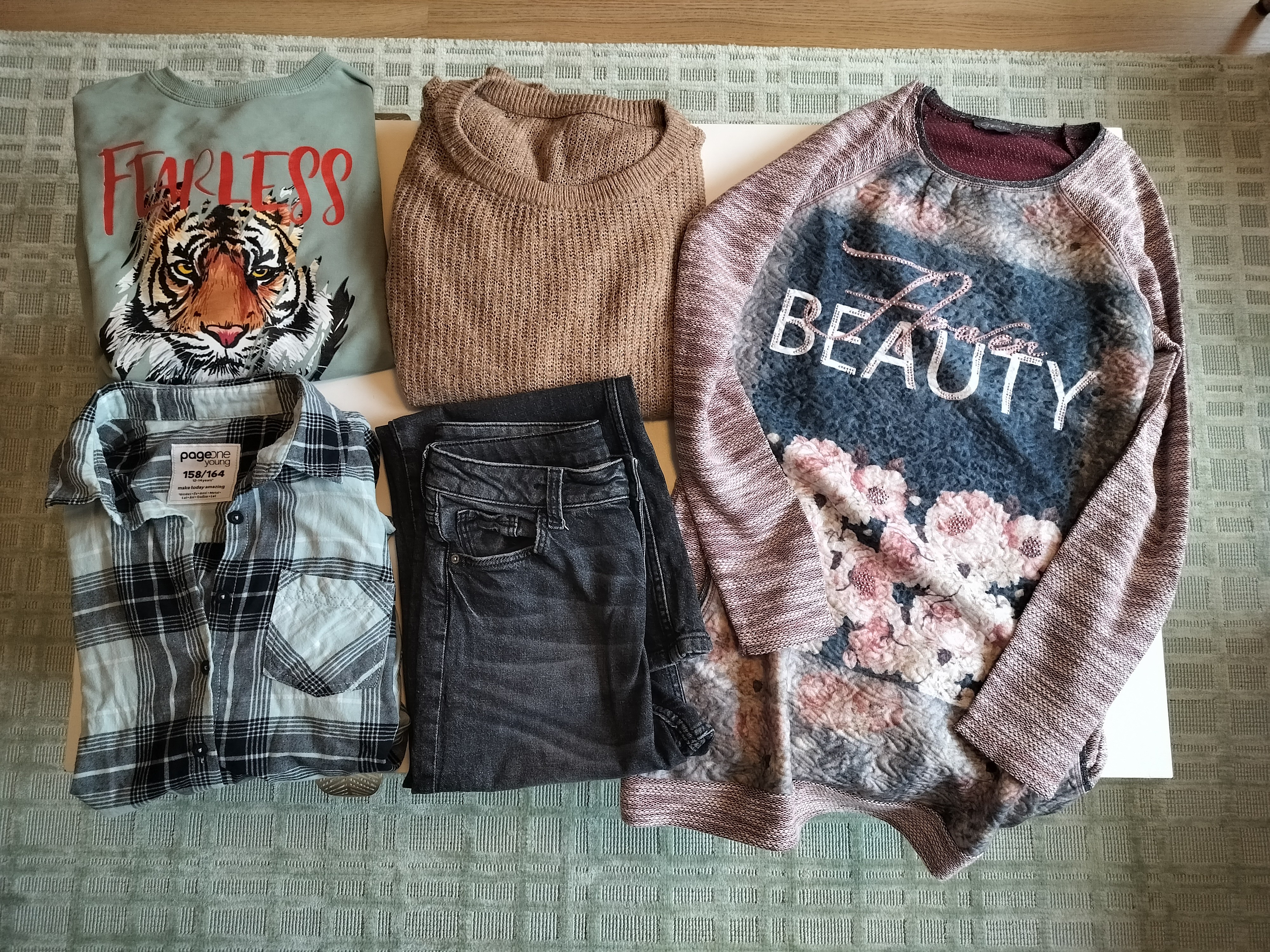 Kledingpakket voor tieners in maat 152 tm 164. Ook nog een mooie spijkerbroek voor jongens er in van Jack en Jones en een legergroene zomerjas. Deze 2 laatste artikelen staan niet op de foto.