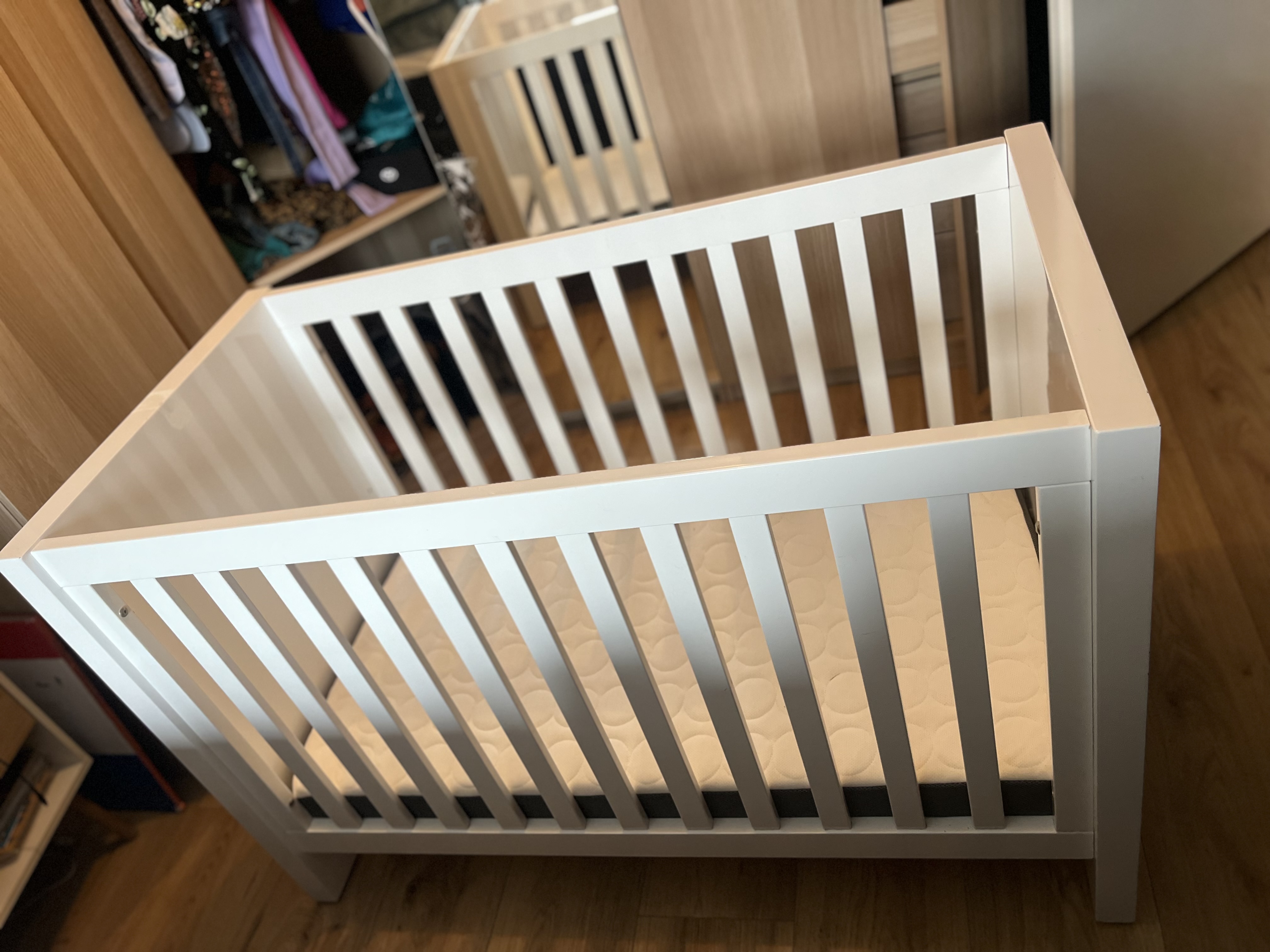 Mooi ledikantje wit hoogglans. Met matras en hoeslakens (o.a. waterdichte hoeslakens). Alles nog in erg goede staat! Op te halen in Utrecht Leidsche Rijn.