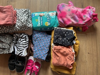 kledingpakket meisje maat 92-98 2 slaapzakken, 2 pyama's, ondergoed/rompers, jurken, feestjurk voor de kerstdagen, winterjas, truien, onesie, 2 paar schoenen, broeken, luiers maat 5