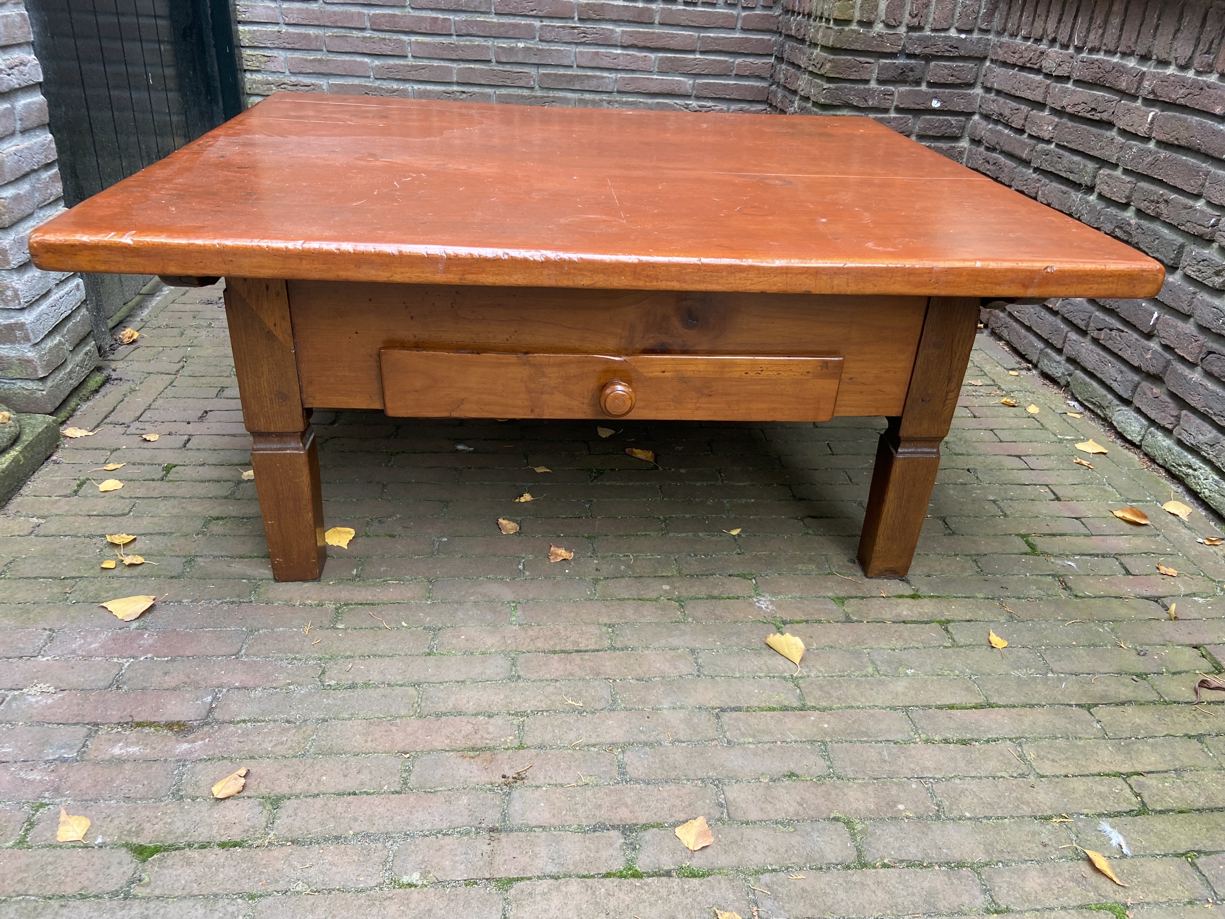Ik heb een eiken houten tafel over met 2 vakken. Maat: 100cmx100 cm Gratis