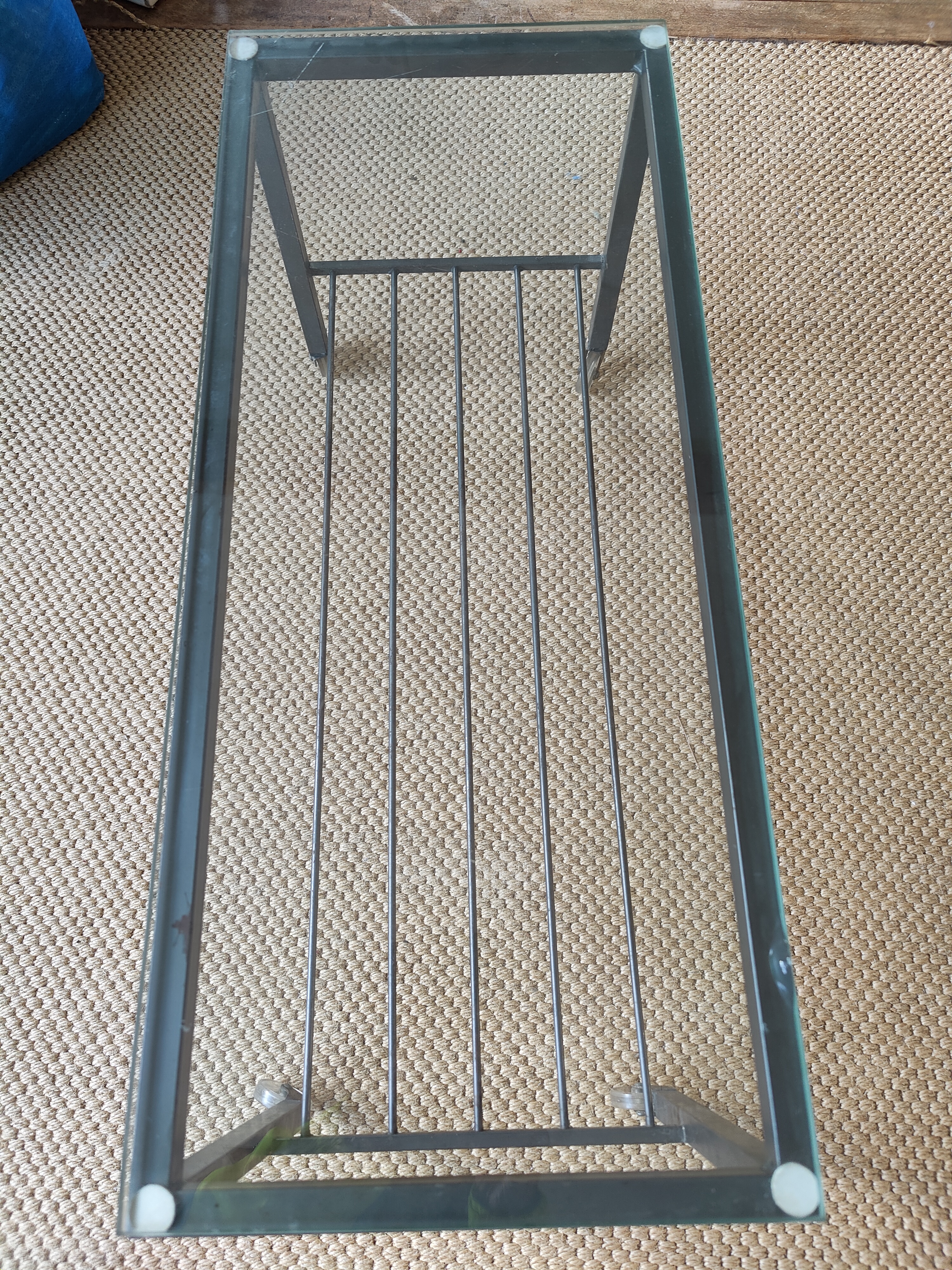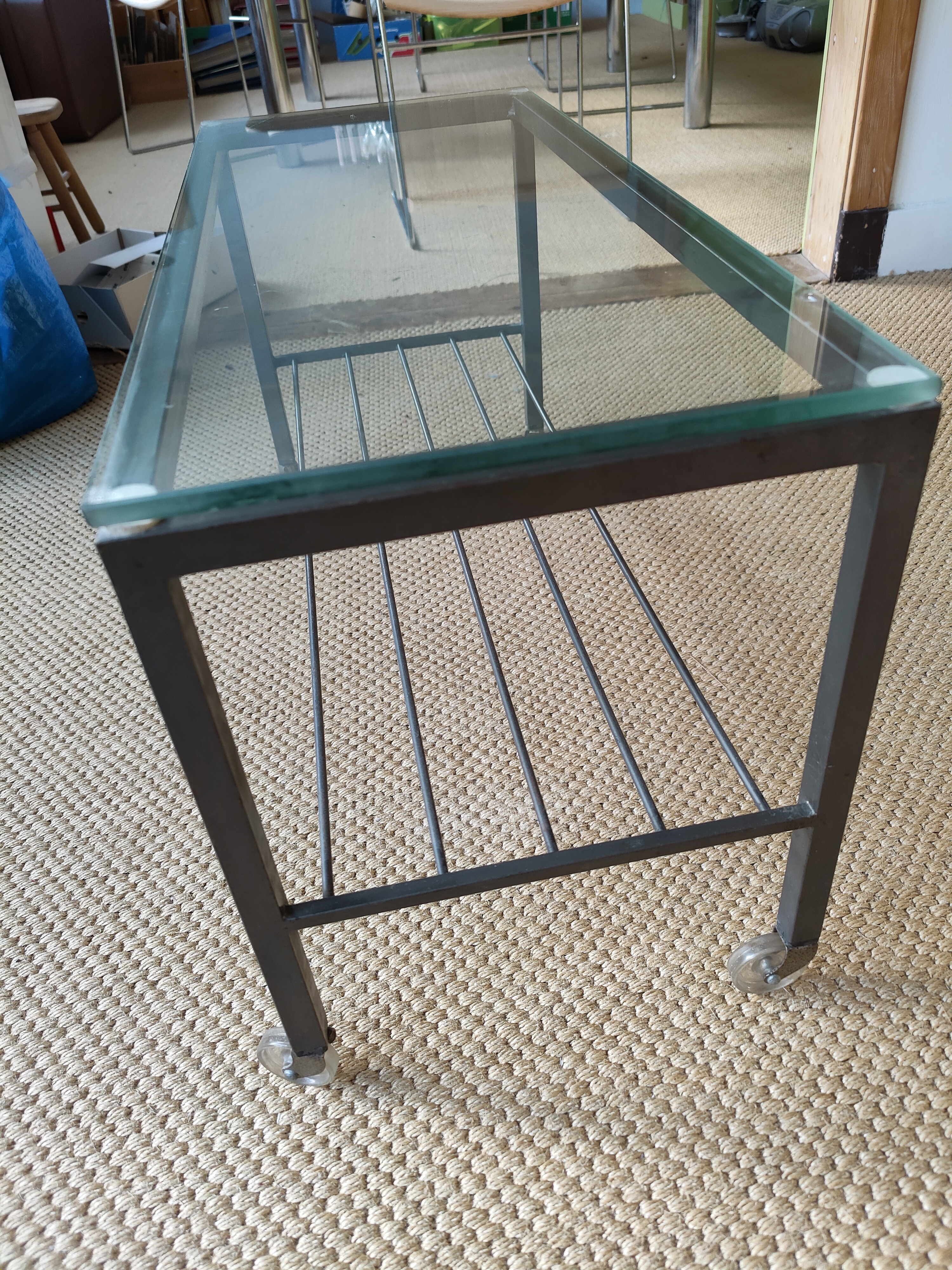 Приставной столик на колесиках: ширина 76 см, глубина 32 см, высота 42 см. Стальной каркас с толстой стеклянной столешницей. На нижнем крае стекла имеются незначительные повреждения. Самовывоз из Амстердама.